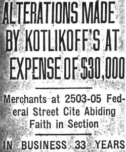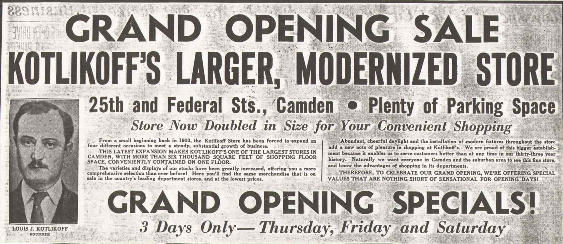 Louis Jacob Kotlikoff was born in Kiev, Russia in 1879. He came to America and married Clara Hager, another Jewish immigrant, shortly after the turn of the century. Louis Kotlikoff opened his first store at 2511 Federal Street with $250, and the young couple lived in the apartment over the store. Their first child, Tanfield, was born in 1907 and Harold was born two years later. The business had prospered, and had already moved to 2507 Federal Street, when in 1912, the Kotlikoffs purchased 2509 Federal Street and doubled the size of their store. A third son, Albert, was born in 1915. In 1923 the Kotlikoff store was moved to 2503 Federal Street, where it remained open until 1981. Louis Kotlikoff passed away in Camden in 1933, and the store was run by his widow and three sons.