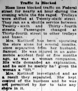 The decline in the economic fortunes of Camden and its residents hurt the store. Renewed optimism in the 1970s was dashed when Mayor Angelo Errichetti left office after the ABSCAM trial. The city lost a planned Veterans Administration Hospital and whatever momentum the city had gained was lost. On October 27, 1981, Kotlikoff's was burglarized three times in one day…the second and third times after thieves pried away the plywood that covered plate glass windows shattered by hurled cinder blocks. Five months later, Kotlikoff's closed its doors forever. The building was the site of a thrift store in the early 1980s, run by Goodwill Industries. In the 1990s the building was divided, and presently houses three retail business. It is long forgotten, but at one time there was another Kotlikoff Department Store in Camden. This business was at 3404-06 Federal Street. This store was founded by Samuel Kotlikoff, and operated by his wife after their separation in 1927. Son David was operating the business as late as 1947, when it was known as the Rosedale Department Store. This business had closed by 1956. |