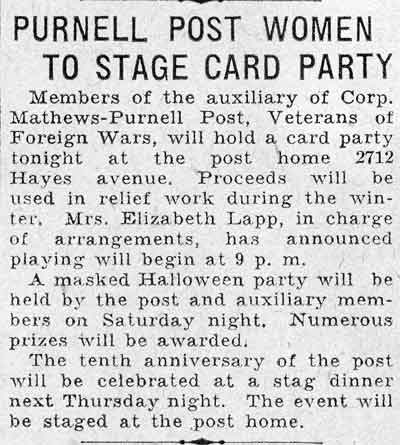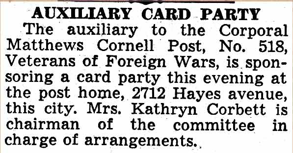 CORPORAL MATHEWS-PURNELL Ladies Auxilary, Post 518, Veterans of Foreign Wars, will conduct a monthly card party next Wednesday evening at the post home, 2712 Hayes Avenue. Mrs. Theresa Mungioli and Mrs. Carrie Bean are co-chairmen of the committee, other members of which follow: Mrs. Victoria Nicktern, Mrs. Mary Clifford, Mrs. Betty Horner, Mrs. Beatrice Fredericks, Mrs. Esther Rowand, Mrs. Edna Weaver, Mrs. Margaret Worrell, Mrs. Millie Petit, Mrs. Anna Mathews, Mrs. Etta Papaycik, Mrs. Phil Frati and Mrs. Elizabeth Knaub. |