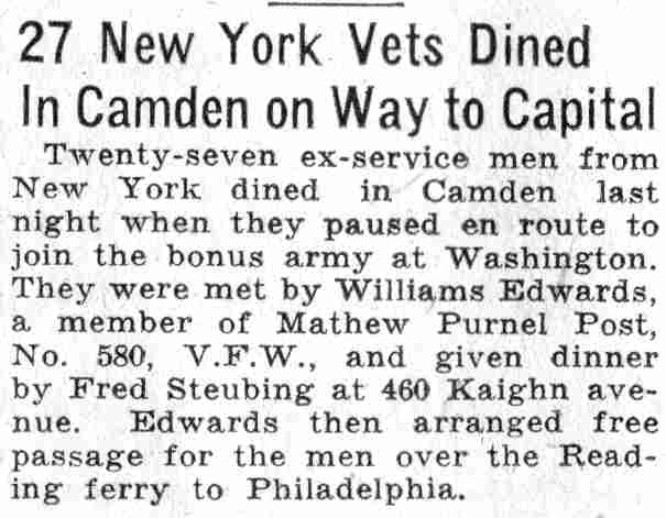 Job Preference Victor Reviews Program of Contest The Philadelphia veteran of the World War who was responsible for obtaining a court ruling safeguarding veterans rights for preference on Federal employment projects, last night told his story to Camden ex-service men. More than 200 veterans heard Benjamin J. Spang address an open meeting of Corp. Mathews-Purnell Post No. 518, Veterans of Foreign Wars. The test case brought by Spang was decided last week by Federal Judge George A. Welsh in Philadelphia. Today, Judge Welsh announced, he will sign a decree to carry out the ruling. Spang told the veterans he fought for two years to obtain preference for veterans and that he fought alone, despite charges he was allied with the Economy League and the Liberty League. It was decided to take action tonight to endorse Spang's move at a meeting of the Camden County Council, V. F. W., at the headquarters of A. Mucci Post, third and Line Street . Ten posts are represented in the county council. The only veteran ever to have brought a test case against the government, Spang has received nation wide acclaim. He is 42, and lives at 548 South Fifty-second Street, Phila delphia. Refused Relief Job He went to court after he was refused a job with the Business Census Bureau because his name did not appear on the public relief rolls. "All I want is a job," he stated after winning his suit. "When the Government decides to live up to the Veterans' Preference Act, then I'll withdraw my suit against them, not I before. We'll go right on to the Supreme Court if necessary," he said. Spang served three enlistments in the Marine Corps, was wounded in the Belleau Wood in 1918, was discharged from an army hospital and returned home to find a gold star in the window because his mother thought he had been killed. Then he re-enlisted in the Marines and was assigned to recruiting work as a sergeant. Doctors sent him to the Poconos for a chest condition. Then he returned to Philadelphia and entered Temple University as a student under the Veterans' Rehabilitation Administration. He was graduated in 1923 in commercial law and real estate. While at Temple he met H. Eugene Gardner, attorney who successfully presented Spang's side of the case to the court. His disability allowance of $42 a month was cut to $10 and during CWA he was unable to get a job and was appointed a committee of one to investigate the failure of veterans to receive appointments. He worked with the Federal Housing Administration until June 19, 1935 as a senior investigator, then he was fired and has not worked since. "Since then I have conferred with all the officials of the various agencies in Philadelphia, Harrisburg and Washington but could get no satisfaction. Then I hunted up Gardner and we decided to enter suit," he said. His financial backer, he says is Henry Asher, proprietor of a cigar and variety store at 5211 Market Street, Philadelphia. Spang has two children for whom he keeps house, his wife being dead. They are Benjamin, 16, and Mary Ellen, 13. Both attend school. Daniel Conner, Seventh District councilman, said veterans in South Jersey are able to obtain fairer treatment than those in Pennsylvania because they are more strongly organized. Thomas J. "Reds" Donlon, who led the bonus march from Camden to Washington, asked Spang whether those veterans who obtain their bonus payments would be taken off relief. Spang declared he hoped they would not be discriminated against and that Judge Welsh's decision was looked for to answer that question. Sergeant Ray Smith , Camden veteran, who also addressed the group declared fairness was one of the qualities the veterans should insist on. He said he was angered by the fact that on driving down Broadway, where workers were clearing the streets of ice, most of these working with picks and shovels appeared to be undernourished, while others were standing by waving flags to let the cars by. "The flag-wavers should take their turns at the shovels," Smith declared. Allen Kline was chairman of the meeting. . |
