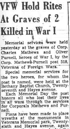 The Corporal Mathews-Purnell Post 518, Veterans of Foreign Wars was named for two young men from Camden NJ, Corporal Charles Albert Mathews and Private Oliver R, Purnell , who were killed while serving with the American Expeditionary Force in France during World War I. The post was founded in October 29, 1921. The Post's home for many years was at 2712 Hayes Avenue, in the heart of Cramer Hill. The Post was quite active, and was involved in veterans, social, and civic affairs in Cramer Hill and throughout the city and county. Prominent members of the Post included Howard Bean, who served a term as commander of the post in in 1940-41 was the commander of the Department of New Jersey of the VFW. His wife Carrie Bean, was equally as prominent in the V.F.W. Ladies Auxiliary, and was elected to lead the Department of New Jersey's Ladies Auxiliary, as was Theresa Mungioli. Victoria Nicktern was also a very active member, and was the posts Ladies Auxiliary president in 1951. |