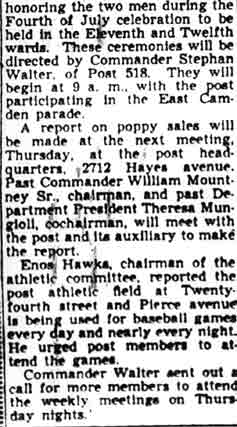 GOLD STAR MOTHERS TO ATTEND FOREIGN WAR VETERAN�S BALL Gold Star Mothers will be the honor guests at the first annual military ball of the Camden Post, No. 980, Veterans of Foreign Wars, to be held on Friday evening, February 3, in the Elks ballroom, Seventh and Cooper Streets . Elaborate plans for this ball are under the chairmanship of John S. Pennington. Invitations have been issued for patrons and patronesses and the list will be announced early next week. Gold Star Mothers to attend the affair are Mrs. C. Alberger, Mrs. Harriett Ablett, Mrs. Laura Brown. Mrs. A. Crangel, Mrs. A. Cassidy, Mrs. R. Dilks, Mrs. Kate Geist, Mrs. M. Griffen, Mrs. Horace B. Keebler, Mrs. H. Kirk, Mrs. Ross Leahy, Mrs. M. A. Matson, Mrs. M. McGuckin, Mrs. mary martin, mrs. M. Matthews, Mrs. Cooling Pond, Mrs. Oliver Powell*, Mrs. Mary Pennington, Mrs. C. Rolk, Mrs. E. Simons, Mrs. Mary Schucker, Mrs. Margaret Steigerwald, Mrs. Annie Taylor, Mrs. M. Osborn, Mrs. Mary Keegan, Mrs. Anna Kennedy, Mrs. t.c. young and Mrs. Walters. Assisting Mr. Pennington in planning this ball are John Rouh, James W. Connor, Charles Bozian, Robert MacMahon, Edward Watson, David Lukoff, Harry Laxton, Edward A. Stark, George Jones, William V. Long, Joseph Keefe, Charles Blank sad Marvel Passwater . * Newspaper error- Mrs. Oliver Powell was actually Mrs. Oliver Purnell |