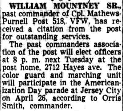Officers New officers of the ladies auxiliary of the Corporal Matthews-Purnell Post 518, VFW, will be installed at the post home, 2712 Hayes Avenue, Thursday night. Mrs. Theresa Mungioli, past department president, will act as conductress and install the following: Mrs. Victoria Nicktern, president; Mrs. Mary Clifford and Mrs. Betty Horner, vice presidents; Mrs. Carrie Bean, treasurer; Mrs. Ruth Ibe, secretary; Mrs. Etta Popaycik, chaplain; Mrs. Filomena Frati, conductress; Mrs. Anna Mathews, guard; Mrs. Alberta Mulford, trustee. Delegates to the district are Mrs. Beatrice Fredericks, Mrs. Edna Weaver, Mrs. Ella Gaunt, Mrs. Horner and Mrs. Mulford. Alternates are Mrs. Margaret Worrell, Mrs. Edna Flanagan, Mrs. Ella Hasher, Mrs. Anna Messick, Mrs. Frati and Mrs. Mathews. Mrs. Bean and Mrs. Mungioli helped install a new auxiliary at the Collingswood VFW post last Wednesday. Thursday the Matthew-Purnell auxiliary held a dinner at Kenney's honoring Department President Mrs. Carrie. |