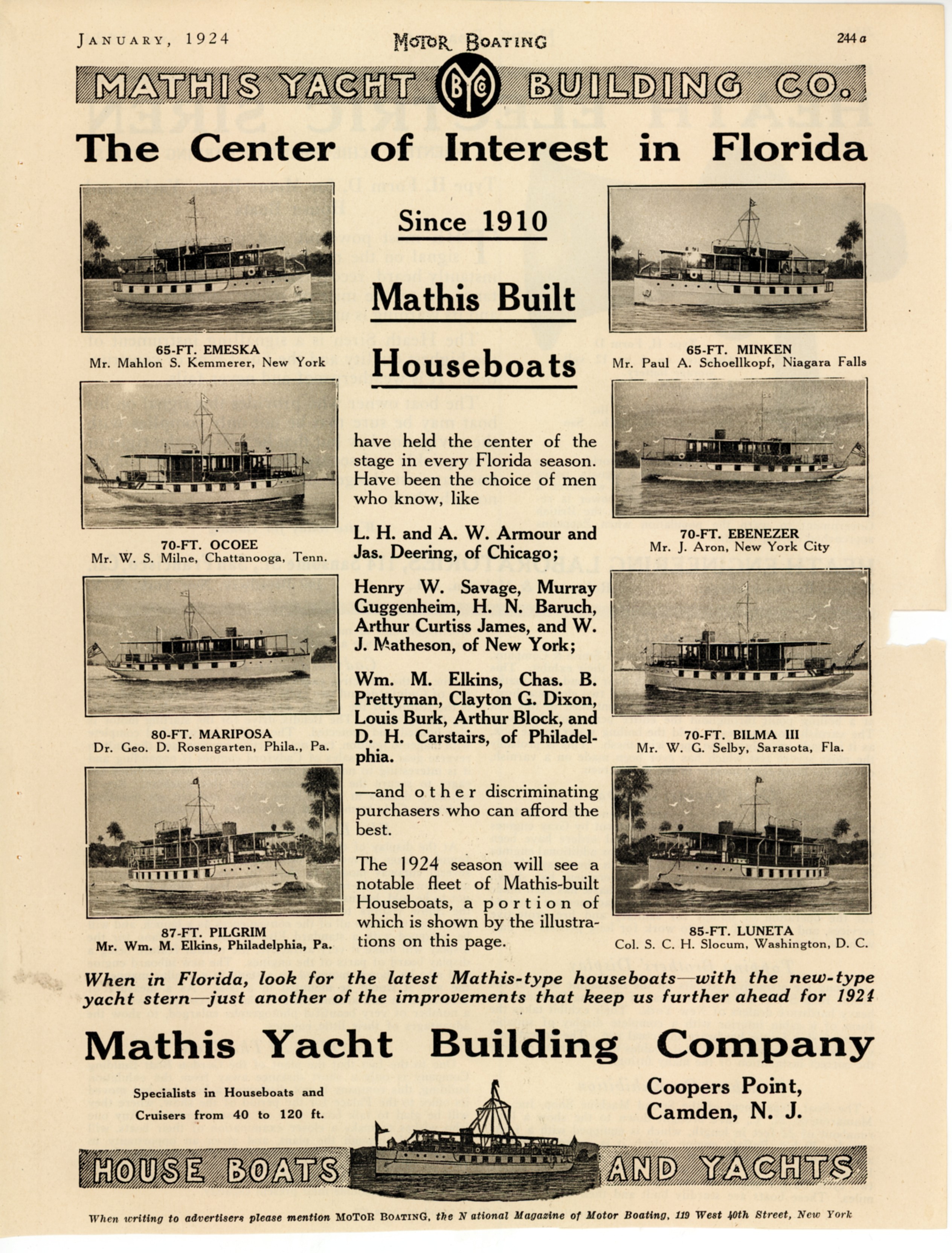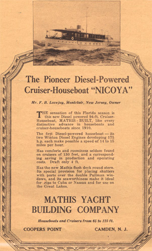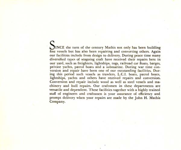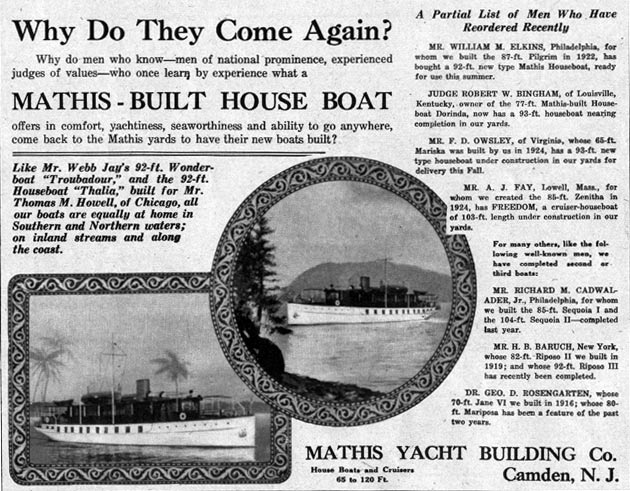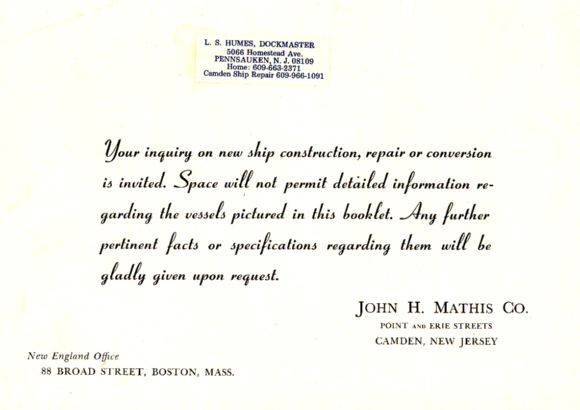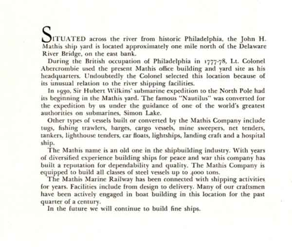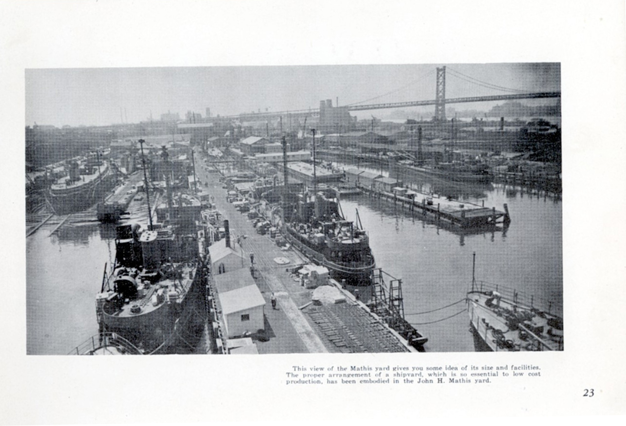 The John H. Mathis shipyard at Point & Erie Streets in Camden was known far and wide for its yachts and also produced ships for the Navy and Coast Guard. Famed yacht designer John Trumpy began building yachts at the Mathis yard in 1910, and remained there until he opened his own shipyard up in Maryland. During World War II a variety of ships were built, including minesweepers, transports, Coast Guard cutters, and ferries, among others. The Mathis Shipyard closed in the 1960s. The Mathis Shipyard was later used by a firm called Camden Ship Repair. One Mathis built ship, the Navy Ferry YFB-83, completed in April of 1949, remains in with the Navy today. Stationed in Hawaii. She is capable of ferrying 135 tons of cargo, and is used to shuttle personnel and equipment between Ford Island and the Mainland. Another notable Mathis-built ship is the USS Sequoia AG-23, which served as a Presidential Yacht for Herbert Hoover and remained in naval service until 1977. |