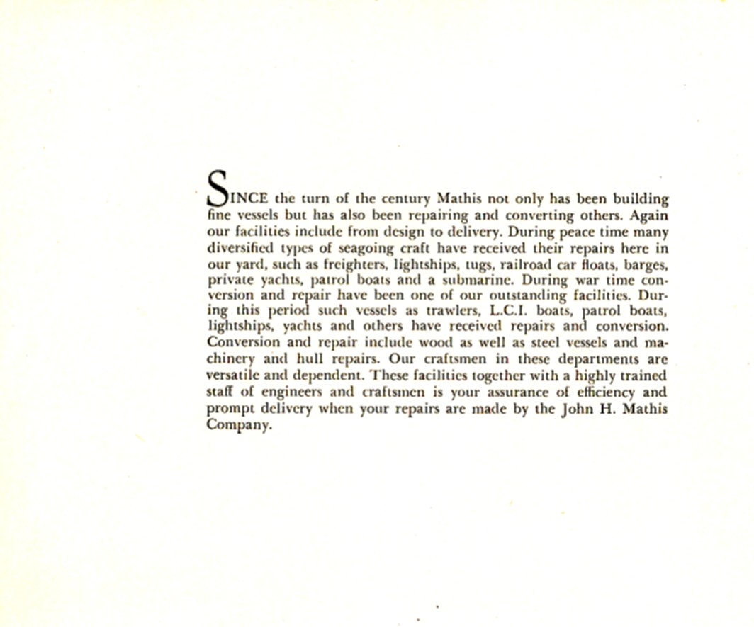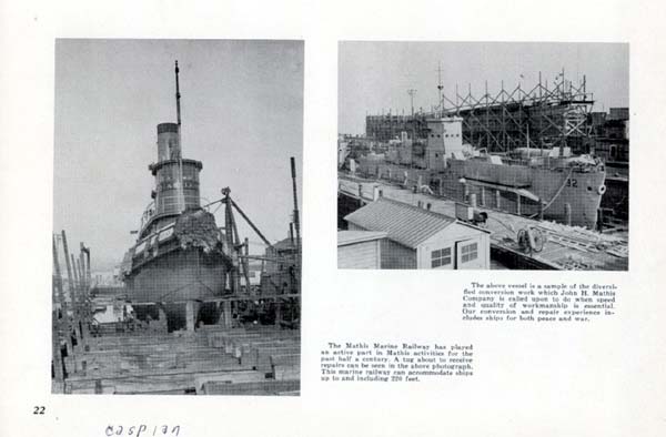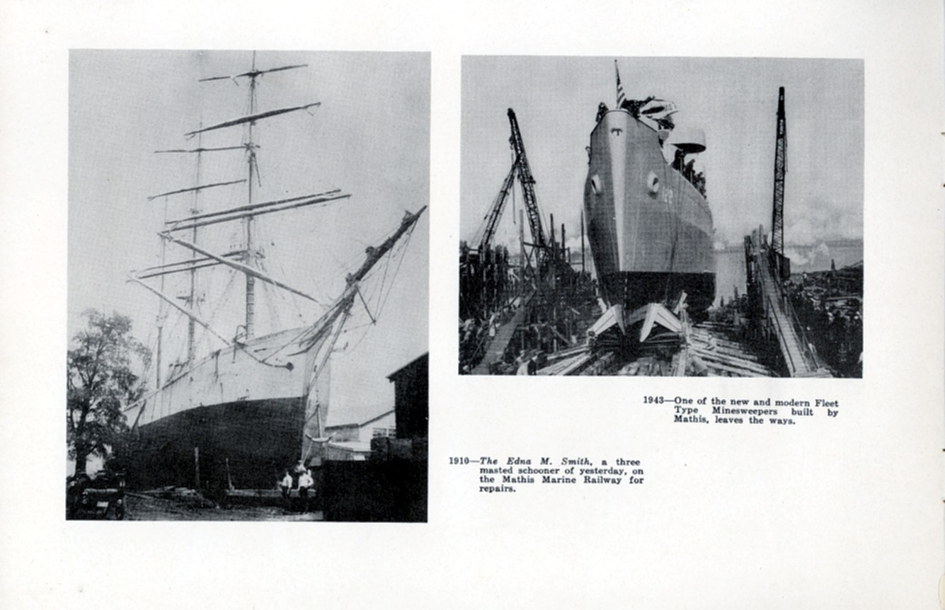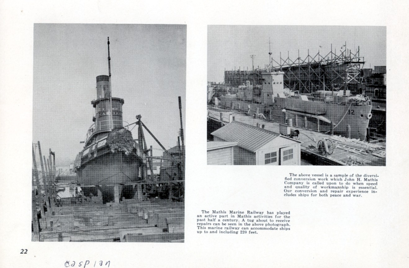 In 1941 the Mathis Shipyard received a contract to build three 221' Auk-class minesweepers, USS SWAY AM-120, USS SWERVE AM-121, and USS SWIFT AM-122. USS SWERVE was mined and sunk off Anzio in 1944, and USS SWIFT was scrapped in 1972. USS SWAY was sold to Mexico and renamed Ignacio Miguel Altamirano , and remains in active service. |