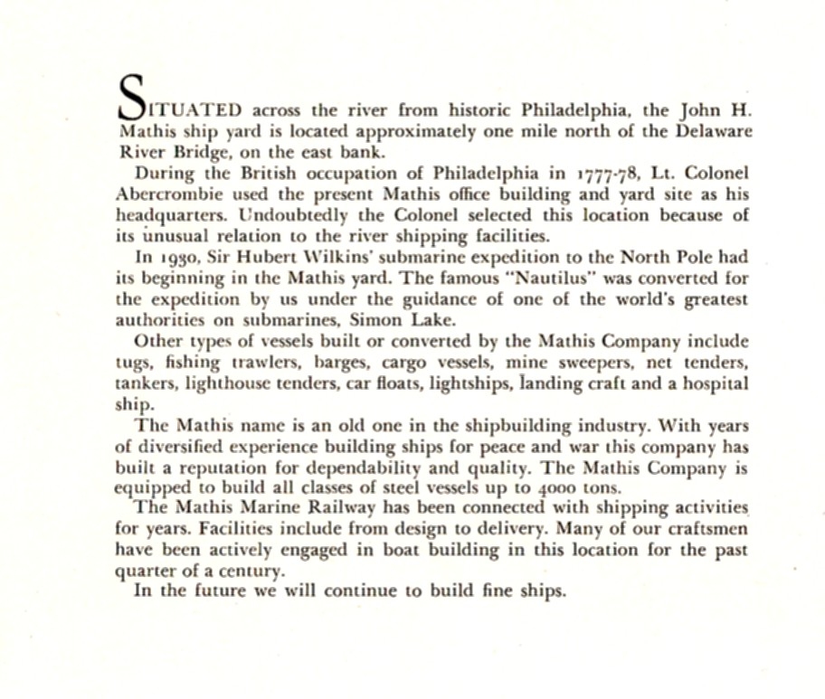 In 1931 Sir Hubert Wilkins attempted to reach the North Pole by submarine. His ship, the Nautilus, was a World War I vintage American submarine, leased to Wilkins for the expedition. The Nautilus received her final modifications before the expedition at the Mathis Shipyard. |