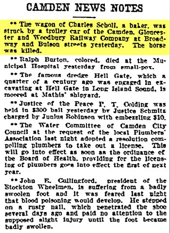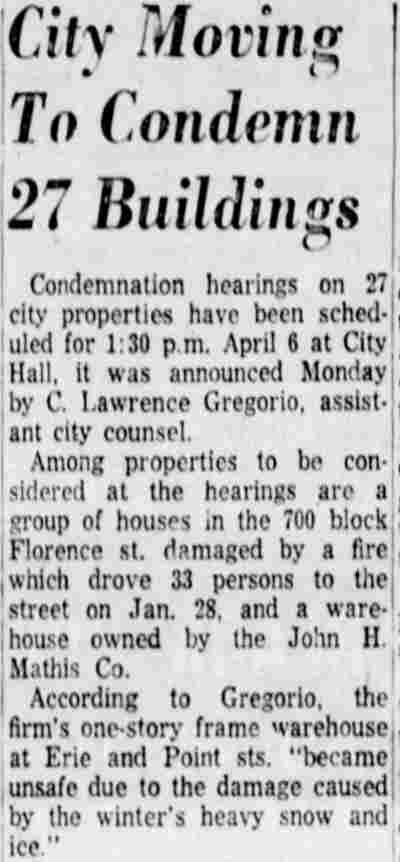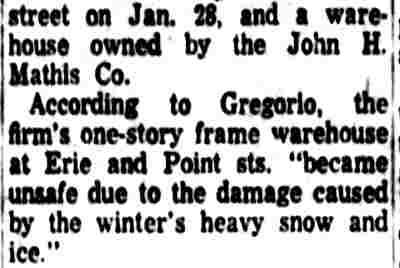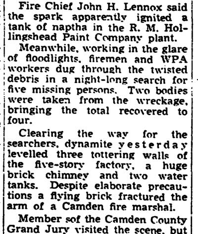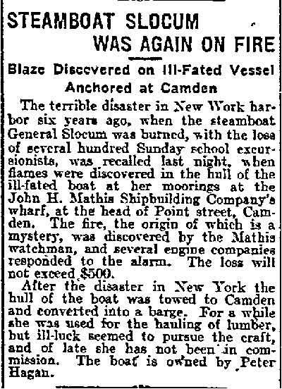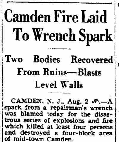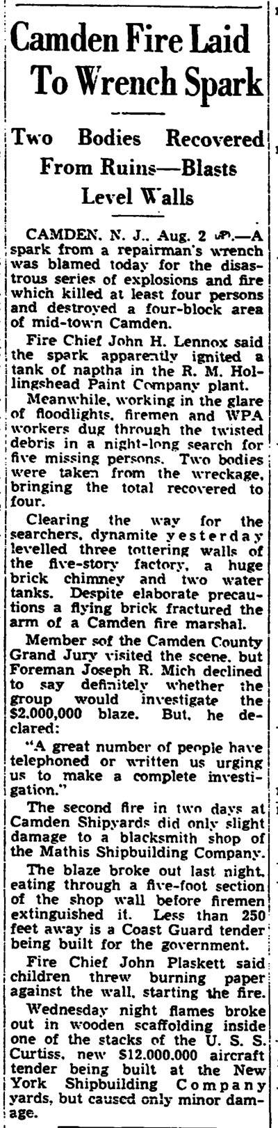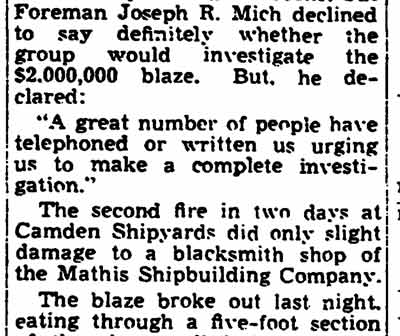 Five hundred persons attending the launching of a net tender at the John H. Mathis Shipbuilding Corporation were startled Saturday when the cry of "fire" was sounded. The blaze, although slight, was only a few yards from the crowds of employees, their relatives, and yard and Navy officials watching the launching. The fire was caused when a large crane dumped hot coals on the railroad tracks, setting fire to the ties and & quantity of oil soaked rags. Employees of the yard watching the ceremonies, rushed to the danger spot and extinguished the flames within a few minutes. However, due to the proximity of the fire to the ships and its possible danger if it gained headway, the Camden fire department was called. Battalion Chief Charles Errickson, answertng the call, collapsed from the heat a few minutes after re-turning to the fire house. His con-dition was not considered serious and he declined hospital treatment. The ship sent down the ways was the net tender, U.S.S. Teak. It was launched three months ahead of schedule and Navy officials had attempted to keep the ship's launching a secret until the fire disclosed the story. Mrs. E. L. Patch, wife of Captain E. L. Patch, supervising naval construction at the New York Shipbuilding Corporation, christened the 160-foot vessel. Later, the hull was towed to Port Richmond where Diesel engines will be installed, before it is commissioned into the Navy. The ship cost $471,000 and is the second tender launched at the yard in recent months. Two others of similar design are under construction on the ways. The yard also holds contracts for three minesweepers and 10 submarine chasers. The net tenders are used for laying and repairing nets in harbors as a defense against submarines. The nets also are placed around anchored ships to protect them against torpedoes. Shipyard employees, as a reward for finishing the ship ahead of schedule, were taken yesterday on a picnic to Seaside Heights, sponsored by the company. Ten chartered buses were provided for transportation. |
