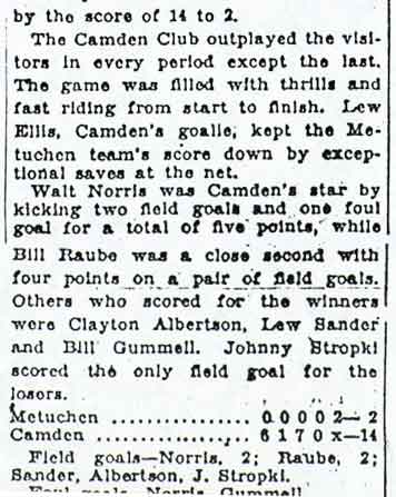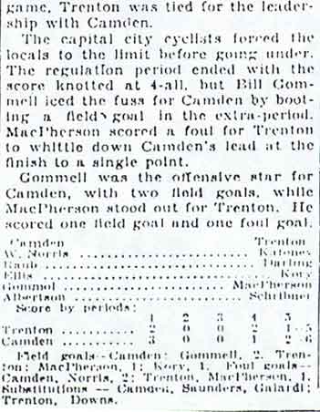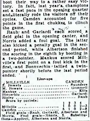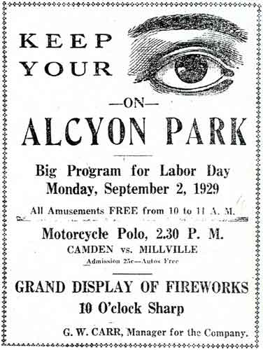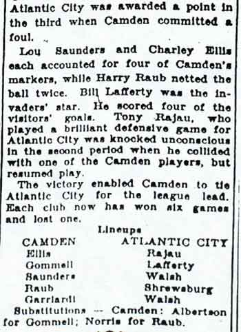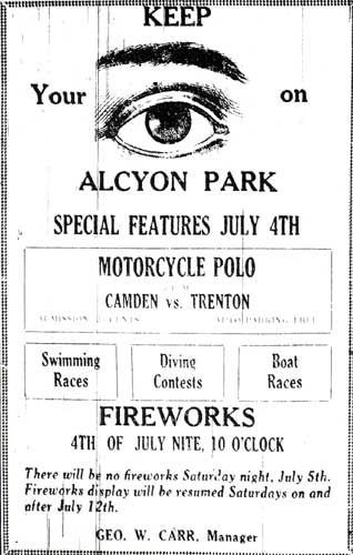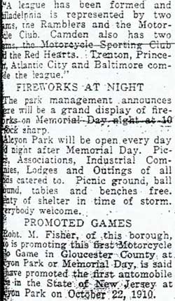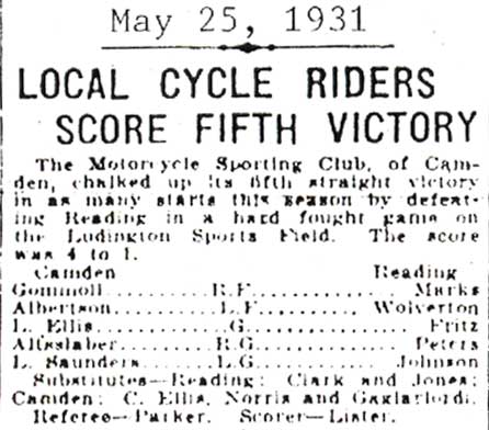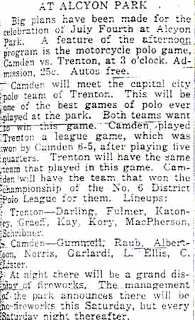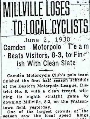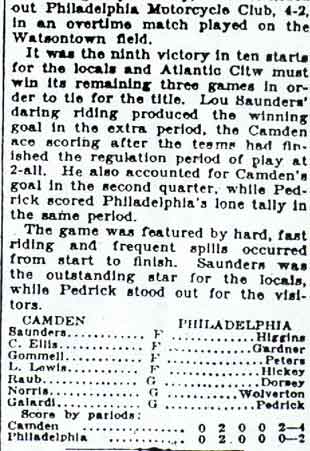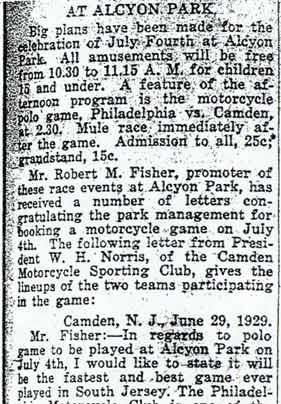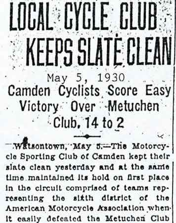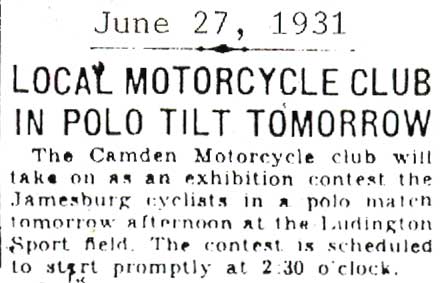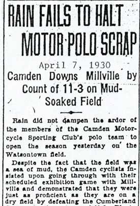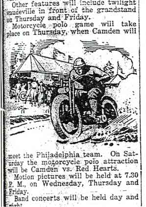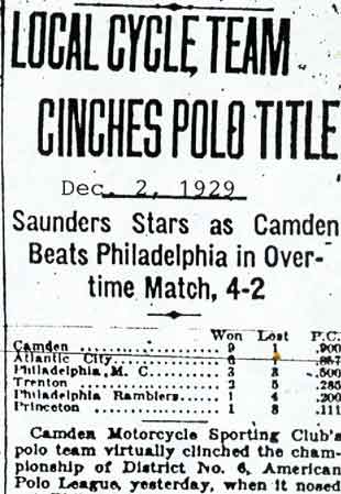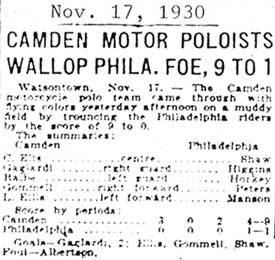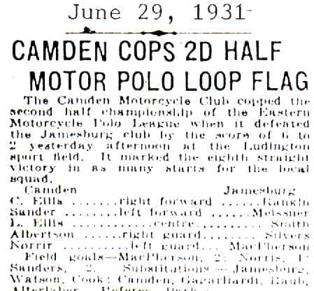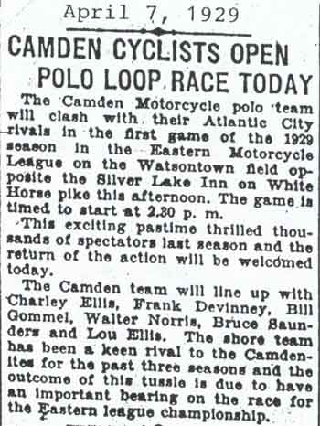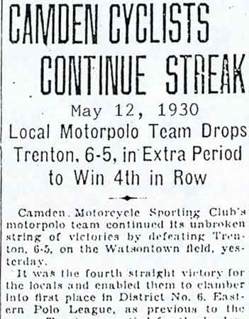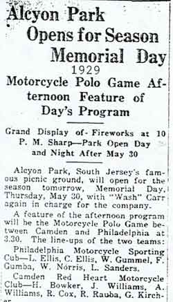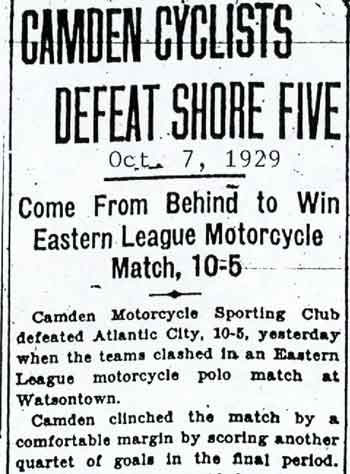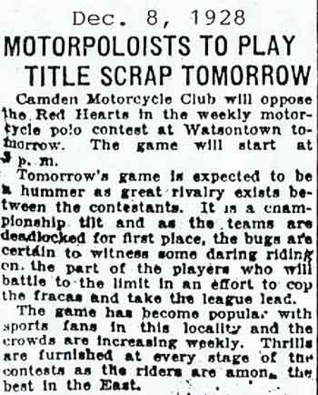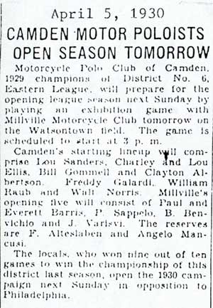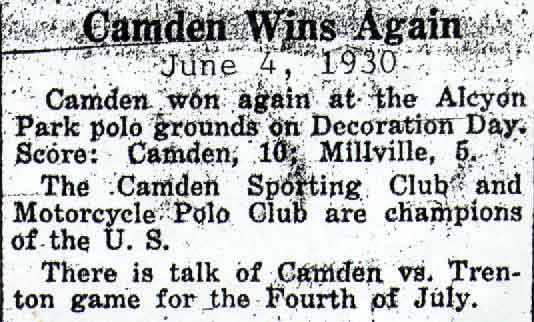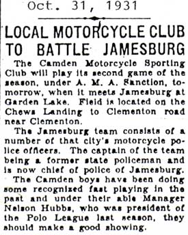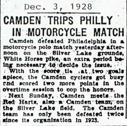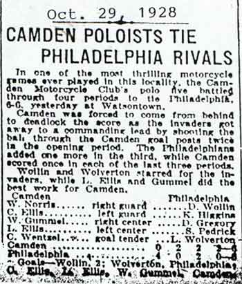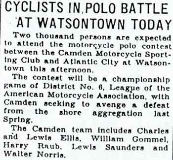 Motorcycles arrived in Camden about the same time automobiles did, and were quite popular. By 1919 there were dealerships in the city. In the 1910s William Heckenhorn operated a Harley-Davidson dealership at 1246 Haddon Avenue. One of his employees was Frank DeViney, who in 1923 opened a Harley dealership of his own, the successor to William Heckenhorn's operation. DeViney located his shop at 1124-1126 Kaighn Avenue, where he had a sales, parts, and service operation. He sold motorcycles to the general public and to local police departments. One of DeViney's first acts upon opening his business was to found the Camden Motorcycle Sporting Club, which engaged in touring, racing, and hill-climbing events throughout South Jersey and eastern Pennsylvania. The club also fielded a team in the Eastern Motorpolo League, which competed in the sport of motorcycle polo, also known as motoball. Considering the helmet technology of the late 1920s and early 1930s could not have been all that hot, it seems amazing that such a sport would be able to retain healthy riders, let alone become popular or attract a fan base, but it apparently did for a few years. Besides the Camden club, the league featured teams from Millville, Atlantic City, Trenton, Metuchen, Jamesburg, Philadelphia and Reading PA. There was another Camden team also, known as the Red Hearts. Besides DeViney, the Camden Motorcycle Sporting Club's team included Bill Gommel, Walter Norris, William Raube, Bruce Saunders, Lou Ellis, Charley Ellis, Clayton Albertson, Freddy Gagliardi, Walt Norris, C. Wentzel, Freddie Gomba, and men only known by their last names: Altesleben, Falone, Lombardo, Garriardi, Sherttuck, Oilinger, L. Lewis, and Ostrow. While motorcycle polo basically died out in these parts, the sport has remained popular in Europe, and is played to this day. |