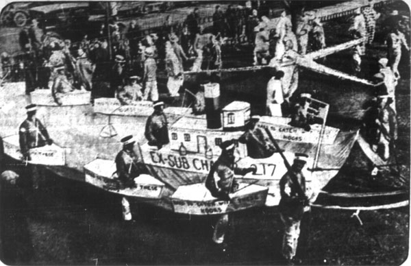 Camden Clowns, descendants of King Momus, making merry at the home for friendless children, Haddon Avenue, yesterday afternoon after they had participated in the Mummer’s Day Parade in Philadelphia. In the foreground is a float depicting an “Ex-Sub Chaser.” Surrounding this are ‘navy’ men in small boats on which are painted the words “hard to catch with these small hooks”. This feature of the Camden parade was a “slam” of the Navy for its failure to rescue the S-4. In the background clowns are “strutting their stuff” to thrill the 70 children of the home.