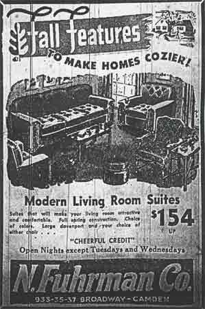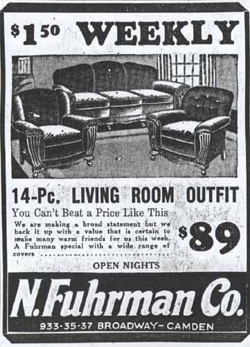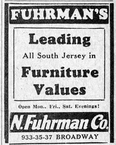 Founded by Nathan Fuhrman in 1904, the Fuhrman family operated their furniture store at 944-35-37 Broadway in Camden NJ over five decades. The family settled in Parkside, and family members were involved in civic affairs and local politics at one time or another. A relation, Clarence Fuhrman, moved to Haddonfield NJ and was a noted local bandleader. |