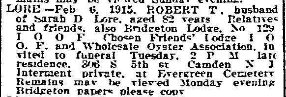 Oysters were a delicacy in Camden and elsewhere along the Delaware for many years until the trade was all but destroyed after a disease called MSX ravaged the Delaware Bay, beginning in 1957. An examination of Camden's City directories from the years 1887 through 1891 show many men involved in various aspects of the trade, from running restaurants to selling oysters wholesale and retail. One of Camden's most famous restaurants, Turner's Oyster House, dates back to this period, when Robert Turner first went to work in the trade. Turner's remained in business through at least the late 1940s. Robert Lore was in the wholesale end of the trade, family connections stretching down into Chesapeake Bay. His nephew, J.C. Lore Jr., founded the J.C. Lore & Sons oyster packing firm, which remained in operation as late as 1978. Another man who ran a restaurant specializing in oysters, an oyster saloon, in the parlance o the day, was boxer Daniel McConnell, whose establishment was in the 100 block of Main Street in North Camden. His son, also known as Dan McConnell, went on to become a well-known journalist with the Camden Post-Telgram and the Camden Courier-Post.