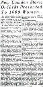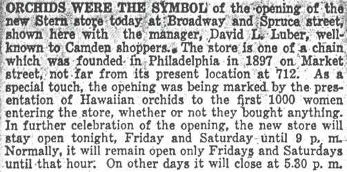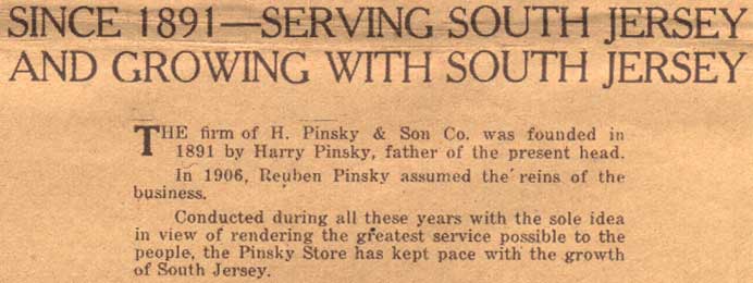 Harry Pinsky came to the United States from Russia in the late 1880s. He opened up a furniture store in Camden in 1891, which his son Reuben became head of in 1906. The business was located at 1128 Broadway when the 1914 City Directory was compiled. Business was good after Wrold War I. In 1923 the Pinskys purchased Wildey Hall, at the coener of South 6th and Pine Streets, and converted it into warehouse space. In 1924, the new Pinsky Store building, a five story structure at 836-840 Broadway, the corner of Broadway & Spruce Street, opened for business. The Pinsky building was later acquired by a furniture business called Whitehill, which operated there through the late 1940s. By 1936 the Pinsky Store moved to 921 Broadway. This building was later acquired by Joseph DiMona Sr. a few years later. The Pinsky Store moved once again, to 941 Broadway. The business had closed by 1950. On June 1, 1950 the former Pinsky Store reopened as the thirteenth store in the Stern department store chain, founded in 1897 by Louis Stern, Leon Levy, and Louis Schneider. The Stern Store remained at 836-840 Broadway into the 1960s. Another Pinsky, Ralph M., also operated a furniture store in Camden, at 1222 Broadway. This business operated in Camden until at least 1977. |