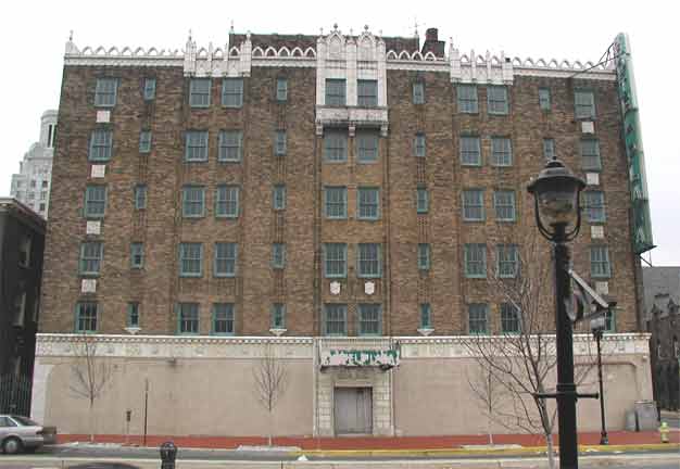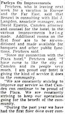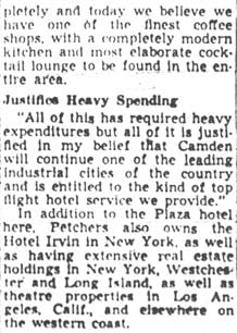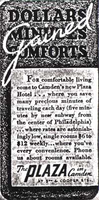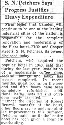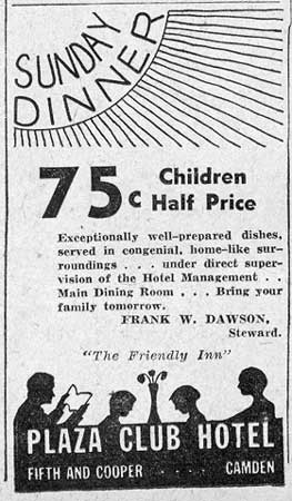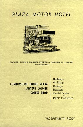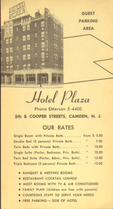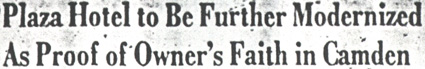 The Hotel Plaza was built at Fifth and Cooper Street in 1927, and was originally called the Plaza Club Hotel. In 1947 it underwent a complete remodeling. Hotel owner S.N. Petchers of New York explained that the high cost of modernization was "justified in my belief that Camden will continue one of the leading industrial cities in the country and entitled to the kind of top flight hotel service we provide." S.N. Petchers undertook another modernization in the summer of 1950. The hotel featured banquet and meeting rooms, a bar known at different times as the Plaza Hotel Bar and the Lantern Lounge, The Cornerstone dining room, and a coffee shop. The Hotel Plaza closed in 1985. For almost 30 years it stood empty, with various redevelopment schemes proposed every now and then The old hotel was finally demolished in February of 2014. Like the nearby Parkade Building, which had been taken down a couple of years earlier, the Plaza's razing was far more a symptom of Camden's reality than an event marking a new day of progress. |