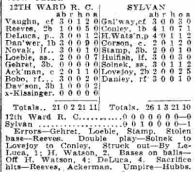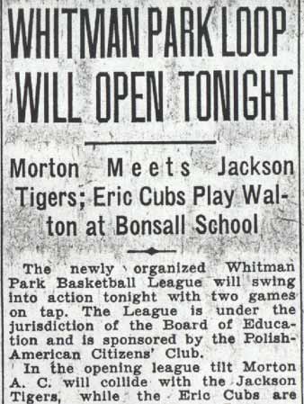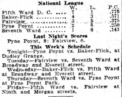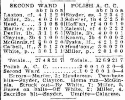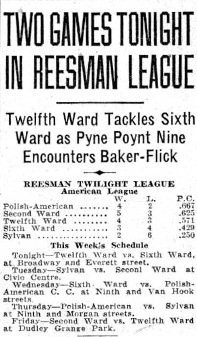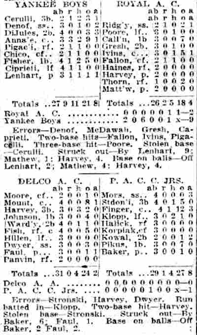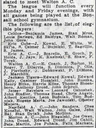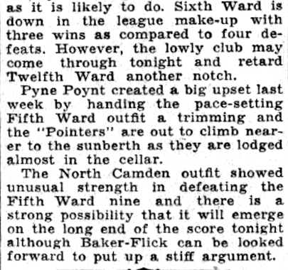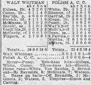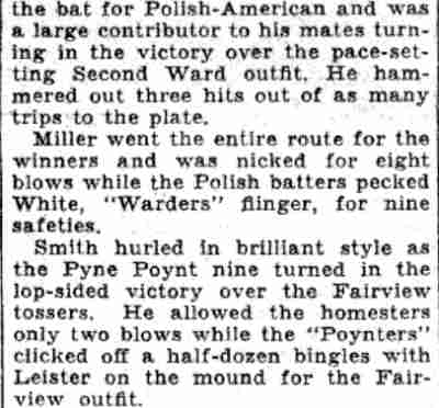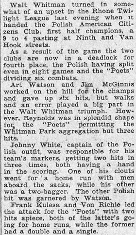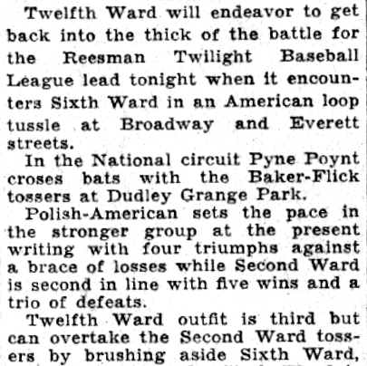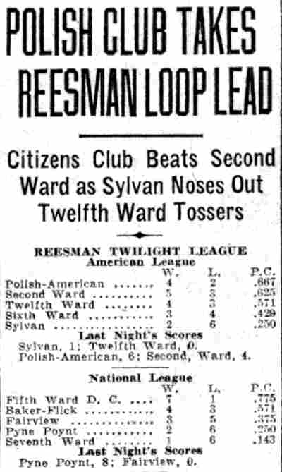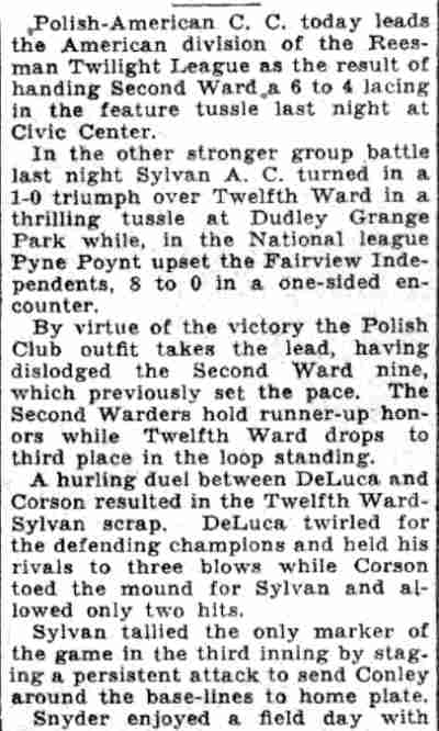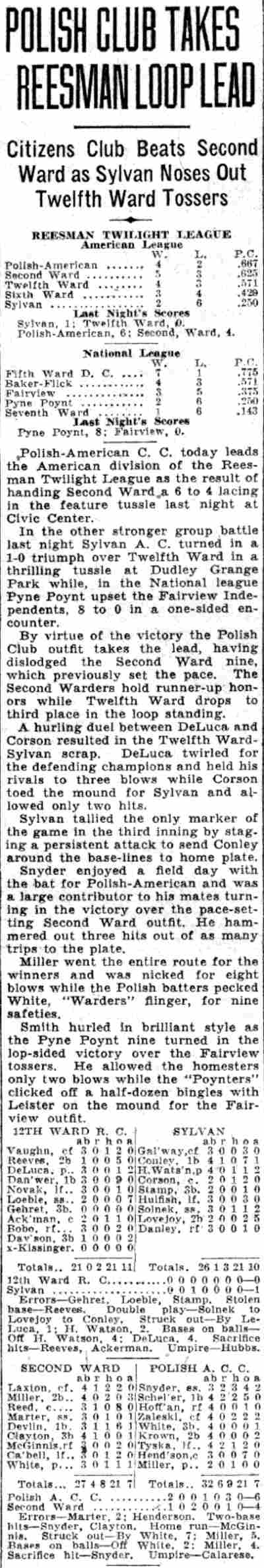Outslugging Twelfth Ward, Campbell’s Soup went into a tie for first place in the American Division of the Kobus Twilight League when it defeated the "Warders" 12 to 8 at Dudley Grange Park in one of four games played last night. In another American Division tussle, St. Joseph's Polish soundly trounced the Polish American Citizens Club, 13 to 1 at Broadway and Everett street. In a pair of National Division tussles, the Walker Robins gained a firmer grip on second place when it whipped Sacred Heart at the Fairview Ball Park, 13 to 1 and Lincoln took the measure of St. Joan of Arc at Seventh and Jefferson by the score of 5 to 1. Pitchers in the Campbell's-Twelfth Ward fracas took a beating with the "Soupmen" collecting 13 blows off Mike Huggard and Martin, while the "Warders" slapped Norm Young for 11 safeties. Campbell's lost no time in putting the game away, tallying seven runs in the first inning and then added one in the third and two in the fourth to clinch the verdict. The "Warders" tried hard to overcome the lead and in the sixth session put on a rally which netted five runs. Gresk was the hitting star for Campell’s, rapping a pair of singles and a home run, while Herb Dunn sparkled at the plate for the Warders with three for four. The polish-americans were no match for St. Joe's Polish, Jim Stubbs setting down the former outfit without much trouble, giving up but six hits. St. Joe's on the other hand rapped T. Martin and Huston for 19 wallops with Stubbs and Gray pacing the offense, each getting four hits. Walt Nowak also hit hard, getting three for four. Galecki was the only polish-american who could solve Stubb's offerings, smacking three singles. The Walker Robins also had little difficulty with Sacred Heart, scoring in each of the six innings with the exception of the fourth. Carpenter worked on the hill for the Robins and set down his foe with only two hits, while his mates clubbed Phillips, Rudolph and Savich for 11 bingles. Warren, Jones and Carpenter led the attack with two hits apiece. Sacred Heart's lone run came on a homer by Cianfrani in the second inning. Two runs in the first and three in the eighth spelled victory for Lincoln over St. Joan of Arc. Schoekolf went the route for Lincoln and spaced out eight hits, the Saints' lone run coming in the third on a homer by Gondolf. Lincoln collected eight hits off Franks and Collins with Lyback and J. Schramm each getting two. ![]() |