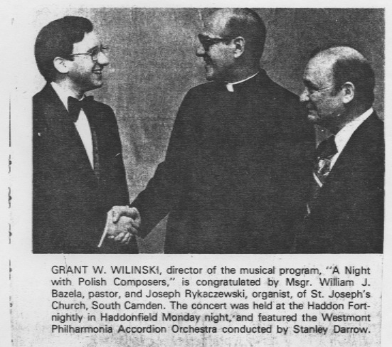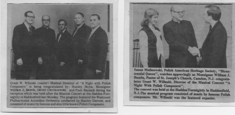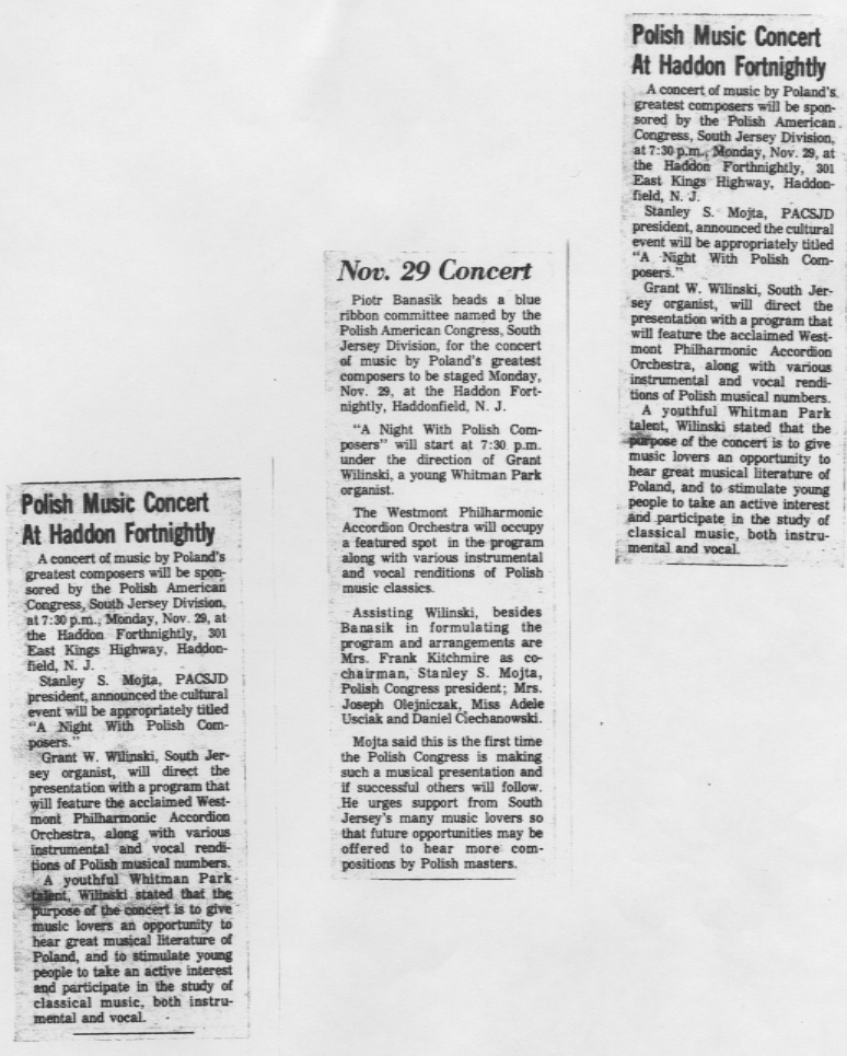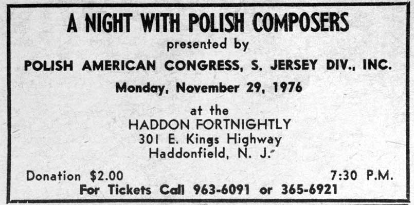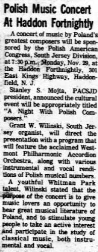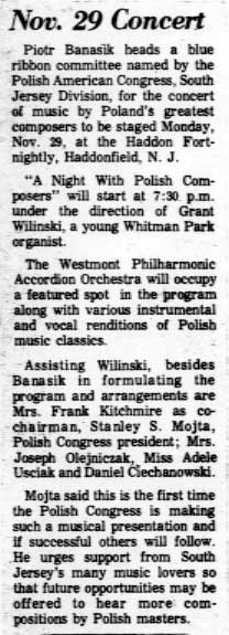 A limited number of admission tickets will be available for Monday's presentation, "A Night With Polish Composers” at the Haddon Fortnightly, Haddonfield, N. J. Chairman Piotr Banasik made the announcement earlier this week after receiving a number of calls from former Whitman Park residents, now living elsewhere in the South Jersey area, and who have found it inconvenient to pick up the tickets in advance. The seating capacity in the auditorium is limited to 400 persons. More than half of this number, Banasik said, have been sold at $2.00 each. Until capacity is reached tickets will be sold at the door. The cultural entertainment is under the sponsorship of the Polish American Congress, South Jersey Division. President Stanley Mojta said it is the first of its kind presented by his group. If the lovers of classical music support this event others of a similar nature will be considered for the future. Grant Wilinski, a youthful Whitman Park organist, will direct the musical program starting at 7:30 p.m. The works of distinguished Polish composers will be featured by the Westmont Philharmonic Accordion Or-chestra, with selections of Polish music classics rendered by instruments as well as vocally. Assisting Wilinski in formula ting the program and arrangements are Banasik, Mrs. Frank Kitchmire, co-chairman; Mojta, Mrs. Joseph Olejniczak, Miss Adele Usciak and Daniel Ciechanowski, any of whom may be contacted for tickets. The Haddon Fortnightly is located at Grove Street. and Kings Highway East in Haddonfield, two blocks east of Haddon Avenue. |