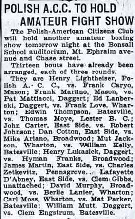 AMATEUR MATCHES Simon-Pures to Compete in Nine Bouts at Bonsall School Tomorrow After a lapse of several weeks, the Polish American Citizens Club will again sponsor amateur boxing shows with nine bouts carded on tomorrow night's program at the Bonsall school auditorium, Mt. Ephraim Avenue and Jackson Street. Four scrappers of the home club will see action with the feature bout between Henry Lighthiser, of the P. A. C. C., who has showed splendid form in his recent battles, and Pat Mattiuco, of Daggert. The other three Polish-American boxers on the card are Romo Kocinski, Lou Bonsey and Vincent Ricco Laurio. Kocinski is slated to go in the semi-windup against Al Imes, of the Wharton A. C., while Bonsey will take on Mike Dia Dato, of Daggert, and Laurio will battle Tom Giamanco, of Daggert. In the other five bouts Tom Bergen, West End, meets Donald Barber, Wharton; Oscar Richards, West End, faces Warren Corbin, Wharton; Matt Jackson, Wharton, opposes William Hutt, Daggert; Carl Moss, Wharton, tackles William Lefferts, Daggert, and William Smith, West End, takes on William Floyd, Wharton. All are five round bouts with the first scrap scheduled to start at 8.30 o'clock. |