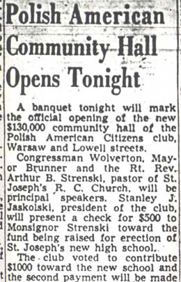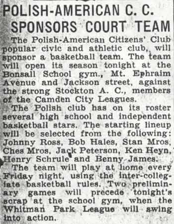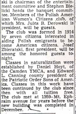 The Polish American Citizens Club was first organized in 1914, to provide a social and educational resources for the rapidly growing Polish-American community centered around St. Joseph's Church in the Whitman Park section of Camden NJ. It could trace its roots back to Polish social clubs that had organized in the late 1890s. The Polish American Citizens Club's first president was Josef Zbieratsky. Journalist Peter Liwoch was for many years the recording secretary, served on the board of directors, and founded the club's library, whose books numbered in the thousands. By the 1920s the club was meeting at 1559 Mount Ephraim Avenue. This building was purchased in January of 1928. After Prohibition was repealed in 1933, a bar was opened for members. In the late 1940s, Stephen Stemborski was the steward. The Polish American Citizens Club also sponsored sports teams and leagues to keep the boys and girls of the community out of trouble. At least one PACC baseball player, Sig Jakucki, went to the major leagues. On March 18, 1950, the Polish-American Citizens Club dedicated the fine hall that they had built at the corner of Warsaw and Lowell Streets. The building served the Polish-American community and the entire neighborhood for many years. Activities included furnishing classes to Polish immigrants so they could become naturalized American citizens. It is interesting to note that in this effort the PACC partnered with the Camden County organizations of the YMCA and the Patriotic Order Sons of America to provide these services. The Polish-American Citizens Club remained open in Camden into the early 1990s. The building was subsequently sold to the Board of Education of the City of Camden. The club is still quite active, however in 2009, hosting a number of social events each year, participating in the annual Pulaski Day Parade in Philadelphia, and of course supporting St. Joseph's Church at South 10th and Mechanic Streets in the old Camden neighborhood. |