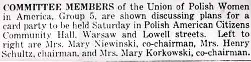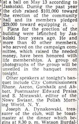 PACC Sold Out for New Year's Eve Party All tickets have been sold for the Polish American Citizens' Club New Year's Eve party. A capacity limit of 300 guests will ring out the old and greet the New Year with merriment in the upper floor ballroom. Chairman Leonard Drozd said an early sellout last week left many persons disappointed when they called for tickets. In all cases, he said, a referral was made to the St. Joseph's parish party in the parish hall where some tickets were still available at the time. Several years ago, before a limit was placed on the number of guests who were entertained at the club's New Year's Eve parties, more than 800 persons crowded in the two-story building in South Camden. The bulky gatherings became difficult to handle and subsequent affairs developed into the present system of one floor with plenty of elbow room while catering to an easier to handle crowd. Ray Dombrowski and his Musical Notes will spark the music for the merry celebrating from 9:30 p.m. until the early morning hours. A buffet style service will provide food for the guests for three hours, starting at 10 p.m. |