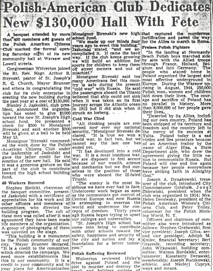A benefit social for the benefit of St. Joseph's Church in South Camden will be held Sunday, Nov, 10, under the sponsorship of the Polish American Congress, South Jersey Division. President Chester Przywara announced last week that all funds derived from the affair will be donated to Fr. Edward H. Bucia, pastor, in response for financial aid needed to help defray the cost of many major repairs requiring attention. The event will be staged at the Polish American Citizens' Club with additional details following future developments. The church benefit, Przywara explained, will replace the annual Man and Woman of the Year testimonial usually held around this time of the year. Along with the announcement, Przywara said the South Camden club is donating its facility toward the success of the fund-raiser, and as such, an invitation of support is extended to all church groups and fraternal organizations to aid a worthy cause. PAC vice president Joseph Shilinski has been appointed general chairman, and will direct ticket sales priced at a $10.00 donation including food. The general committee will meet soon with Fr. Bucia to discuss all matters related for the successful conclusion of the charitable fund-raising en-deavor. In other unrelated matters acted upon at the last meeting, the delegates extended wishes for a speedy recovery to Joseph Powell, a past vice president of the PAC, following his recent surgery. Congratulations were also extended to Mr. and Mrs. Roman Hunzak on'the appoin-ment of their son, John, to the U.S. Naval Academy. |
