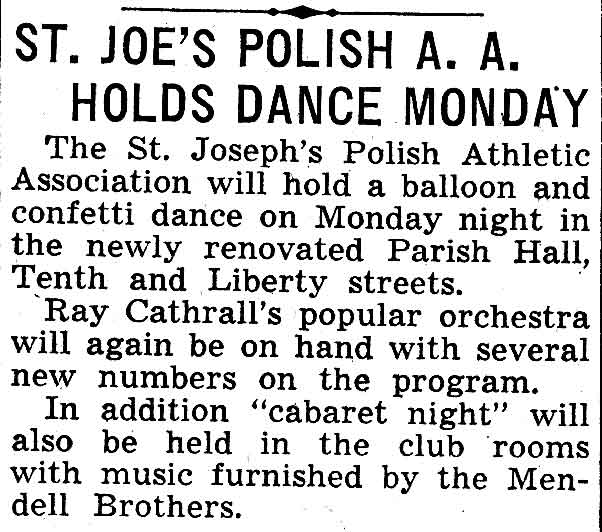 JOE’S ATHLETES BANQUETED TONIGHT 'Clipper' Smith Principal Speaker at Fete; Wysocki Wojciehowicz to Attend A star-studded array of sport8 notables will be grouped around' the speakers' table at the first annual Sports Dinner of the St. Joseph's Polish Athletic Association tonight it the parish hall, Tenth and Liberty Streets. The affair; which is expected to be one of the most colorful held in this vicinity recently, is in honor of the baseball, basketball and football players who represented the local club during the past and present seasons. Heading the array of speakers will be Maurice "Clipper" Smith, who coached the Villanova College gridsters to an unbeaten 1937 campaign. Smith will bring along several of the Wildcats' outstanding gridster and basketball stars. A few who Smith will have in tow and who are down as speakers are John Wysocki, mentioned on several All-America teams at an end post; John Mellus, another who gained prominent mention on All-America elevens at tackle, and Walt Nowak, a member of the local association and who sparkled at end for the 'Cats in his sophomore year last season. The Villanova basketball squad will be represented by "Duke" Duzminski, crack forward who is being touted as one of the outstanding courtmen in the East, while "Doc" Jacobs, coach of the Wildcat baseball team, will also attend. Wysocki and Mellus, however, are not the only All-Americans who will be on hand. Alex Wojciehowicz, who gained mention as an All-America center at Fordham last year, will also be a guest. Ted Nitka, coach of the St. Joe's grid team, was a former teammate of Wojciehowicz at Fordham, the former graduating two years ago after starring at an end post. Toastmaster for the occasion will be Joseph Scechowski, former president of the association, while other speakers will be Henry Ciechanowski, president; Stanley Ciechanowski, and Walter Budniak. The banquet committee is composed of Edward Ziemnicki, chairman; Edward Rydzewski, Edward Snitowski and Henry Ciechanowski. |