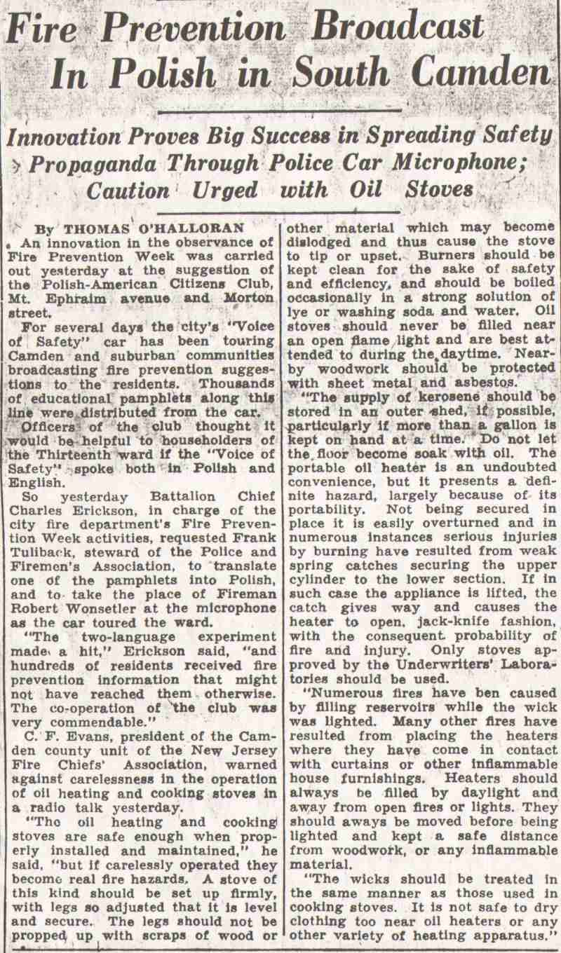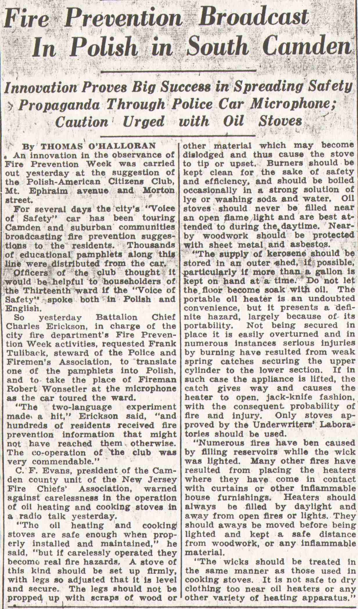 LAW The passage of a curfew law and the appointment of a commission to study juvenile delinquency were advocated last night at a meeting of the United Polish organizations at the Polish-American Citizens Club, 1559 Mt. Ephraim avenue. Thadeus A. Sikorski, president, said 32 Polish organizations were represented at the meeting and approved a proposed curfew law, which would take children under 16 years from the streets at 9.30 p. m. during the Winter and 10 p. m. in Summer. "We propose two plans," Sikorski said. "The policeman finding a child on the street after hours would take him home and the parents would be handed a summons to court, where a nominal fine would be imposed. Or, the child could be taken to a police station and the parents summoned to take the youngster home. A large factory whistle could be blown as a curfew in North, South and East Camden. "We know Mrs. Mary W. Kobus, director of public safety, is in favor of correcting juvenile delinquency, and we will ask her to name a committee to study correcting this evil." Sikorski said the proposals will be sent to the city commission in the form of resolutions. He spoke before the commission on previous versions on the curfew law . |