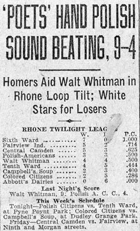 CAMDEN AMATEUR LOOP IN CONFAB TOMORROW Managers of teams which were represented in the Camden Amateur League during the past baseball season are requested to attend a meeting of the circuit tomorrow night at the Polish American Citizens' Club, Mt. Ephraim Avenue and Morton Streets. The confab, which is scheduled to start promptly at 8 o'clock, is to be held so that plans can be made for the coming basketball season. Any other club desiring to enter the circuit for the court campaign may make its application tomorrow evening. |