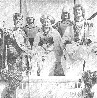 START OF CHRISTIANITY in Poland is commemorated by representatives of Polish Ametican' Women's Club, Lowell and Warsaw Streets, during yesterday's Pulaski Day Parade. Left to right are Mrs. Bernard Weaver as King Mieszko I; Mrs. Ray Baus as a guard; Mrs. Frank Kitchmire as Queen Dabrowski, Mrs. Frank Filipek as a guard, and Mrs. Frank M. Bates as prelate. |
