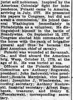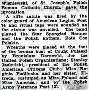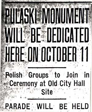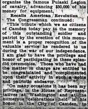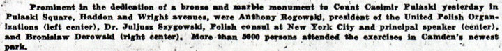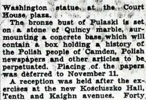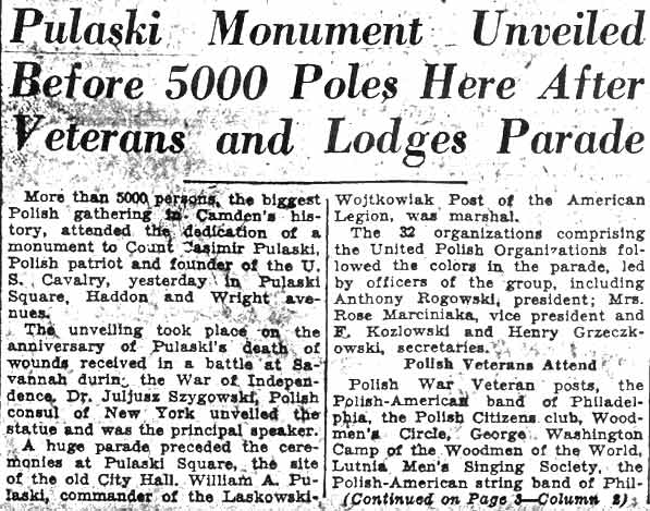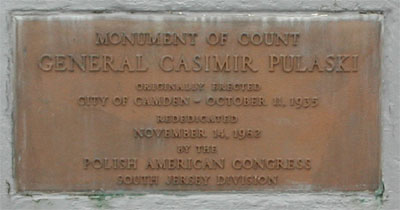 On October 1, 1936 the Polish community in Camden announced that a monument to Casimir Pulaski would be dedicated on October 11. The monument was placed at a park that lay at Benson Street and Haddon Avenue, where Camden's City Hall had stood prior to the present City Hall's opening in 1931. The park came to be known as Pulaski Park. At the dedication there were many notables and dignitaries. Among the speakers were Mayor Frederick von Nieda, Commissioner Frank J. Hartmann Jr., Monsignor Arthur B. Strenski of St. Joseph Roman Catholic Church, and Congressman Charles A. Wolverton. Camden's Polish community celebrated Pulaski Day with a parade through at least the late 1970s. In more recent times, Polish groups formerly based in Camden such as the Polish American Citizens Club have participated in Philadelphia's Pulaski Day Parade. When Camden's Pulaski Park was designated to be the site of a new medical school, the monuments that were there had to be relocated. The South Jersey Division of the Polish American Congress, along with Polish Army Veterans Post 121 and the Polish American Citizens Committee raised funds to move the Pulaski Monument to a new site. In 1984 the monument was moved to Cooper River Park, at Park Drive and Route 130 in Pennsauken, NJ in 1984. A new monument to Thaddeus Kosciusko was also dedicated that October. The two original monuments to Thaddeus Kosciusko and Casimir Pulaski were joined in 1995 by a new monument dedicated to those members of St. Joseph Roman Catholic Church located at 10th & Liberty Streets in Camden who gave their lives for our country in World War II. Information from a plaque inside the church was the basis for this monument. site of the three monuments is no known as |