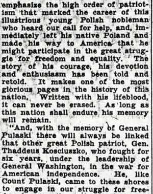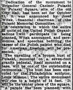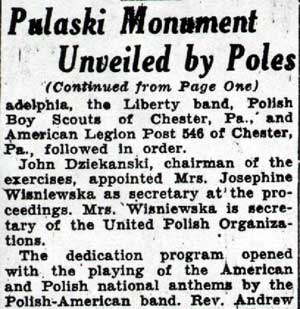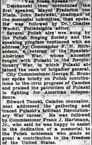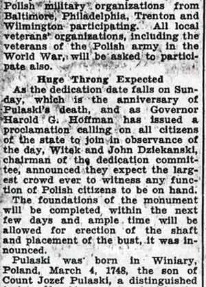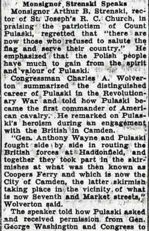 Parade, Mass Pulaski Day Observed In Camden A crowd estimated at nearly 3,000 witnessed Camden's Pualaski Day observance yesterday commemorating the death of Brigadier General Casimir Pulaski at Savannah, Ga., in 1779, and the 1100thth anniversary of Poland's conversion to Christianity. Featured in the parade were 40 bands, including Air Force and Army bands, and several floats depicting events in Polish history. Among those in the reviewing stand were Mayor Alfred R. Pierce, Senators Frederick J. Scholz and A. Donald Bigley, the Most Reverend Celestine J. Damiano, Archbishop of Camden, and all city councilmen and department heads. Polish Sermon At the conclusion of the parade Archbishop Damiano celebrated a Pontifical Mass in Whitman Park. Very Reverend Michael M. Zembrzuski, founder-director of the National Shrine of Our Lady of Czestochowa in Doylestown, Pennsylvania, delivered the sermon in Polish. A 50-voice choir, composed of members of St. Cecilia's Pennsauken; and Lucia's Choir of St. Joseph's Church, South Camden, sang during the Mass under the direction of Leonard Rykaczewski. Joseph Rykaczewski accompanied on the organ. |