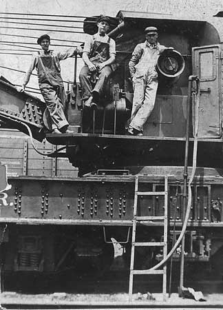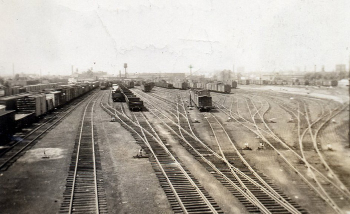 Railroad Days 1951-1955 Being that I lived practically across the street from the Pavonia yards, I spent a lot of my early teen life around the tracks there. often sitting on the bench with the car brakemen who would ride a cut of cars down the tracks from the hump, that was just beyond the 27th Street bridge… I suppose I had railroading in my blood, since my maternal grandfather, Robert Veatch, had worked in the yards when he was younger. Here are a couple of pictures of him (he is in the center in both pics).