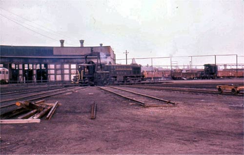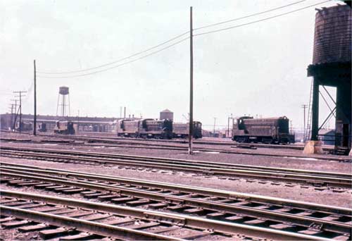 Railroading in Camden (continued) I'll start with a picture that should properly have been in the first railroad section, which is a view of the Pavonia Yards looking toward the State St. crossing. Again, this is in the early 1950s. The arrival of the diesel switch engines in the early 1950s was cheered by the housewives who lived near the yard, as soot no longer blackened their hanging laundry and homes, but for me the slow removal of steam was the end of an era. Diesel switchers first appeared only on Sundays at Pavonia, but within months I noted long lines of dead steam engines, their fires gone and drive rods removed, being hauled unceremoniously to their fate. I felt (at age 15) that I had to record the great roundhouse and yard in the south section of Camden before it too was gone forever. The pictures I took follow: