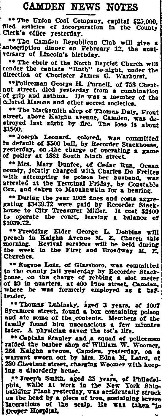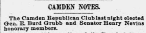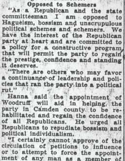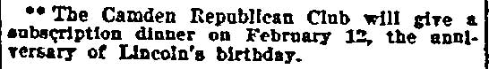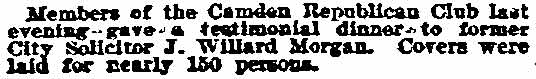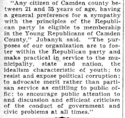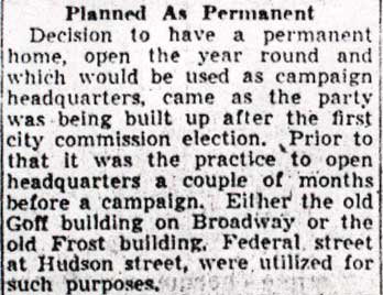The Republican Party, under the direction of William Joyce Sewell, David Baird Sr., and David Baird Jr. dominated politics in Camden from the 1870s through 1935. To the left is a picture of the old Camden Republican Club from 1914, at 312 Cooper Street. In 1923 a building at 223-225 Broadway, the corner of Broadway & Stevens Street, was obtained which was to become the party's full-time city and county headquarters. |