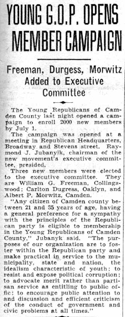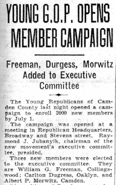 Support of City Commissioner Mary W. Kobus as "leader of the Republican Party in Camden County" is pledged in a resolution adopted by the Sixth Ward Republican Association, meeting in headquarters of the Camden County Republican Association, 506 Broadway. Text of the resolution, signed by Elwood A. Fritz, president, and Edgar Brittingham, secretary, follows: "Whereas Commissioner Mary W. Kobus as a public official and as a Republican has always demanded and upheld the most important and political proclamation, to wit: 'Only those means and measures shall be adopted which shall presently and ultimately prove and provoke the greatest good to the greatest number,' and "Whereas the Sixth Ward Republican Association is desirous of rehabilitating the Republican Party and restoring confidence of the public in the Republican Party; "Therefore be it resolved that the Sixth Ward Republican Association of the City and County of Camden does hereby pledge its support to the leadership of Mary W. Kobus as leader of the Republican Party of Camden County." Officers installed at the meeting were Fritz, Brittingham, Charles Cifriano, first vice-president; John Gritton, second vice president, and Edgar Holmes, treasurer.. |
