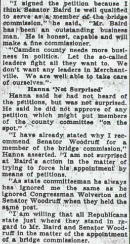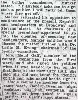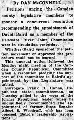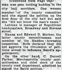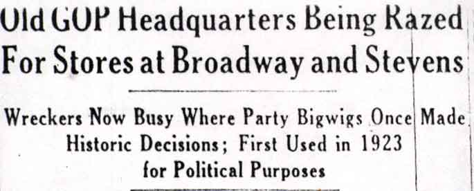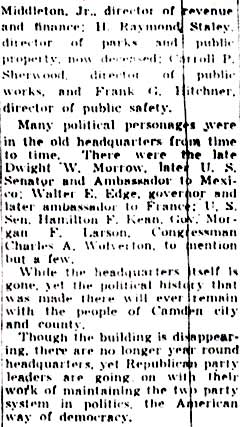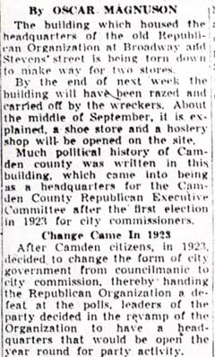 The building on Broadway remained in use by the Republican Party until 1940. It was managed in the 1930s by William Lehman, a political ally of David Baird Jr. The 1930s were marked by a bitter struggle for power between Baird and Albert S. Woodruff. This struggle so divided the city Republican Party that Democrats led by George H. Brunner all but eliminated the Republicans from power within the city of Camden. As a result of this dissatisfaction with the leadership of David Baird Jr. by suburban Republicans, a movement led by county committeeman Edward Marker led to the Republican Party Headquarters leaving the building in 1940. The building had been closely identified with the Baird faction of the party, and this influenced the decision of party leaders as much as the apparent shift in party fortunes from the city to the suburbs. In July of 1942 the building at 223-225 Broadway was razed. Two new stores were built in its place. |