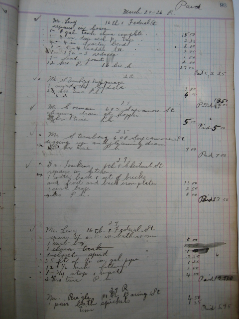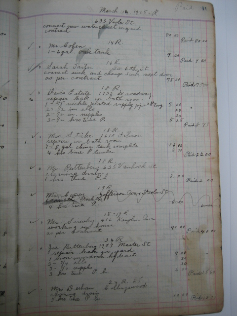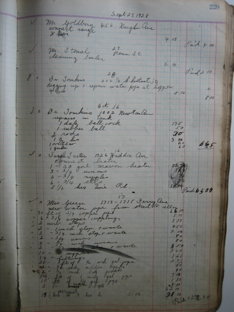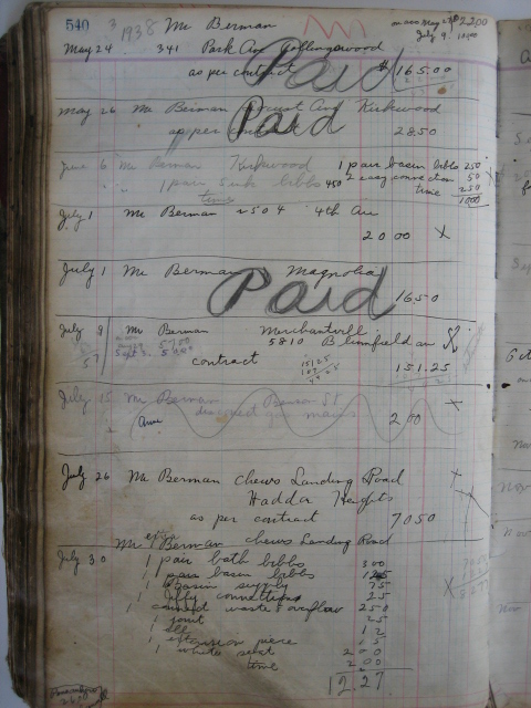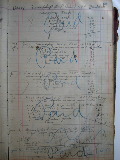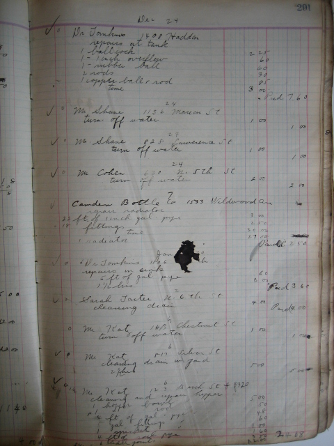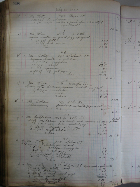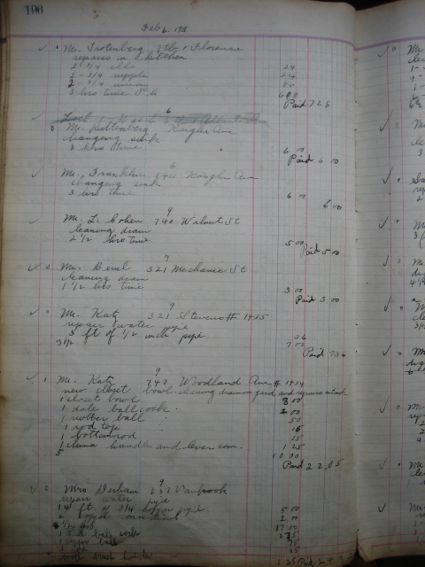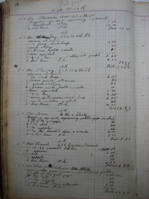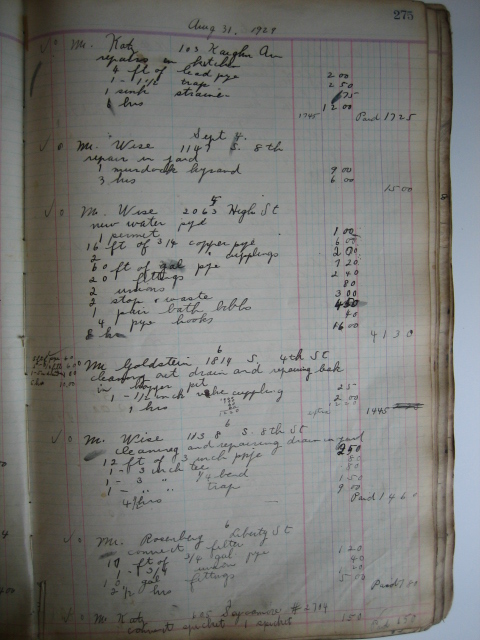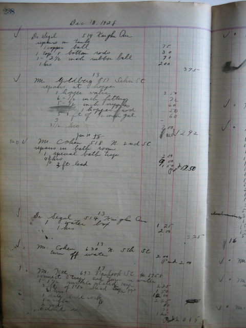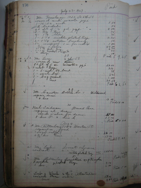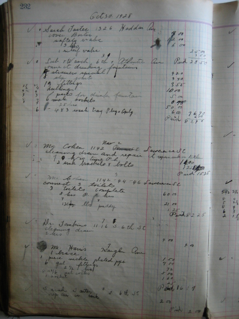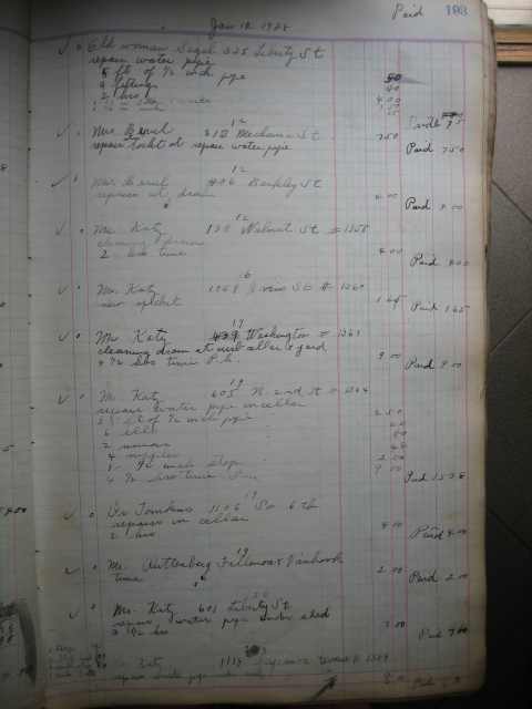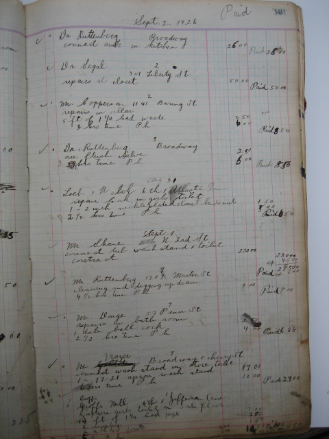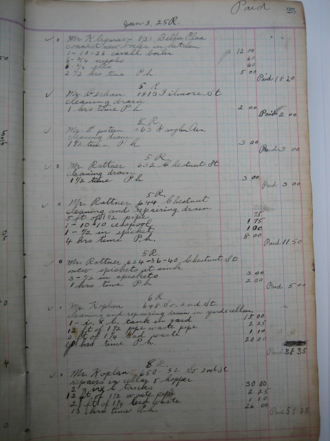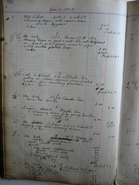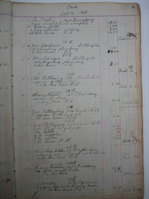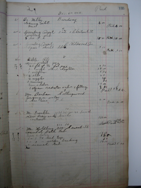 Ross Plumbing was the business of the Ross family, and bore the name of its founder, Isreal Ross, who went into business as a plumbing and heating contractor in 1918. He had previously partnered with Francis Bicker Jr., son of Dr. Francis Bicker, a well known physician in Camden's Eighth Ward. He may still have been in business with Bicker into the 1920s. By January of 1920 Isreal Ross and his wife, the former Annie Silverman, had bought a house at 1145 Baring Street. Annie Silverman was the daughter of Becky Silverman, who owned an operated a clothing business at 299 Kaighn Avenue, the corner of South 3rd Street and Kaighn Avenue. A set of journals that begin in 1924 seem to indicate that the partnership with Francis Bicker Jr. had dissolved, and that Isreal Ross had started his own business. These journals, presented here, show every job that Isreal Ross undertook, indicate that he worked for many people who were or would become well known in Camden. He also had begun doing work for various real estate operators. Sometime after the fall of 1936 Israel Ross acquired the building at 1142 South 6th Street, where the Tarter family had once conducted a bottling business. Isreal Ross lived and operated his business here, the Ross Plumbing & Heating Company, through at least 1947. By that time sons Edward and Leonard had joined the business. Ross Plumbing and Heating did a great portion of its business with Camden real estate operators and landlords. Some of the larger and more notable clients in the 1930s and 1940s included Benjamin Natal, Theodore Tiedeken, Samuel Gelfand, Louis Richelson, Louis Dorflinger, Ellis Goodman, Zellie Ellis, Joseph and William Lipkin, and Alex Malamut. There was also institutional work, for the Talmud Torah building, churches and synagogues, and Belleview Hospital. They also did work for several Camden physicians, including Dr. Ulysses Wiggins, Dr. William Lashman, and Dr. Marcus Wheatland. Commercial accounts included Trilling & Montague, a company involved with many of the bar businesses in Camden, Quality Drugs, and several businesses on Broadway, Kaighn Avenue, and throughout the city. They also worked for several Building and Loan Associations and the Federal Deposit Insurance Corporation's real estate operation. Isreal Ross passed away on April 12, 1962. He was buried the following day at Crescent Burial Park in Pennsauken NJ. He was survived by his wife and sons, who carried the business forward. Anna Silverman Ross passed away in Cherry Hill NJ in 1993. The Ross Plumbing and Heating Company was still operating on South 6th Street as late as the fall of 1977, and owned the property into the late 1990s. For more about the the family and business of Isreal and Anna Ross, please visit the following web-pages on on this site: