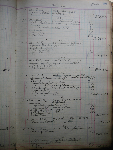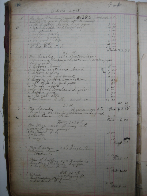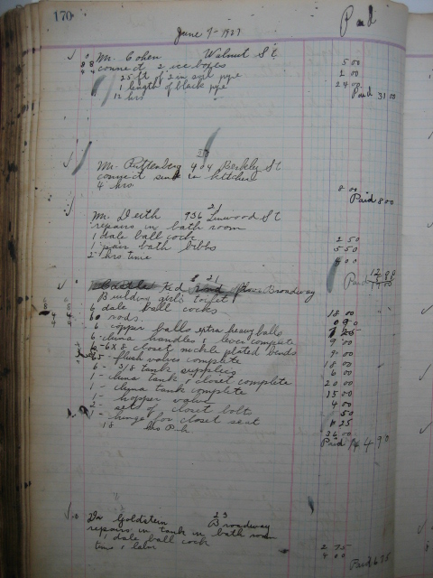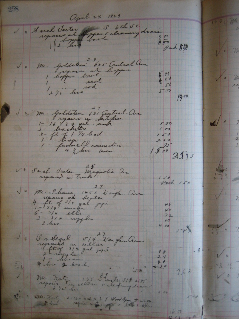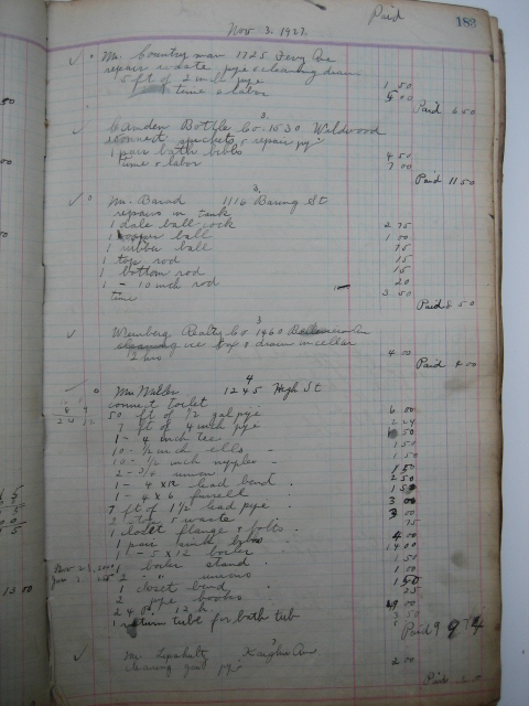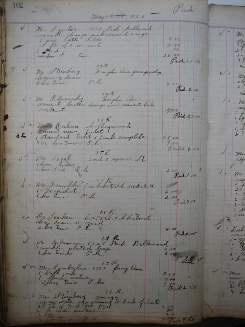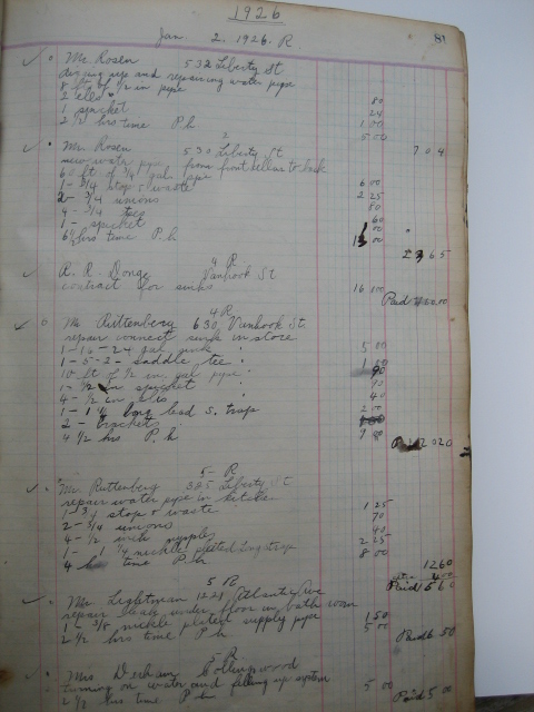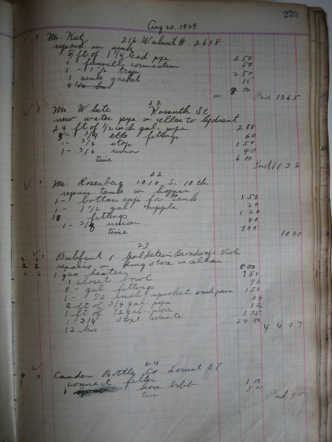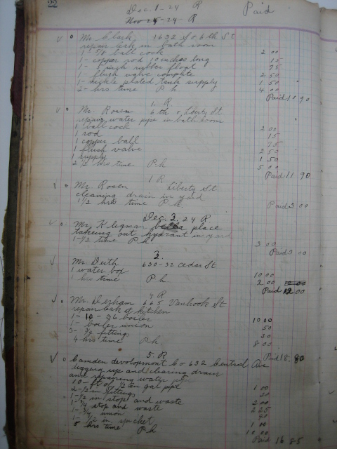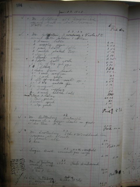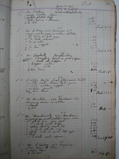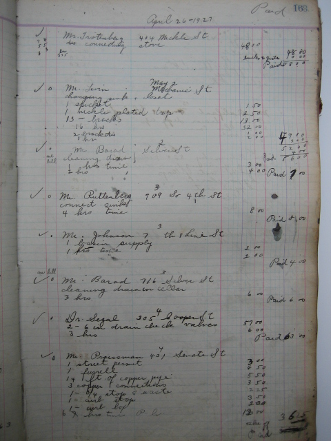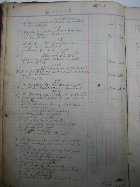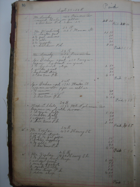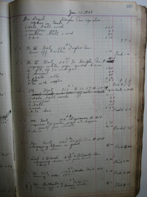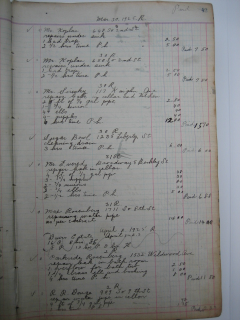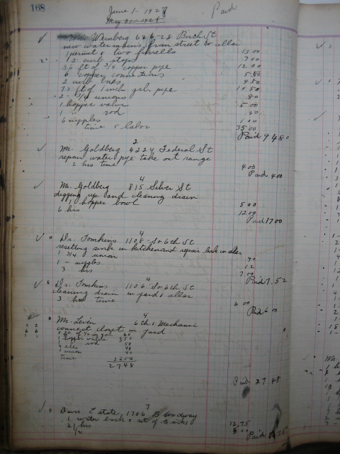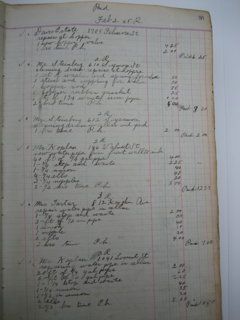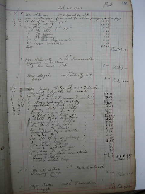 Ross Plumbing was the business of the Ross family, and bore the name of its founder, Isreal Ross, who went into business as a plumbing and heating contractor in 1918. He had previously partnered with Francis Bicker Jr., son of Dr. Francis Bicker, a well known physician in Camden's Eighth Ward. He may still have been in business with Bicker into the 1920s. By January of 1920 Isreal Ross and his wife, the former Annie Silverman, had bought a house at 1145 Baring Street. Annie Silverman was the daughter of Becky Silverman, who owned an operated a clothing business at 299 Kaighn Avenue, the corner of South 3rd Street and Kaighn Avenue. A set of journals that begin in 1924 seem to indicate that the partnership with Francis Bicker Jr. had dissolved, and that Isreal Ross had started his own business. These journals, presented here, show every job that Isreal Ross undertook, indicate that he worked for many people who were or would become well known in Camden. He also had begun doing work for various real estate operators. Sometime after the fall of 1936 Israel Ross acquired the building at 1142 South 6th Street, where the Tarter family had once conducted a bottling business. Isreal Ross lived and operated his business here, the Ross Plumbing & Heating Company, through at least 1947. By that time sons Edward and Leonard had joined the business. Ross Plumbing and Heating did a great portion of its business with Camden real estate operators and landlords. Some of the larger and more notable clients in the 1930s and 1940s included Benjamin Natal, Theodore Tiedeken, Samuel Gelfand, Louis Richelson, Louis Dorflinger, Ellis Goodman, Zellie Ellis, Joseph and William Lipkin, and Alex Malamut. There was also institutional work, for the Talmud Torah building, churches and synagogues, and Belleview Hospital. They also did work for several Camden physicians, including Dr. Ulysses Wiggins, Dr. William Lashman, and Dr. Marcus Wheatland. Commercial accounts included Trilling & Montague, a company involved with many of the bar businesses in Camden, Quality Drugs, and several businesses on Broadway, Kaighn Avenue, and throughout the city. They also worked for several Building and Loan Associations and the Federal Deposit Insurance Corporation's real estate operation. Isreal Ross passed away on April 12, 1962. He was buried the following day at Crescent Burial Park in Pennsauken NJ. He was survived by his wife and sons, who carried the business forward. Anna Silverman Ross passed away in Cherry Hill NJ in 1993. The Ross Plumbing and Heating Company was still operating on South 6th Street as late as the fall of 1977, and owned the property into the late 1990s. For more about the the family and business of Isreal and Anna Ross, please visit the following web-pages on on this site: