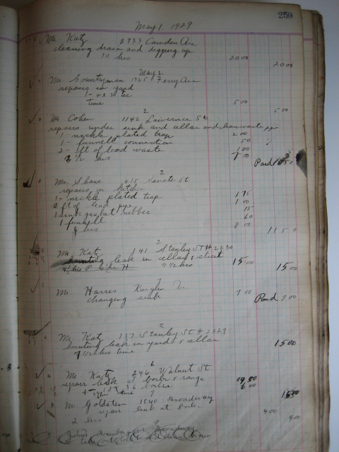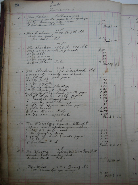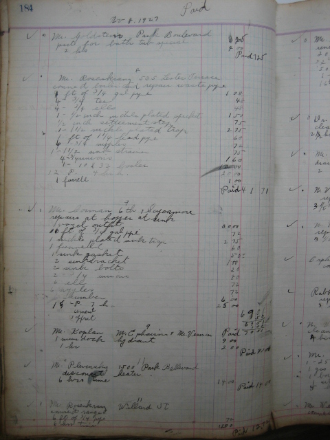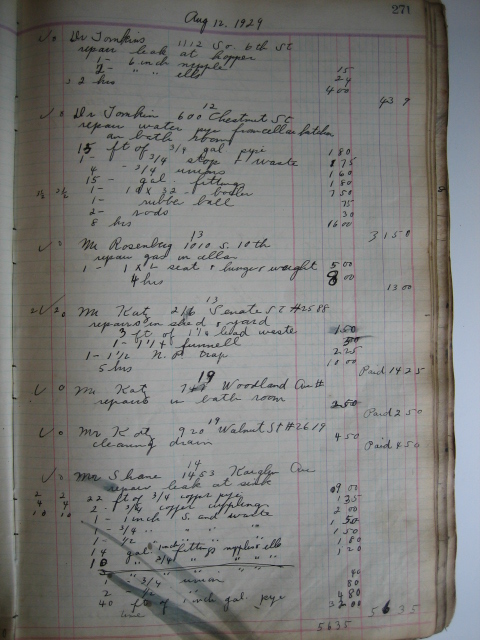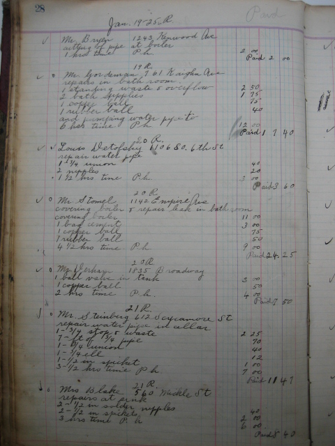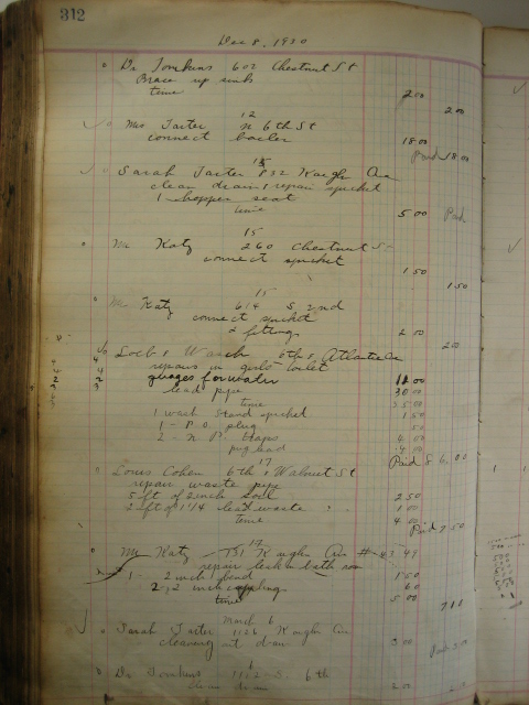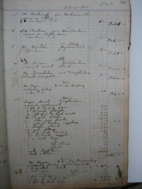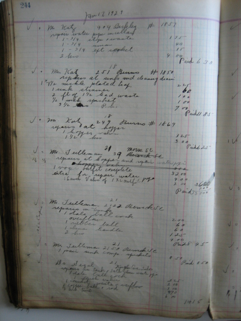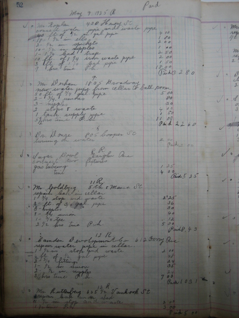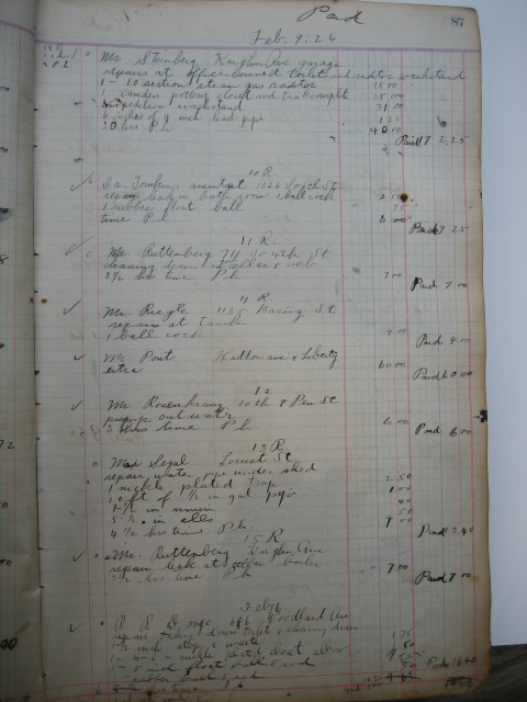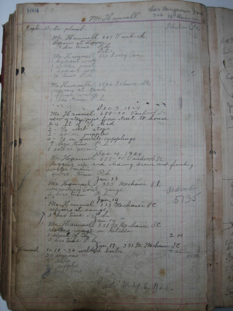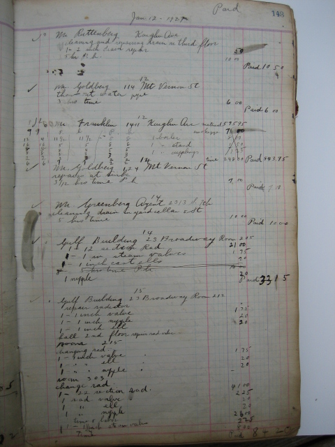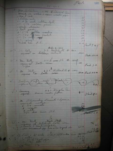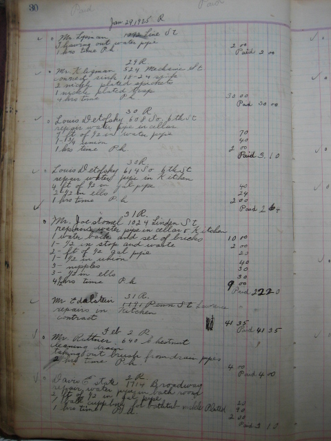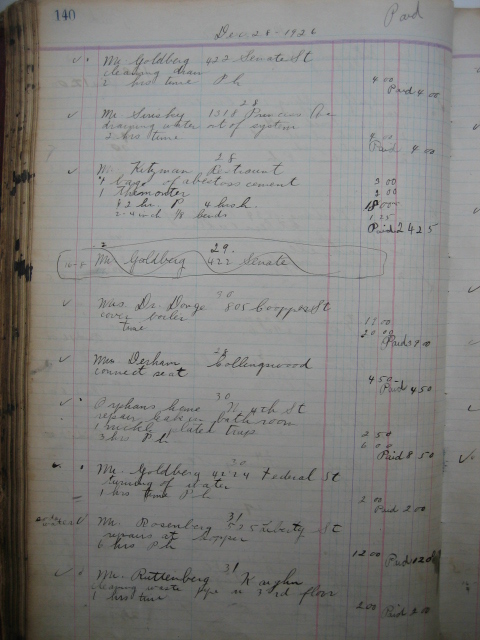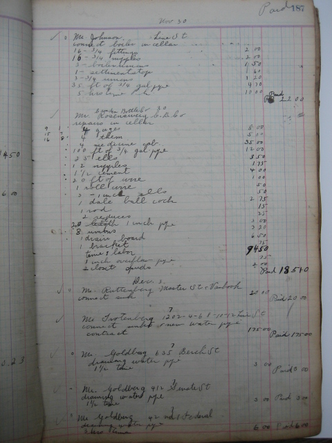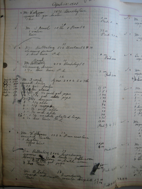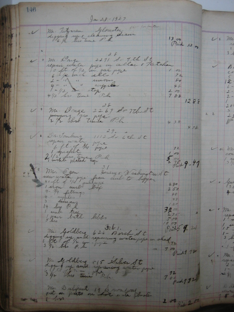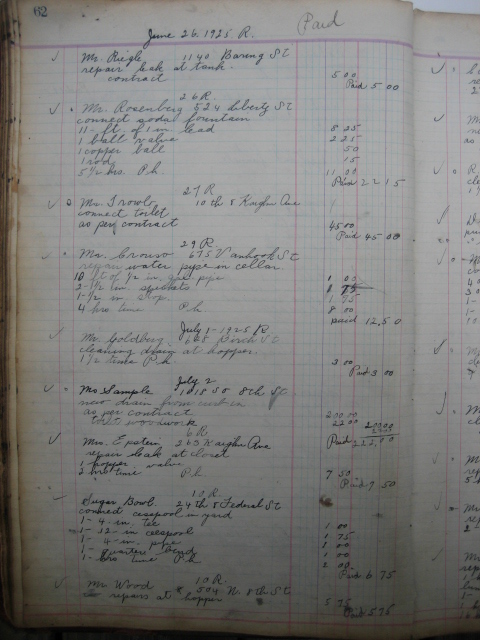 Ross Plumbing was the business of the Ross family, and bore the name of its founder, Isreal Ross, who went into business as a plumbing and heating contractor in 1918. He had previously partnered with Francis Bicker Jr., son of Dr. Francis Bicker, a well known physician in Camden's Eighth Ward. He may still have been in business with Bicker into the 1920s. By January of 1920 Isreal Ross and his wife, the former Annie Silverman, had bought a house at 1145 Baring Street. Annie Silverman was the daughter of Becky Silverman, who owned an operated a clothing business at 299 Kaighn Avenue, the corner of South 3rd Street and Kaighn Avenue. A set of journals that begin in 1924 seem to indicate that the partnership with Francis Bicker Jr. had dissolved, and that Isreal Ross had started his own business. These journals, presented here, show every job that Isreal Ross undertook, indicate that he worked for many people who were or would become well known in Camden. He also had begun doing work for various real estate operators. Sometime after the fall of 1936 Israel Ross acquired the building at 1142 South 6th Street, where the Tarter family had once conducted a bottling business. Isreal Ross lived and operated his business here, the Ross Plumbing & Heating Company, through at least 1947. By that time sons Edward and Leonard had joined the business. Ross Plumbing and Heating did a great portion of its business with Camden real estate operators and landlords. Some of the larger and more notable clients in the 1930s and 1940s included Benjamin Natal, Theodore Tiedeken, Samuel Gelfand, Louis Richelson, Louis Dorflinger, Ellis Goodman, Zellie Ellis, Joseph and William Lipkin, and Alex Malamut. There was also institutional work, for the Talmud Torah building, churches and synagogues, and Belleview Hospital. They also did work for several Camden physicians, including Dr. Ulysses Wiggins, Dr. William Lashman, and Dr. Marcus Wheatland. Commercial accounts included Trilling & Montague, a company involved with many of the bar businesses in Camden, Quality Drugs, and several businesses on Broadway, Kaighn Avenue, and throughout the city. They also worked for several Building and Loan Associations and the Federal Deposit Insurance Corporation's real estate operation. Isreal Ross passed away on April 12, 1962. He was buried the following day at Crescent Burial Park in Pennsauken NJ. He was survived by his wife and sons, who carried the business forward. Anna Silverman Ross passed away in Cherry Hill NJ in 1993. The Ross Plumbing and Heating Company was still operating on South 6th Street as late as the fall of 1977, and owned the property into the late 1990s. For more about the the family and business of Isreal and Anna Ross, please visit the following web-pages on on this site:
