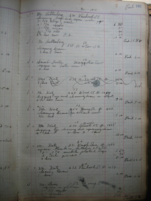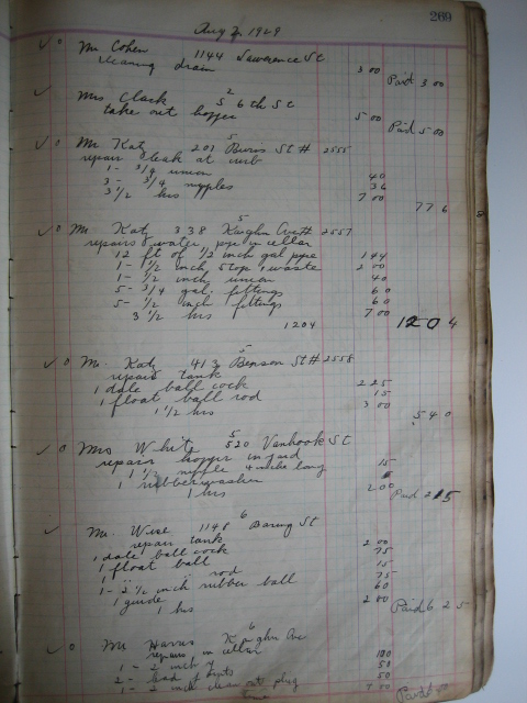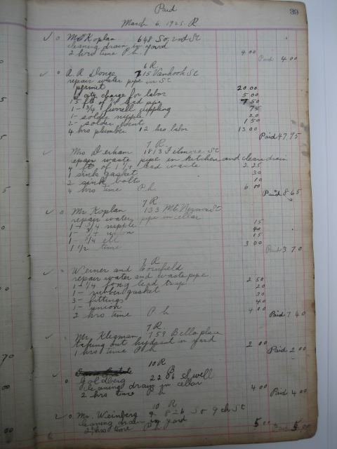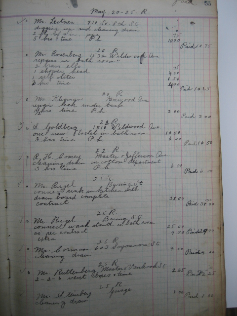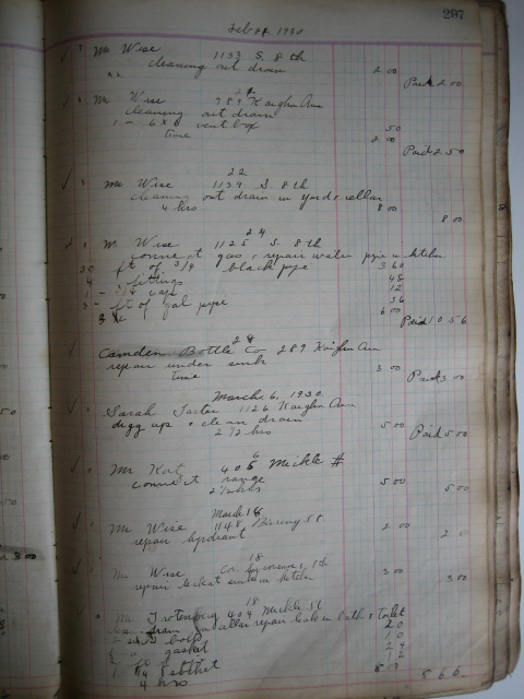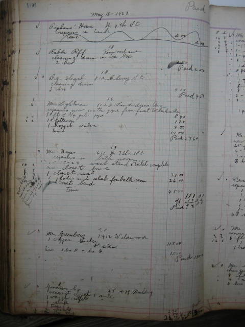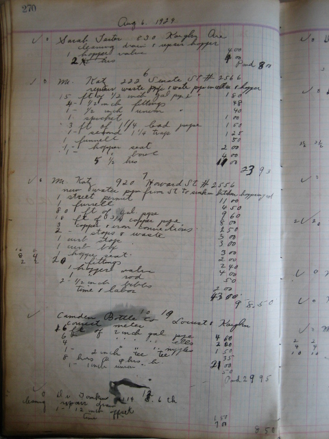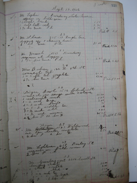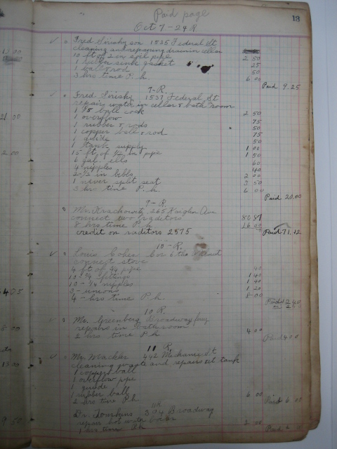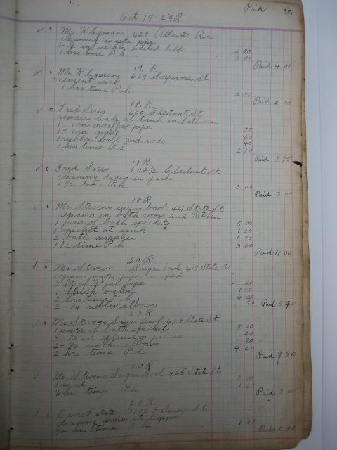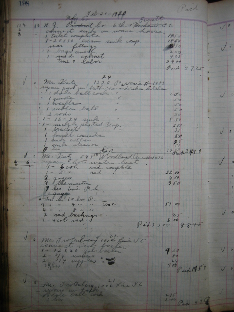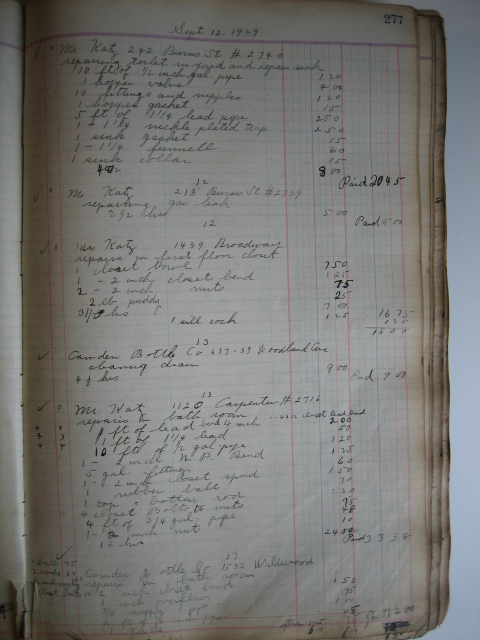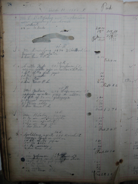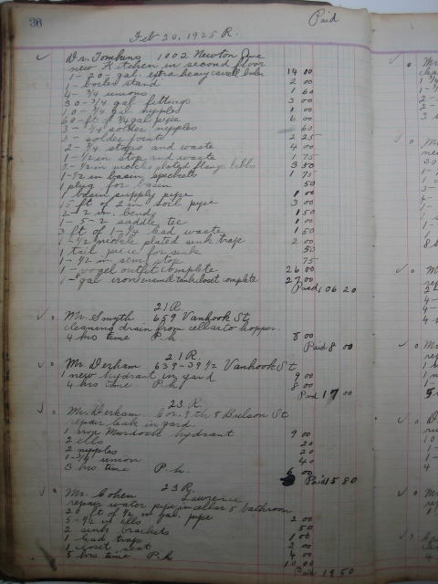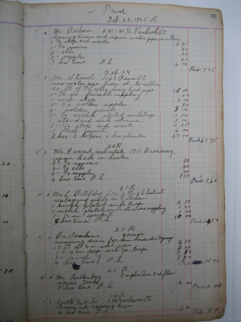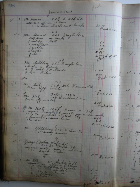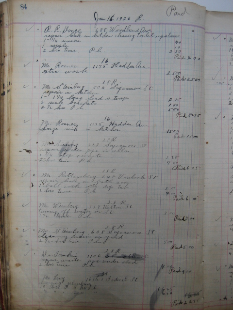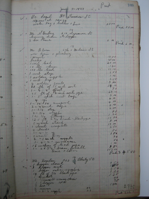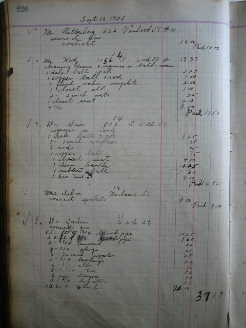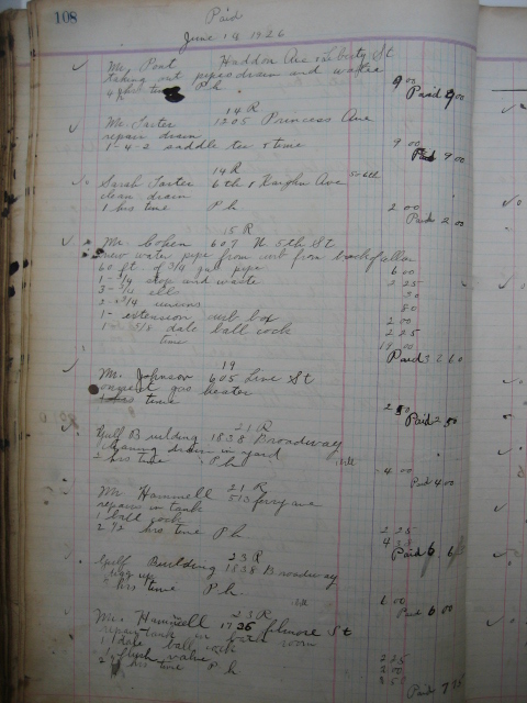Ross Plumbing was the business of the Ross family, and bore the name of its founder, Isreal Ross, who went into business as a plumbing and heating contractor in 1918. He had previously partnered with Francis Bicker Jr., son of Dr. Francis Bicker, a well known physician in Camden's Eighth Ward. He may still have been in business with Bicker into the 1920s. By January of 1920 Isreal Ross and his wife, the former Annie Silverman, had bought a house at 1145 Baring Street. Annie Silverman was the daughter of Becky Silverman, who owned an operated a clothing business at 299 Kaighn Avenue, the corner of South 3rd Street and Kaighn Avenue. A set of journals that begin in 1924 seem to indicate that the partnership with Francis Bicker Jr. had dissolved, and that Isreal Ross had started his own business. These journals, presented here, show every job that Isreal Ross undertook, indicate that he worked for many people who were or would become well known in Camden. He also had begun doing work for various real estate operators. Sometime after the fall of 1936 Israel Ross acquired the building at 1142 South 6th Street, where the Tarter family had once conducted a bottling business. Isreal Ross lived and operated his business here, the Ross Plumbing & Heating Company, through at least 1947. By that time sons Edward and Leonard had joined the business. Ross Plumbing and Heating did a great portion of its business with Camden real estate operators and landlords. Some of the larger and more notable clients in the 1930s and 1940s included Benjamin Natal, Theodore Tiedeken, Samuel Gelfand, Louis Richelson, Louis Dorflinger, Ellis Goodman, Zellie Ellis, Joseph and William Lipkin, and Alex Malamut. There was also institutional work, for the Talmud Torah building, churches and synagogues, and Belleview Hospital. They also did work for several Camden physicians, including Dr. Ulysses Wiggins, Dr. William Lashman, and Dr. Marcus Wheatland. Commercial accounts included Trilling & Montague, a company involved with many of the bar businesses in Camden, Quality Drugs, and several businesses on Broadway, Kaighn Avenue, and throughout the city. They also worked for several Building and Loan Associations and the Federal Deposit Insurance Corporation's real estate operation. Isreal Ross passed away on April 12, 1962. He was buried the following day at Crescent Burial Park in Pennsauken NJ. He was survived by his wife and sons, who carried the business forward. Anna Silverman Ross passed away in Cherry Hill NJ in 1993. The Ross Plumbing and Heating Company was still operating on South 6th Street as late as the fall of 1977, and owned the property into the late 1990s. For more about the the family and business of Isreal and Anna Ross, please visit the following web-pages on on this site: