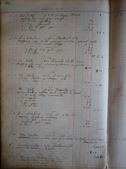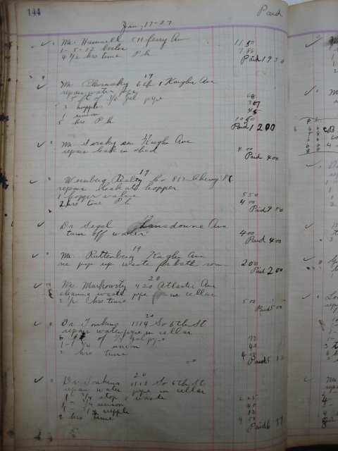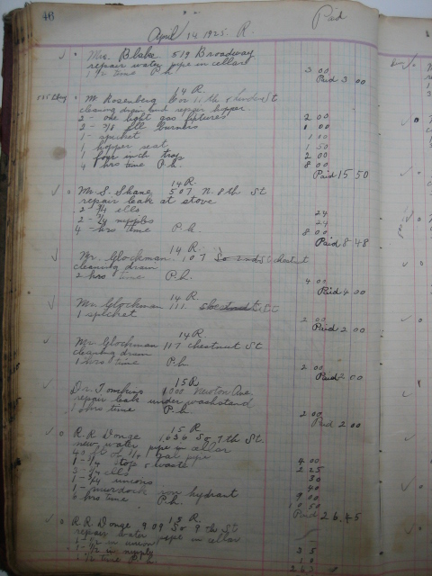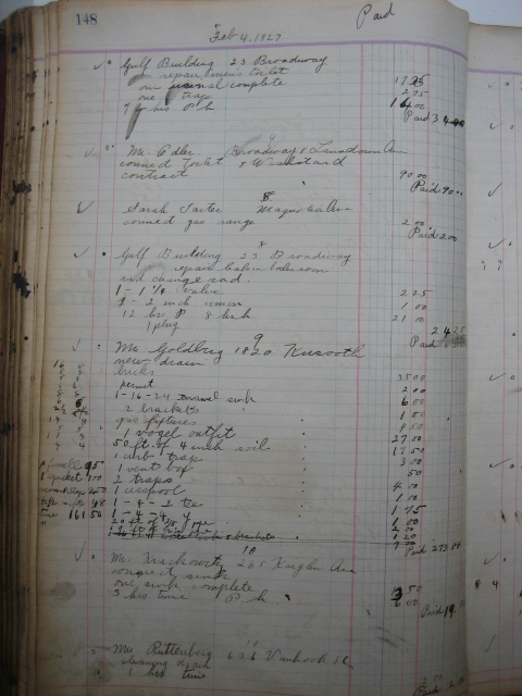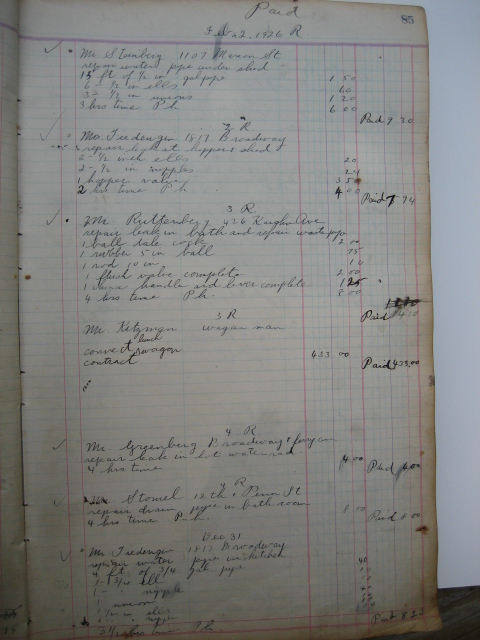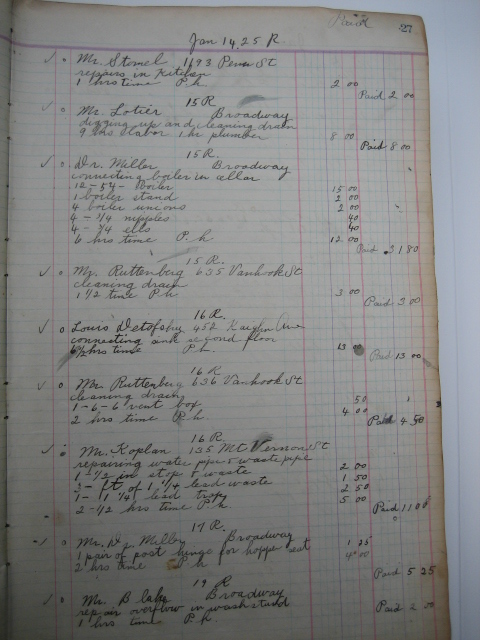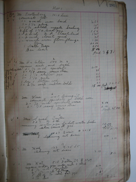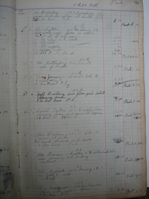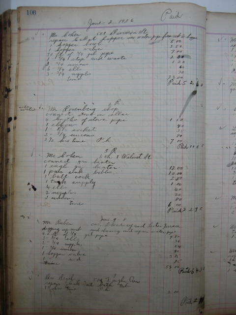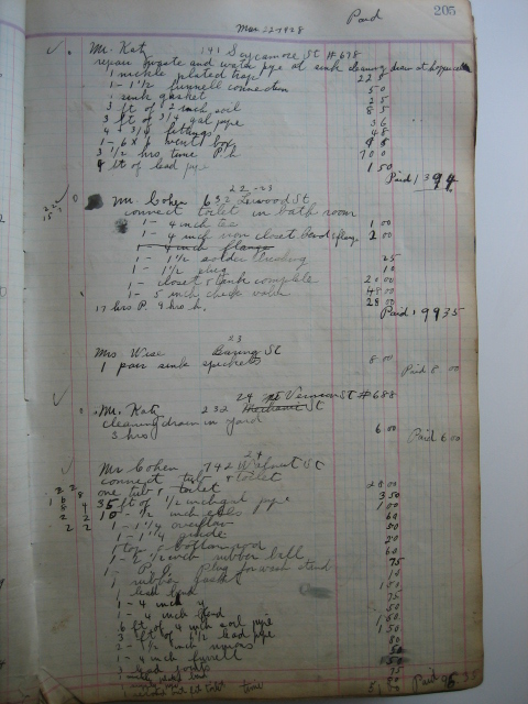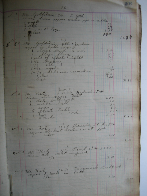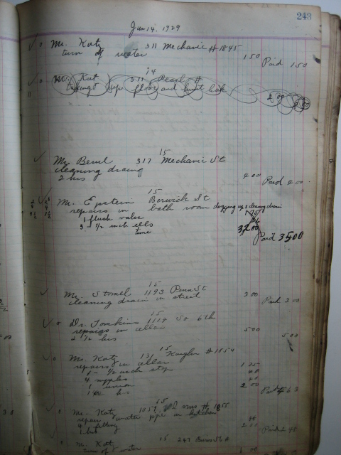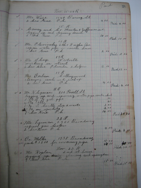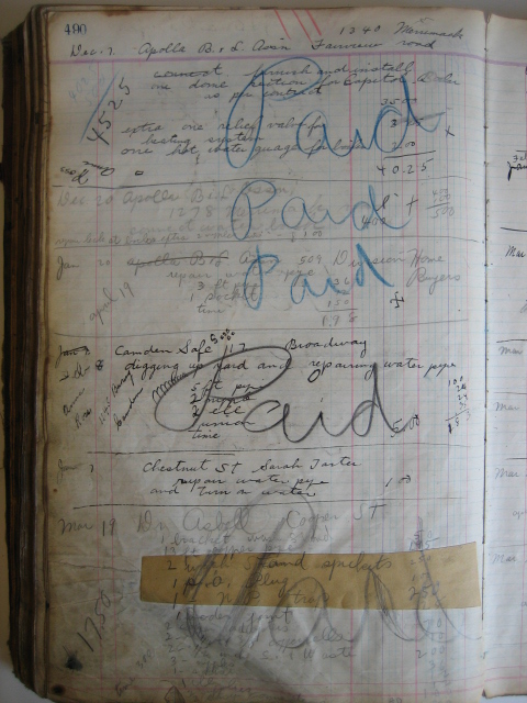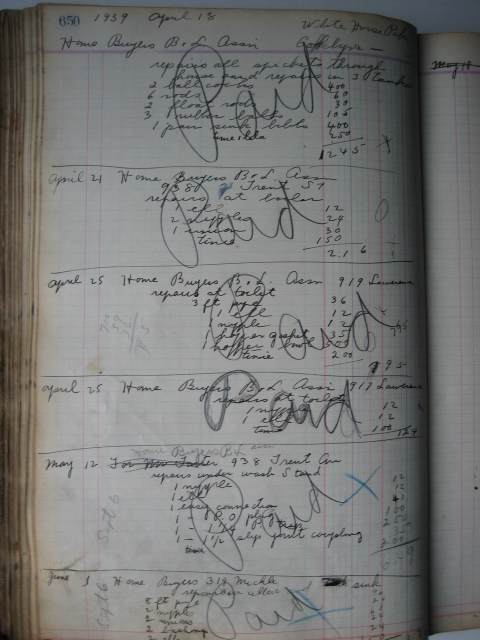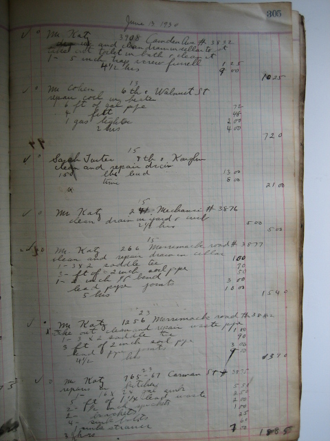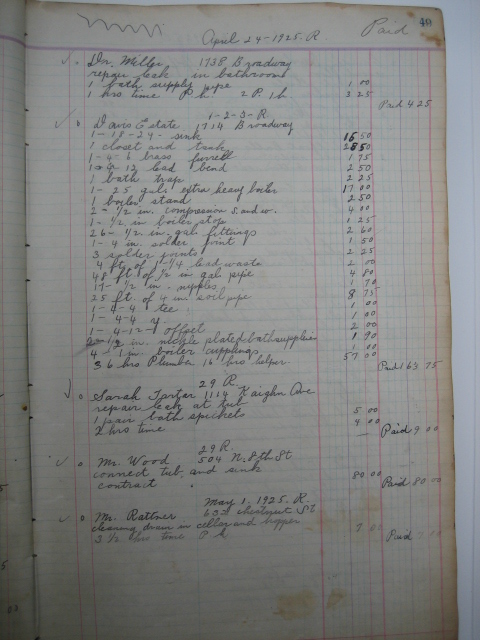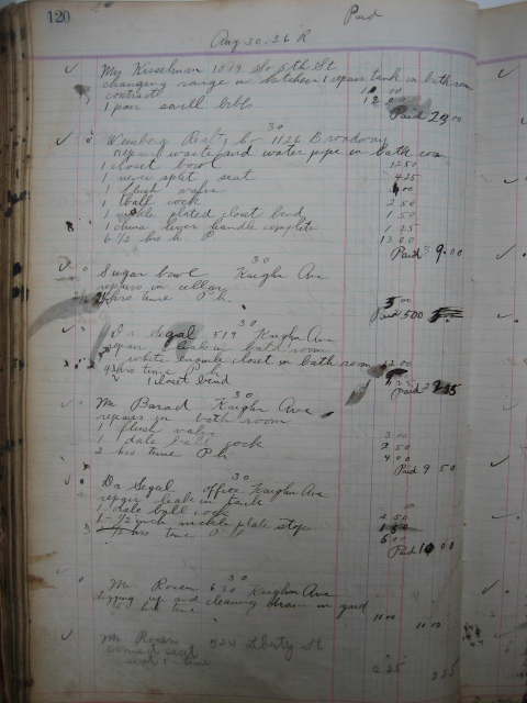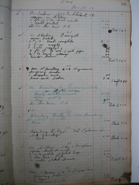 Ross Plumbing was the business of the Ross family, and bore the name of its founder, Isreal Ross, who went into business as a plumbing and heating contractor in 1918. He had previously partnered with Francis Bicker Jr., son of Dr. Francis Bicker, a well known physician in Camden's Eighth Ward. He may still have been in business with Bicker into the 1920s. By January of 1920 Isreal Ross and his wife, the former Annie Silverman, had bought a house at 1145 Baring Street. Annie Silverman was the daughter of Becky Silverman, who owned an operated a clothing business at 299 Kaighn Avenue, the corner of South 3rd Street and Kaighn Avenue. A set of journals that begin in 1924 seem to indicate that the partnership with Francis Bicker Jr. had dissolved, and that Isreal Ross had started his own business. These journals, presented here, show every job that Isreal Ross undertook, indicate that he worked for many people who were or would become well known in Camden. He also had begun doing work for various real estate operators. Sometime after the fall of 1936 Israel Ross acquired the building at 1142 South 6th Street, where the Tarter family had once conducted a bottling business. Isreal Ross lived and operated his business here, the Ross Plumbing & Heating Company, through at least 1947. By that time sons Edward and Leonard had joined the business. Ross Plumbing and Heating did a great portion of its business with Camden real estate operators and landlords. Some of the larger and more notable clients in the 1930s and 1940s included Benjamin Natal, Theodore Tiedeken, Samuel Gelfand, Louis Richelson, Louis Dorflinger, Ellis Goodman, Zellie Ellis, Joseph and William Lipkin, and Alex Malamut. There was also institutional work, for the Talmud Torah building, churches and synagogues, and Belleview Hospital. They also did work for several Camden physicians, including Dr. Ulysses Wiggins, Dr. William Lashman, and Dr. Marcus Wheatland. Commercial accounts included Trilling & Montague, a company involved with many of the bar businesses in Camden, Quality Drugs, and several businesses on Broadway, Kaighn Avenue, and throughout the city. They also worked for several Building and Loan Associations and the Federal Deposit Insurance Corporation's real estate operation. Isreal Ross passed away on April 12, 1962. He was buried the following day at Crescent Burial Park in Pennsauken NJ. He was survived by his wife and sons, who carried the business forward. Anna Silverman Ross passed away in Cherry Hill NJ in 1993. The Ross Plumbing and Heating Company was still operating on South 6th Street as late as the fall of 1977, and owned the property into the late 1990s. For more about the the family and business of Isreal and Anna Ross, please visit the following web-pages on on this site: