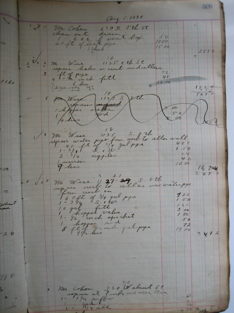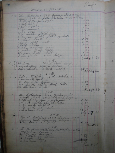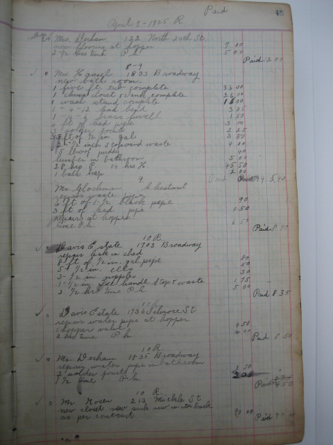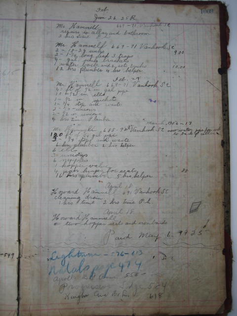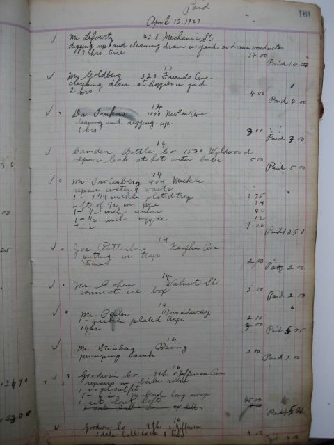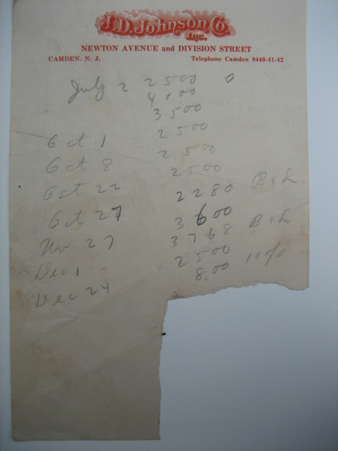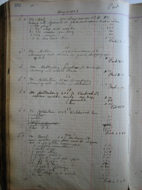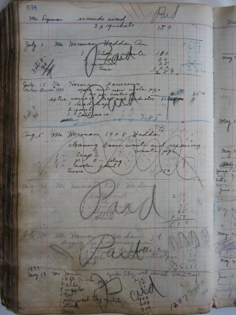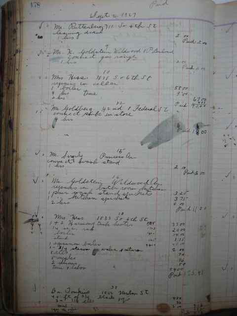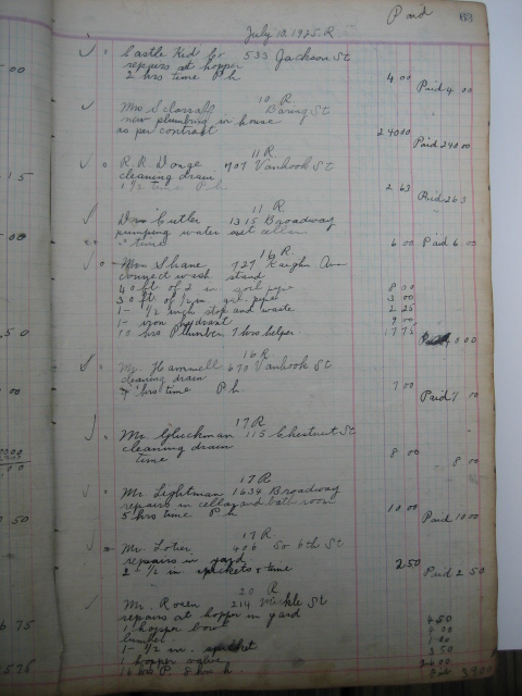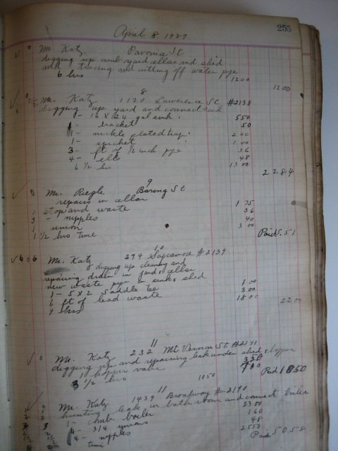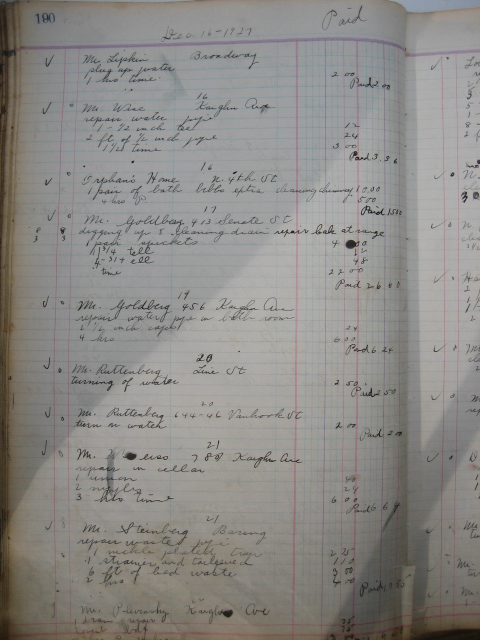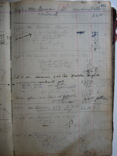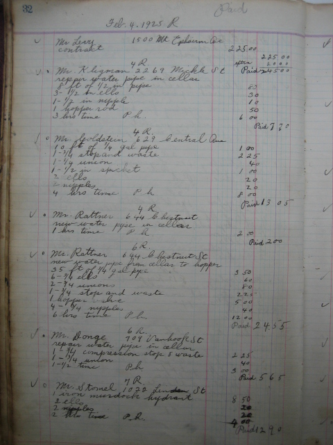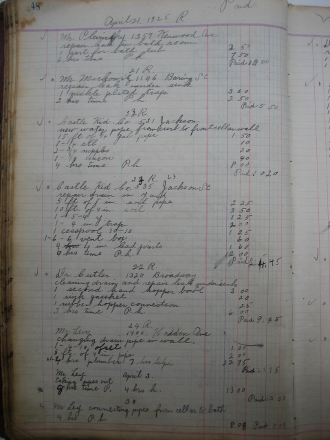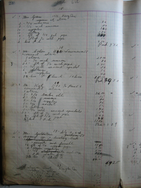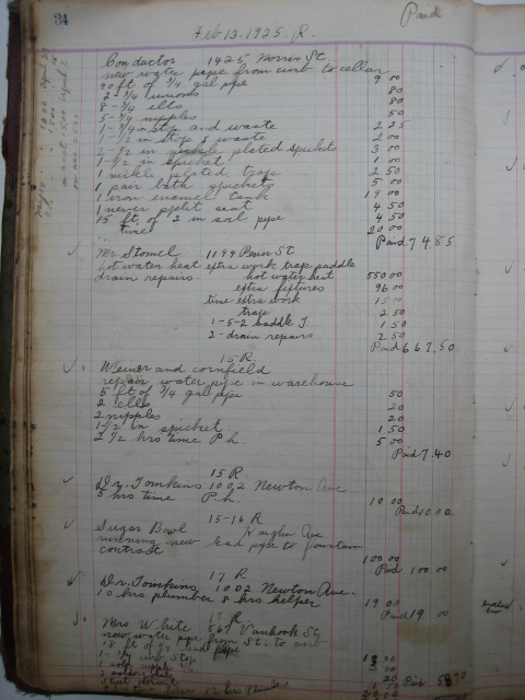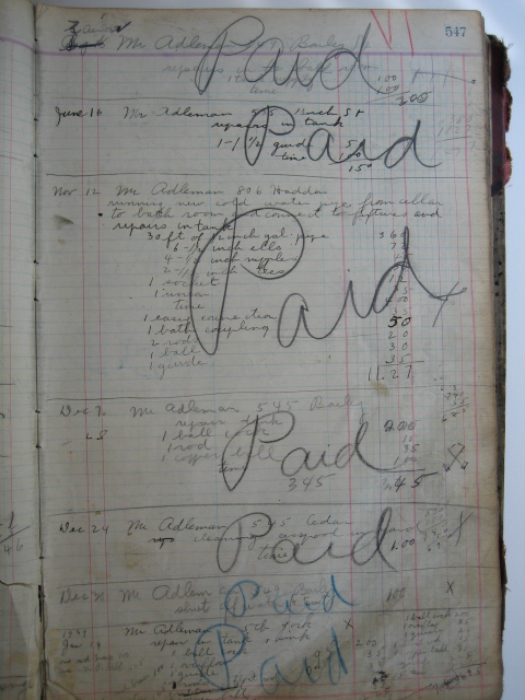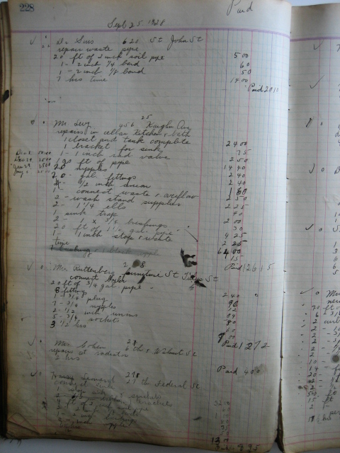 Ross Plumbing was the business of the Ross family, and bore the name of its founder, Isreal Ross, who went into business as a plumbing and heating contractor in 1918. He had previously partnered with Francis Bicker Jr., son of Dr. Francis Bicker, a well known physician in Camden's Eighth Ward. He may still have been in business with Bicker into the 1920s. By January of 1920 Isreal Ross and his wife, the former Annie Silverman, had bought a house at 1145 Baring Street. Annie Silverman was the daughter of Becky Silverman, who owned an operated a clothing business at 299 Kaighn Avenue, the corner of South 3rd Street and Kaighn Avenue. A set of journals that begin in 1924 seem to indicate that the partnership with Francis Bicker Jr. had dissolved, and that Isreal Ross had started his own business. These journals, presented here, show every job that Isreal Ross undertook, indicate that he worked for many people who were or would become well known in Camden. He also had begun doing work for various real estate operators. Sometime after the fall of 1936 Israel Ross acquired the building at 1142 South 6th Street, where the Tarter family had once conducted a bottling business. Isreal Ross lived and operated his business here, the Ross Plumbing & Heating Company, through at least 1947. By that time sons Edward and Leonard had joined the business. Ross Plumbing and Heating did a great portion of its business with Camden real estate operators and landlords. Some of the larger and more notable clients in the 1930s and 1940s included Benjamin Natal, Theodore Tiedeken, Samuel Gelfand, Louis Richelson, Louis Dorflinger, Ellis Goodman, Zellie Ellis, Joseph and William Lipkin, and Alex Malamut. There was also institutional work, for the Talmud Torah building, churches and synagogues, and Belleview Hospital. They also did work for several Camden physicians, including Dr. Ulysses Wiggins, Dr. William Lashman, and Dr. Marcus Wheatland. Commercial accounts included Trilling & Montague, a company involved with many of the bar businesses in Camden, Quality Drugs, and several businesses on Broadway, Kaighn Avenue, and throughout the city. They also worked for several Building and Loan Associations and the Federal Deposit Insurance Corporation's real estate operation. Isreal Ross passed away on April 12, 1962. He was buried the following day at Crescent Burial Park in Pennsauken NJ. He was survived by his wife and sons, who carried the business forward. Anna Silverman Ross passed away in Cherry Hill NJ in 1993. The Ross Plumbing and Heating Company was still operating on South 6th Street as late as the fall of 1977, and owned the property into the late 1990s. For more about the the family and business of Isreal and Anna Ross, please visit the following web-pages on on this site: