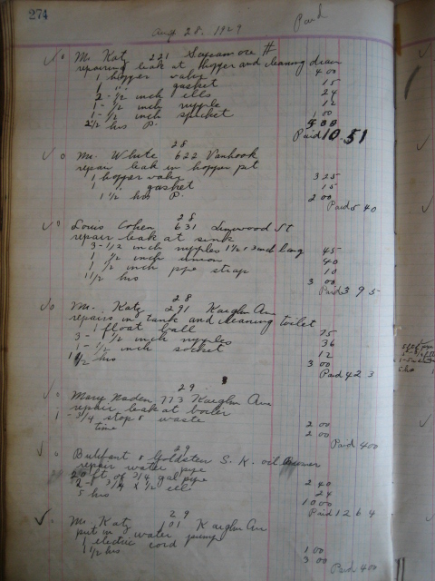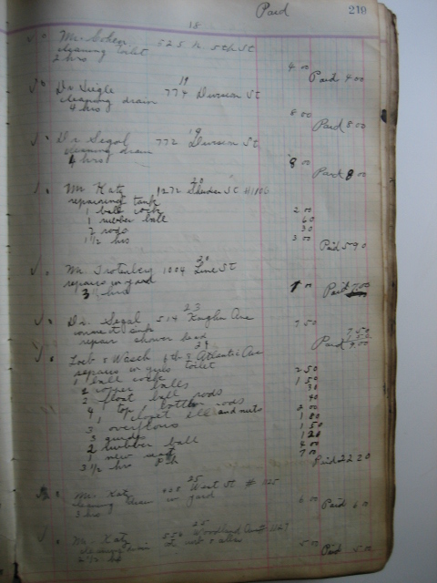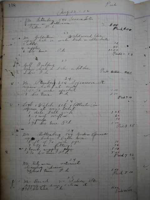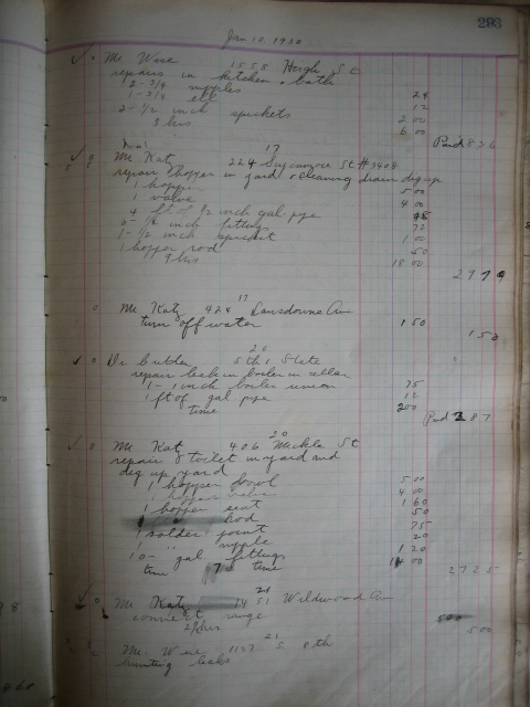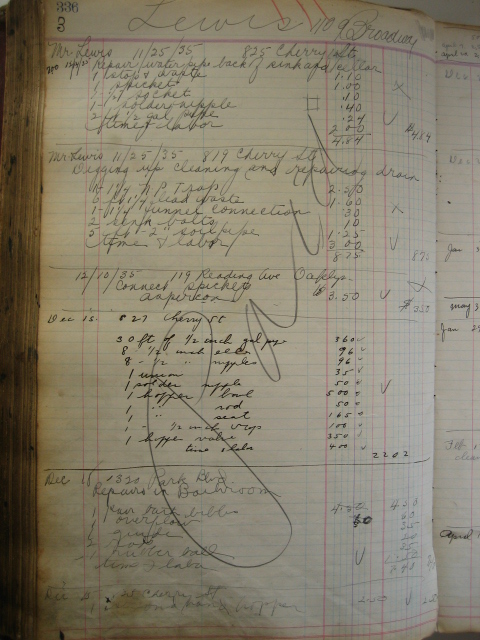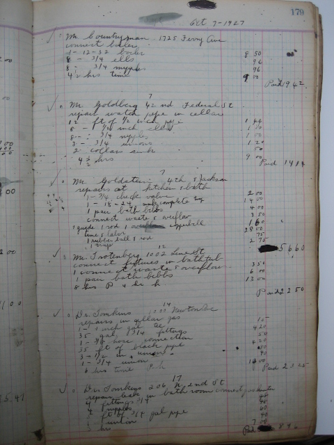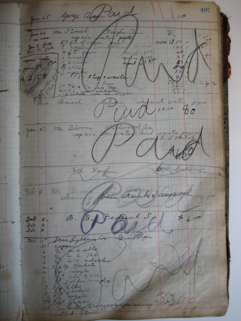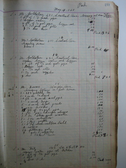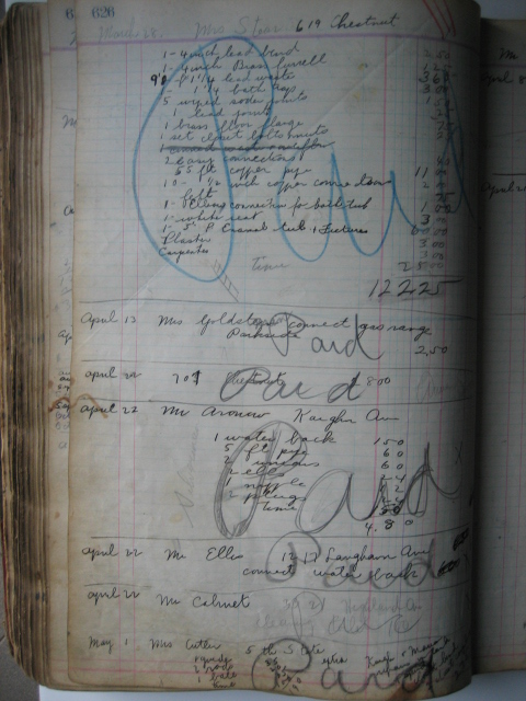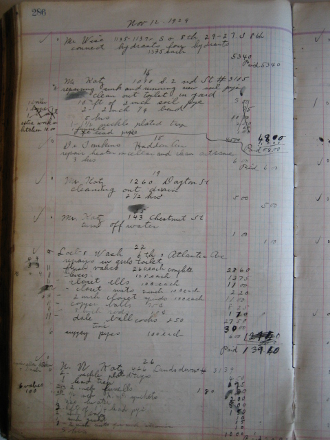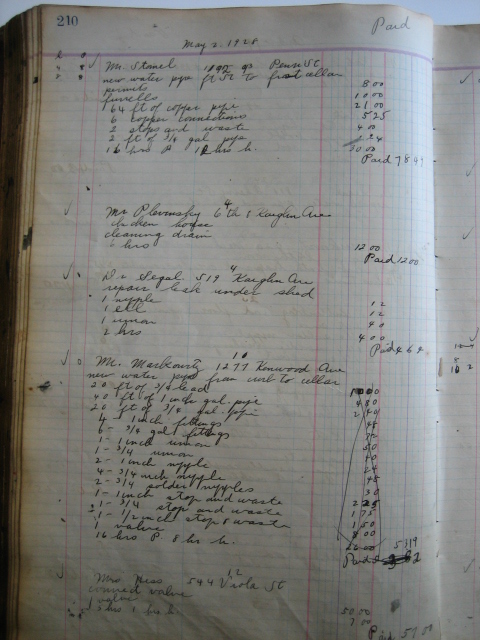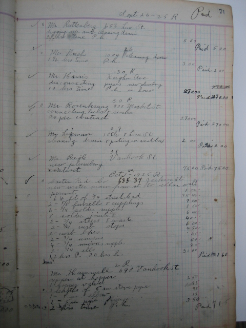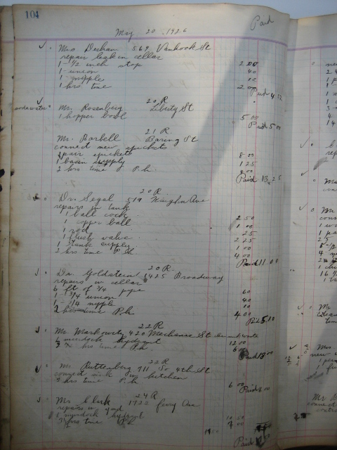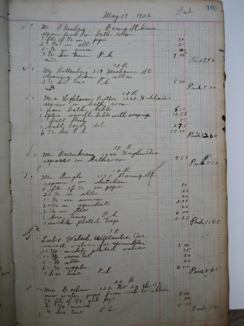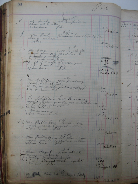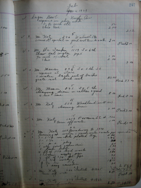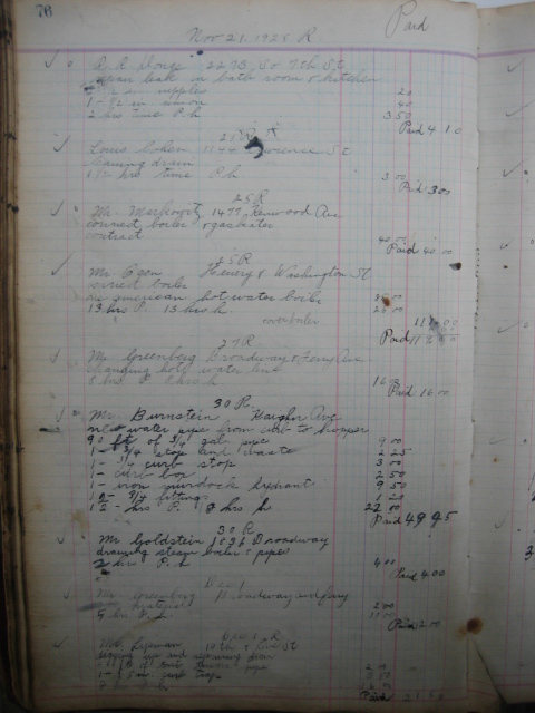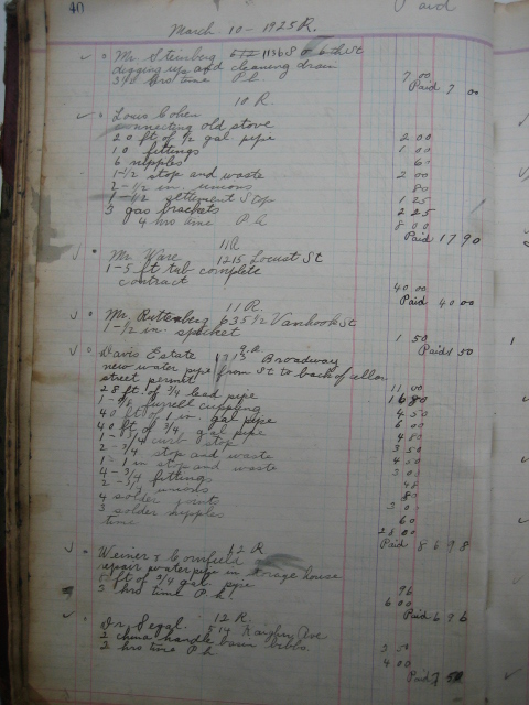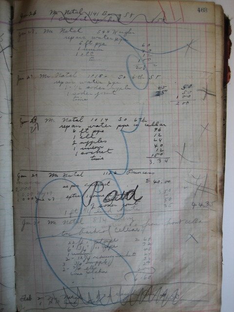 Ross Plumbing was the business of the Ross family, and bore the name of its founder, Isreal Ross, who went into business as a plumbing and heating contractor in 1918. He had previously partnered with Francis Bicker Jr., son of Dr. Francis Bicker, a well known physician in Camden's Eighth Ward. He may still have been in business with Bicker into the 1920s. By January of 1920 Isreal Ross and his wife, the former Annie Silverman, had bought a house at 1145 Baring Street. Annie Silverman was the daughter of Becky Silverman, who owned an operated a clothing business at 299 Kaighn Avenue, the corner of South 3rd Street and Kaighn Avenue. A set of journals that begin in 1924 seem to indicate that the partnership with Francis Bicker Jr. had dissolved, and that Isreal Ross had started his own business. These journals, presented here, show every job that Isreal Ross undertook, indicate that he worked for many people who were or would become well known in Camden. He also had begun doing work for various real estate operators. Sometime after the fall of 1936 Israel Ross acquired the building at 1142 South 6th Street, where the Tarter family had once conducted a bottling business. Isreal Ross lived and operated his business here, the Ross Plumbing & Heating Company, through at least 1947. By that time sons Edward and Leonard had joined the business. Ross Plumbing and Heating did a great portion of its business with Camden real estate operators and landlords. Some of the larger and more notable clients in the 1930s and 1940s included Benjamin Natal, Theodore Tiedeken, Samuel Gelfand, Louis Richelson, Louis Dorflinger, Ellis Goodman, Zellie Ellis, Joseph and William Lipkin, and Alex Malamut. There was also institutional work, for the Talmud Torah building, churches and synagogues, and Belleview Hospital. They also did work for several Camden physicians, including Dr. Ulysses Wiggins, Dr. William Lashman, and Dr. Marcus Wheatland. Commercial accounts included Trilling & Montague, a company involved with many of the bar businesses in Camden, Quality Drugs, and several businesses on Broadway, Kaighn Avenue, and throughout the city. They also worked for several Building and Loan Associations and the Federal Deposit Insurance Corporation's real estate operation. Isreal Ross passed away on April 12, 1962. He was buried the following day at Crescent Burial Park in Pennsauken NJ. He was survived by his wife and sons, who carried the business forward. Anna Silverman Ross passed away in Cherry Hill NJ in 1993. The Ross Plumbing and Heating Company was still operating on South 6th Street as late as the fall of 1977, and owned the property into the late 1990s. For more about the the family and business of Isreal and Anna Ross, please visit the following web-pages on on this site:
