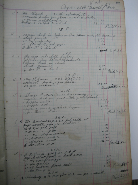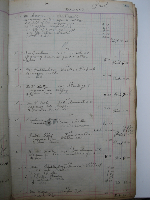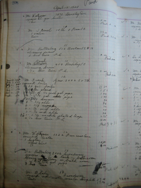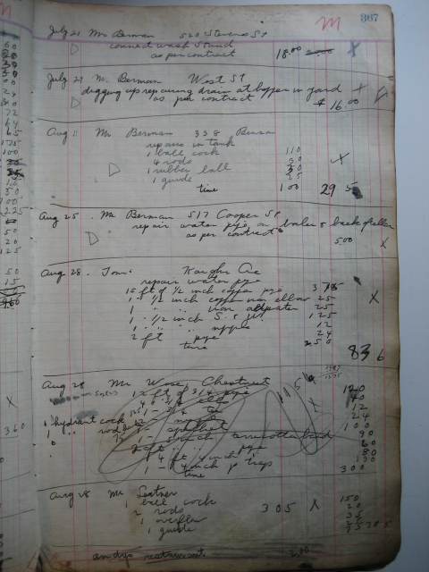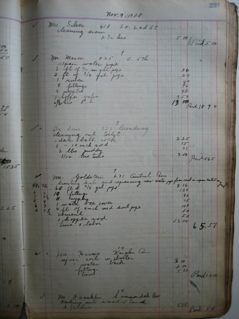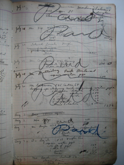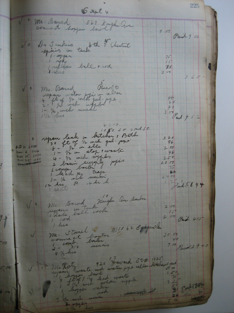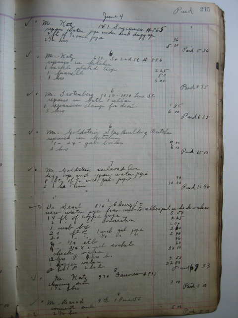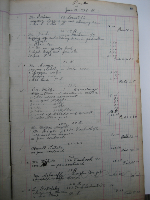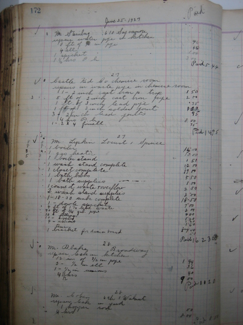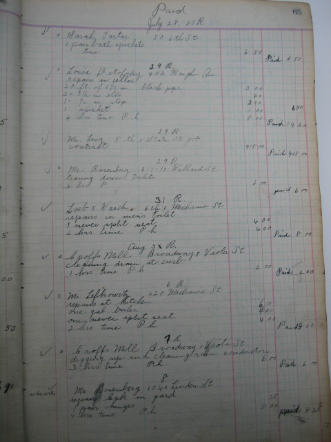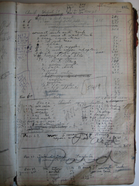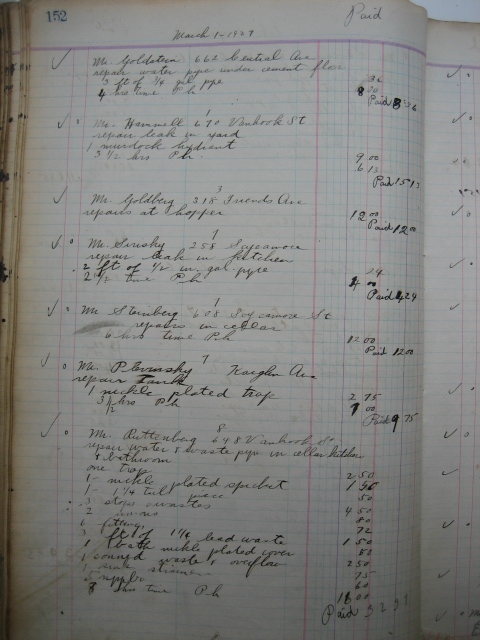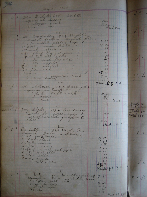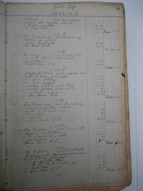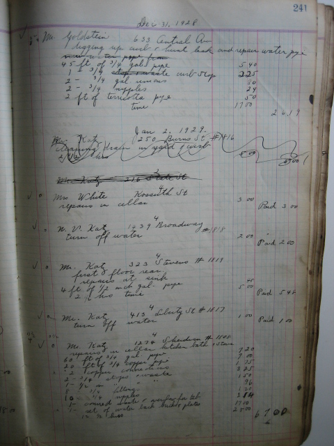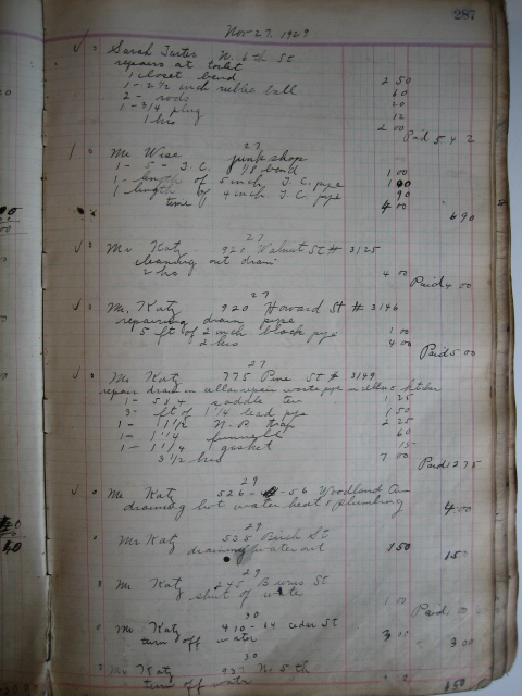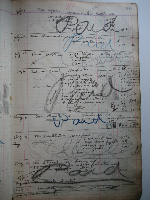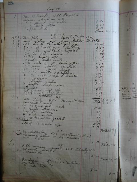Ross Plumbing was the business of the Ross family, and bore the name of its founder, Isreal Ross, who went into business as a plumbing and heating contractor in 1918. He had previously partnered with Francis Bicker Jr., son of Dr. Francis Bicker, a well known physician in Camden's Eighth Ward. He may still have been in business with Bicker into the 1920s. By January of 1920 Isreal Ross and his wife, the former Annie Silverman, had bought a house at 1145 Baring Street. Annie Silverman was the daughter of Becky Silverman, who owned an operated a clothing business at 299 Kaighn Avenue, the corner of South 3rd Street and Kaighn Avenue. A set of journals that begin in 1924 seem to indicate that the partnership with Francis Bicker Jr. had dissolved, and that Isreal Ross had started his own business. These journals, presented here, show every job that Isreal Ross undertook, indicate that he worked for many people who were or would become well known in Camden. He also had begun doing work for various real estate operators. Sometime after the fall of 1936 Israel Ross acquired the building at 1142 South 6th Street, where the Tarter family had once conducted a bottling business. Isreal Ross lived and operated his business here, the Ross Plumbing & Heating Company, through at least 1947. By that time sons Edward and Leonard had joined the business. Ross Plumbing and Heating did a great portion of its business with Camden real estate operators and landlords. Some of the larger and more notable clients in the 1930s and 1940s included Benjamin Natal, Theodore Tiedeken, Samuel Gelfand, Louis Richelson, Louis Dorflinger, Ellis Goodman, Zellie Ellis, Joseph and William Lipkin, and Alex Malamut. There was also institutional work, for the Talmud Torah building, churches and synagogues, and Belleview Hospital. They also did work for several Camden physicians, including Dr. Ulysses Wiggins, Dr. William Lashman, and Dr. Marcus Wheatland. Commercial accounts included Trilling & Montague, a company involved with many of the bar businesses in Camden, Quality Drugs, and several businesses on Broadway, Kaighn Avenue, and throughout the city. They also worked for several Building and Loan Associations and the Federal Deposit Insurance Corporation's real estate operation. Isreal Ross passed away on April 12, 1962. He was buried the following day at Crescent Burial Park in Pennsauken NJ. He was survived by his wife and sons, who carried the business forward. Anna Silverman Ross passed away in Cherry Hill NJ in 1993. The Ross Plumbing and Heating Company was still operating on South 6th Street as late as the fall of 1977, and owned the property into the late 1990s. For more about the the family and business of Isreal and Anna Ross, please visit the following web-pages on on this site: