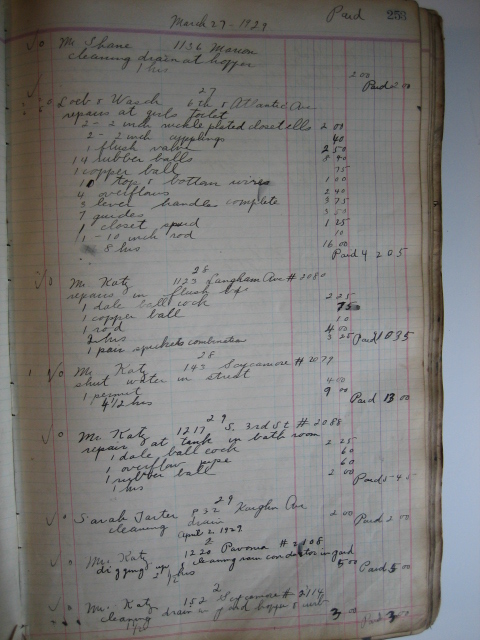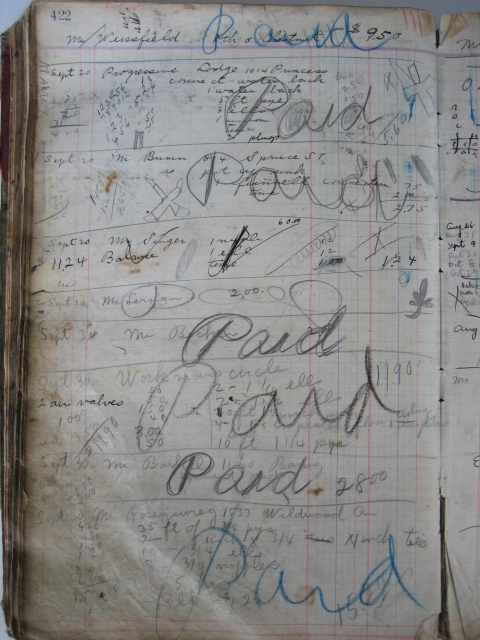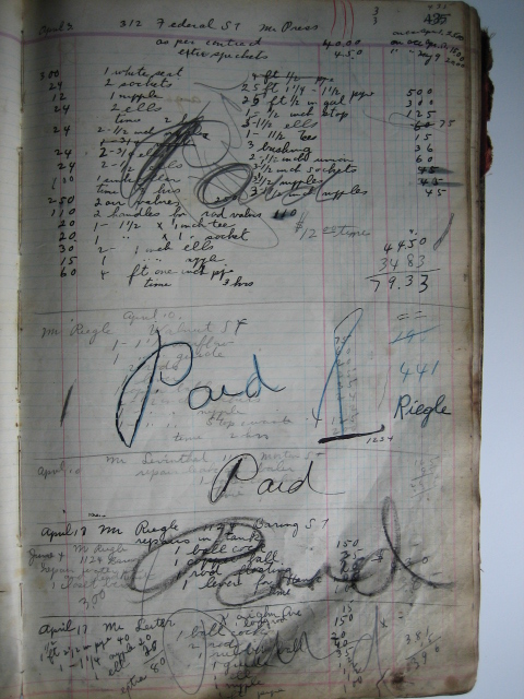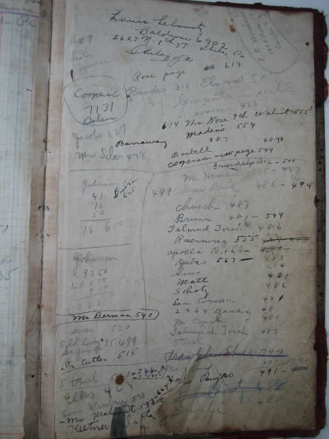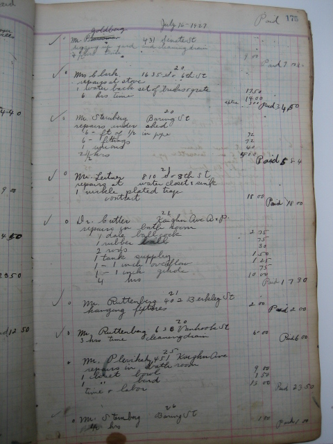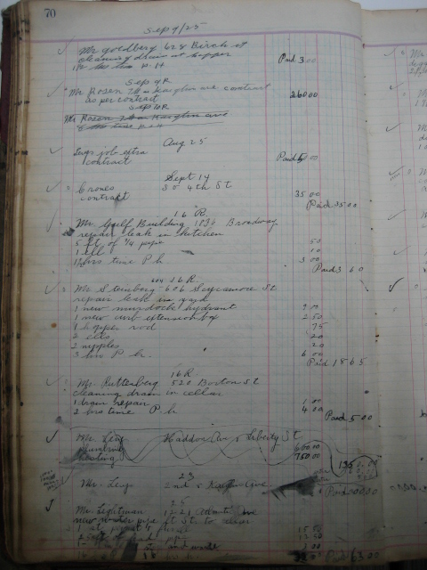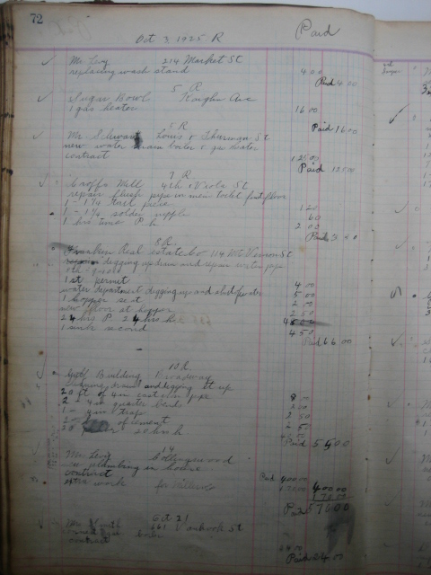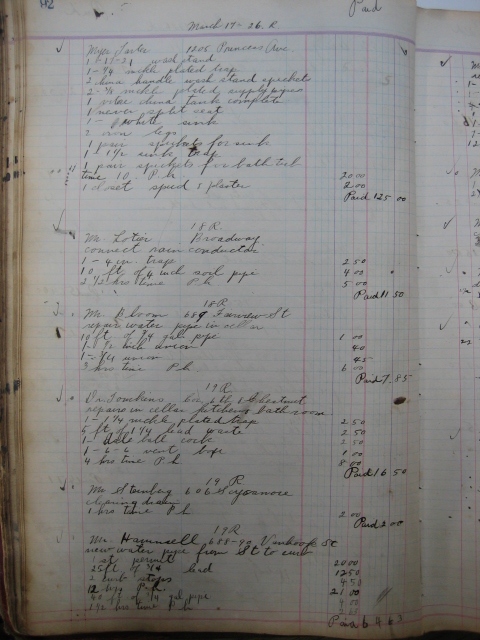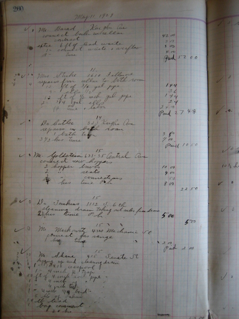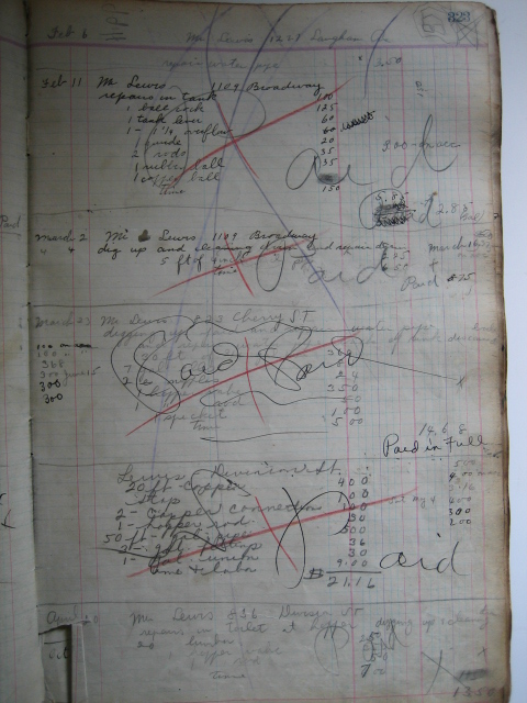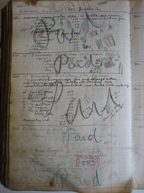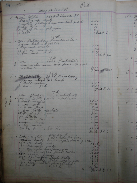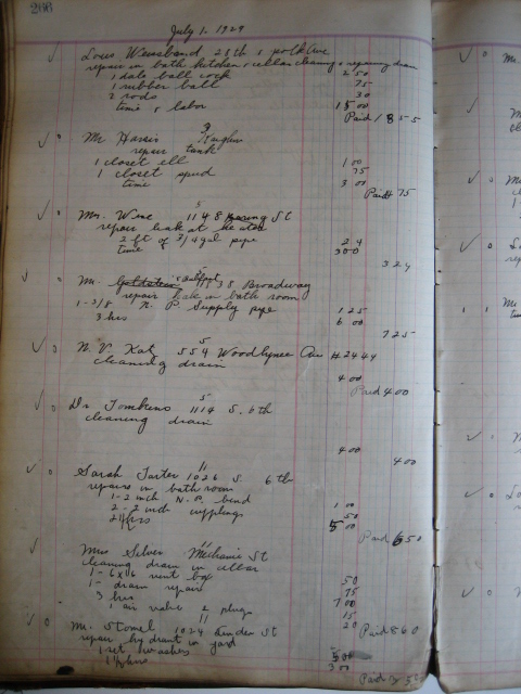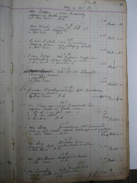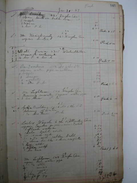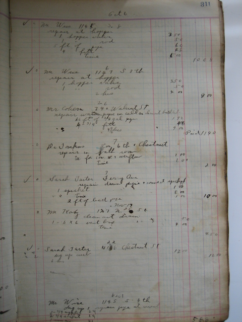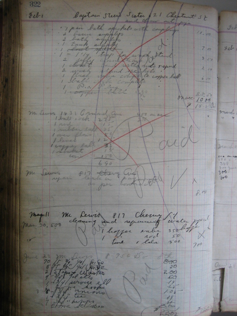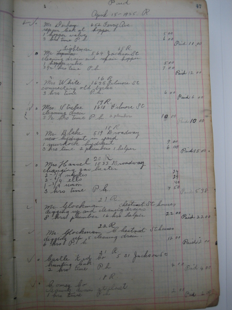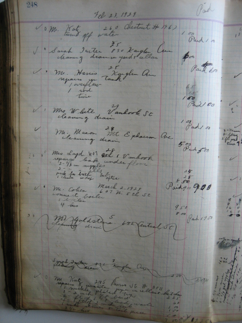 Ross Plumbing was the business of the Ross family, and bore the name of its founder, Isreal Ross, who went into business as a plumbing and heating contractor in 1918. He had previously partnered with Francis Bicker Jr., son of Dr. Francis Bicker, a well known physician in Camden's Eighth Ward. He may still have been in business with Bicker into the 1920s. By January of 1920 Isreal Ross and his wife, the former Annie Silverman, had bought a house at 1145 Baring Street. Annie Silverman was the daughter of Becky Silverman, who owned an operated a clothing business at 299 Kaighn Avenue, the corner of South 3rd Street and Kaighn Avenue. A set of journals that begin in 1924 seem to indicate that the partnership with Francis Bicker Jr. had dissolved, and that Isreal Ross had started his own business. These journals, presented here, show every job that Isreal Ross undertook, indicate that he worked for many people who were or would become well known in Camden. He also had begun doing work for various real estate operators. Sometime after the fall of 1936 Israel Ross acquired the building at 1142 South 6th Street, where the Tarter family had once conducted a bottling business. Isreal Ross lived and operated his business here, the Ross Plumbing & Heating Company, through at least 1947. By that time sons Edward and Leonard had joined the business. Ross Plumbing and Heating did a great portion of its business with Camden real estate operators and landlords. Some of the larger and more notable clients in the 1930s and 1940s included Benjamin Natal, Theodore Tiedeken, Samuel Gelfand, Louis Richelson, Louis Dorflinger, Ellis Goodman, Zellie Ellis, Joseph and William Lipkin, and Alex Malamut. There was also institutional work, for the Talmud Torah building, churches and synagogues, and Belleview Hospital. They also did work for several Camden physicians, including Dr. Ulysses Wiggins, Dr. William Lashman, and Dr. Marcus Wheatland. Commercial accounts included Trilling & Montague, a company involved with many of the bar businesses in Camden, Quality Drugs, and several businesses on Broadway, Kaighn Avenue, and throughout the city. They also worked for several Building and Loan Associations and the Federal Deposit Insurance Corporation's real estate operation. Isreal Ross passed away on April 12, 1962. He was buried the following day at Crescent Burial Park in Pennsauken NJ. He was survived by his wife and sons, who carried the business forward. Anna Silverman Ross passed away in Cherry Hill NJ in 1993. The Ross Plumbing and Heating Company was still operating on South 6th Street as late as the fall of 1977, and owned the property into the late 1990s. For more about the the family and business of Isreal and Anna Ross, please visit the following web-pages on on this site: