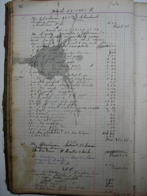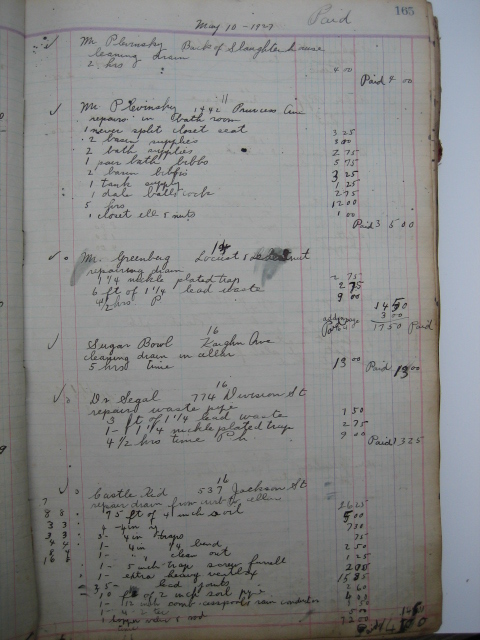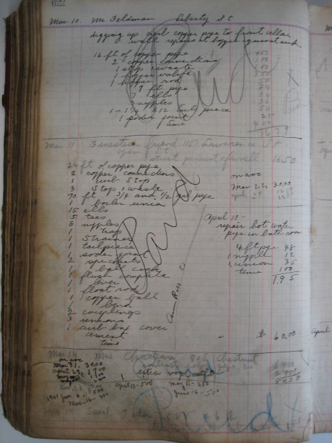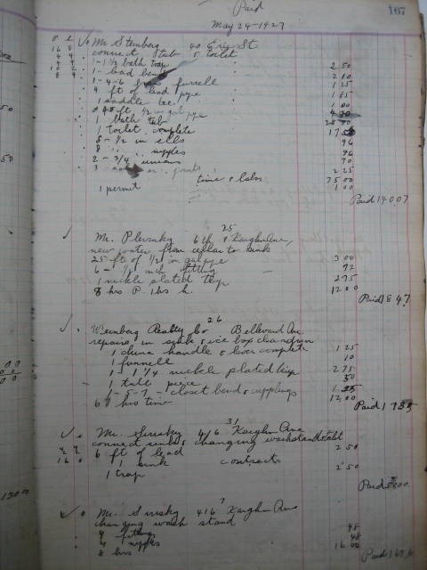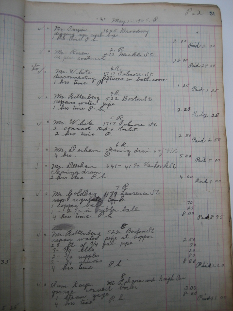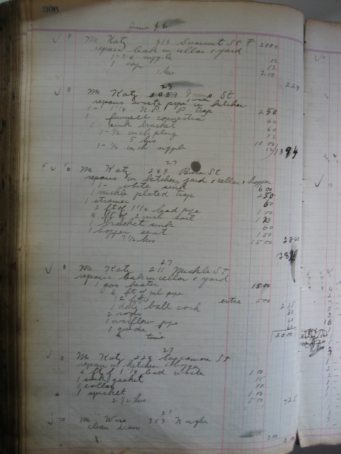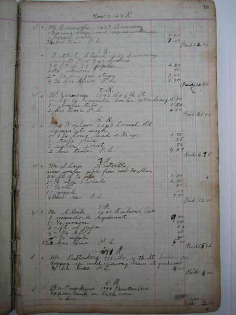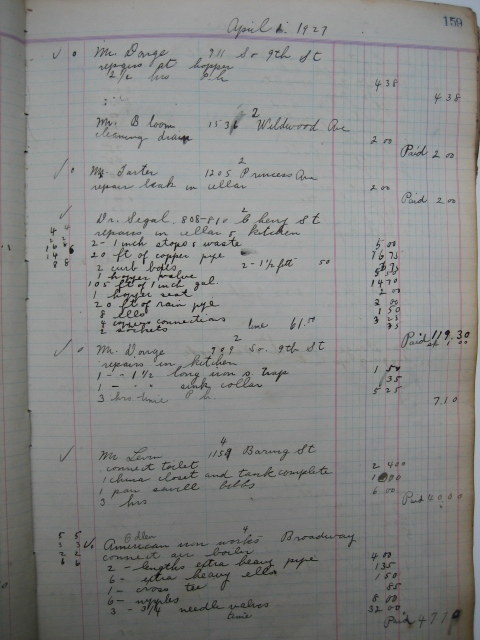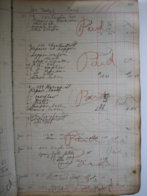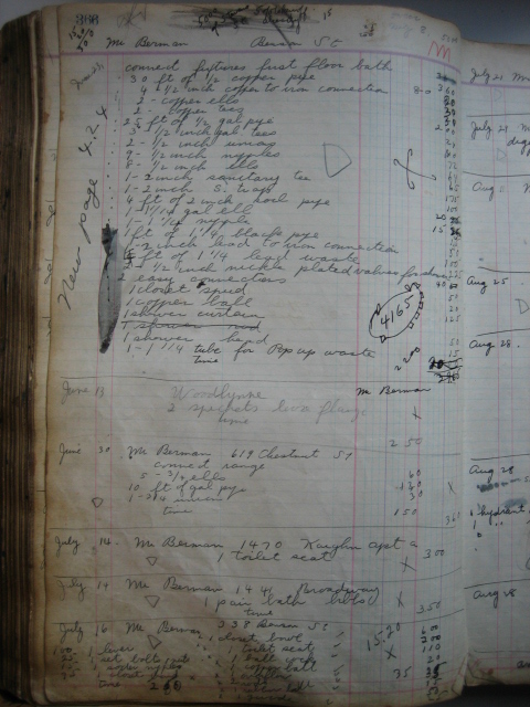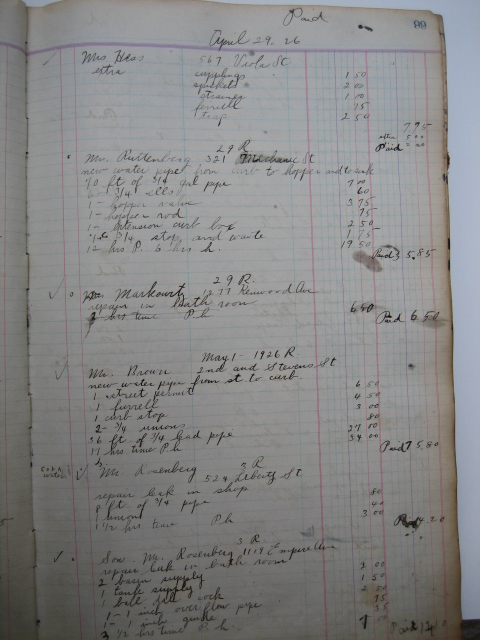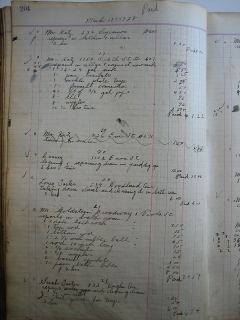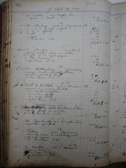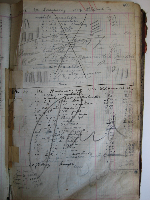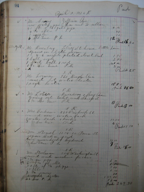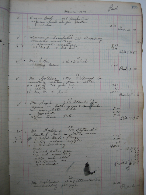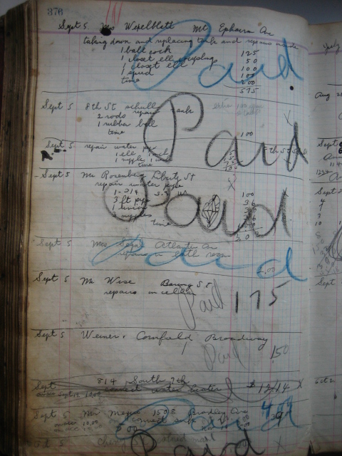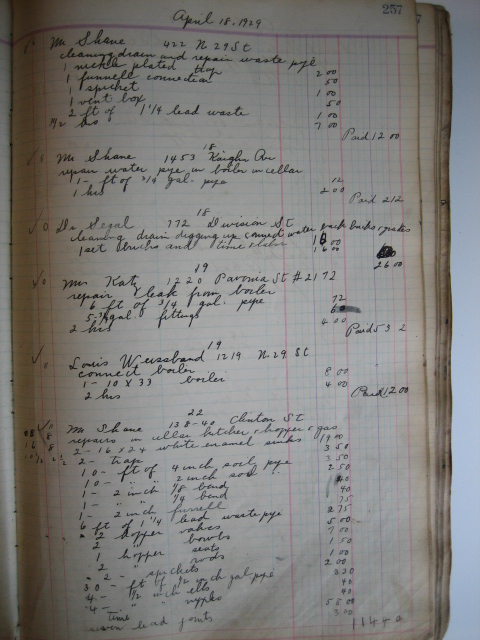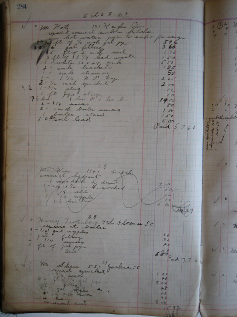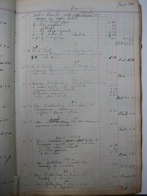Ross Plumbing was the business of the Ross family, and bore the name of its founder, Isreal Ross, who went into business as a plumbing and heating contractor in 1918. He had previously partnered with Francis Bicker Jr., son of Dr. Francis Bicker, a well known physician in Camden's Eighth Ward. He may still have been in business with Bicker into the 1920s. By January of 1920 Isreal Ross and his wife, the former Annie Silverman, had bought a house at 1145 Baring Street. Annie Silverman was the daughter of Becky Silverman, who owned an operated a clothing business at 299 Kaighn Avenue, the corner of South 3rd Street and Kaighn Avenue. A set of journals that begin in 1924 seem to indicate that the partnership with Francis Bicker Jr. had dissolved, and that Isreal Ross had started his own business. These journals, presented here, show every job that Isreal Ross undertook, indicate that he worked for many people who were or would become well known in Camden. He also had begun doing work for various real estate operators. Sometime after the fall of 1936 Israel Ross acquired the building at 1142 South 6th Street, where the Tarter family had once conducted a bottling business. Isreal Ross lived and operated his business here, the Ross Plumbing & Heating Company, through at least 1947. By that time sons Edward and Leonard had joined the business. Ross Plumbing and Heating did a great portion of its business with Camden real estate operators and landlords. Some of the larger and more notable clients in the 1930s and 1940s included Benjamin Natal, Theodore Tiedeken, Samuel Gelfand, Louis Richelson, Louis Dorflinger, Ellis Goodman, Zellie Ellis, Joseph and William Lipkin, and Alex Malamut. There was also institutional work, for the Talmud Torah building, churches and synagogues, and Belleview Hospital. They also did work for several Camden physicians, including Dr. Ulysses Wiggins, Dr. William Lashman, and Dr. Marcus Wheatland. Commercial accounts included Trilling & Montague, a company involved with many of the bar businesses in Camden, Quality Drugs, and several businesses on Broadway, Kaighn Avenue, and throughout the city. They also worked for several Building and Loan Associations and the Federal Deposit Insurance Corporation's real estate operation. Isreal Ross passed away on April 12, 1962. He was buried the following day at Crescent Burial Park in Pennsauken NJ. He was survived by his wife and sons, who carried the business forward. Anna Silverman Ross passed away in Cherry Hill NJ in 1993. The Ross Plumbing and Heating Company was still operating on South 6th Street as late as the fall of 1977, and owned the property into the late 1990s. For more about the the family and business of Isreal and Anna Ross, please visit the following web-pages on on this site: