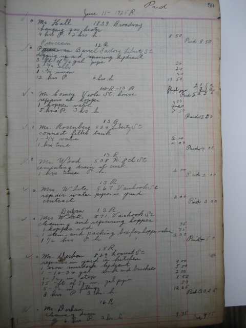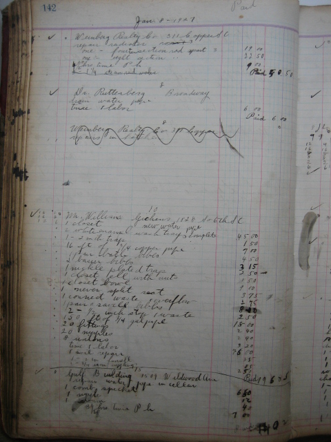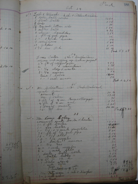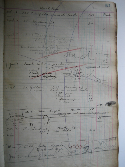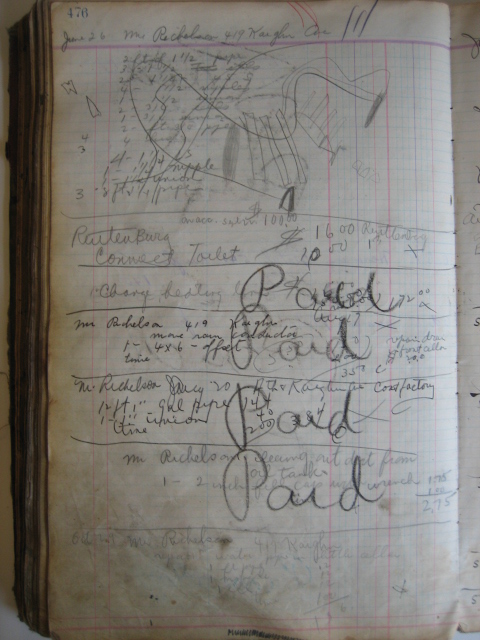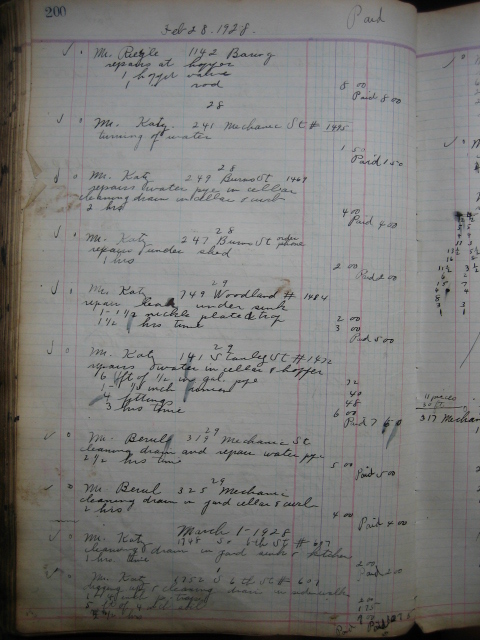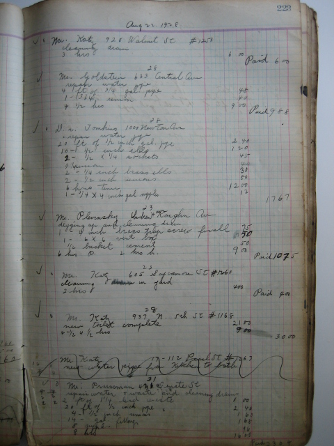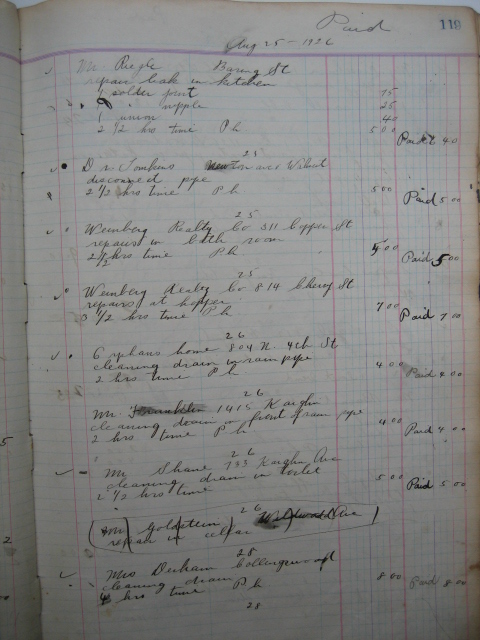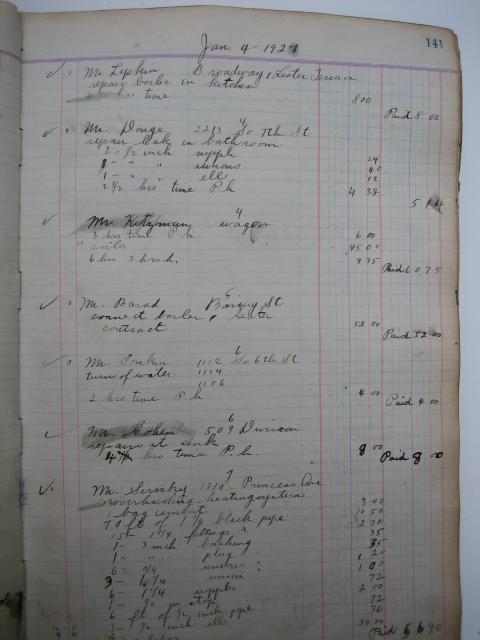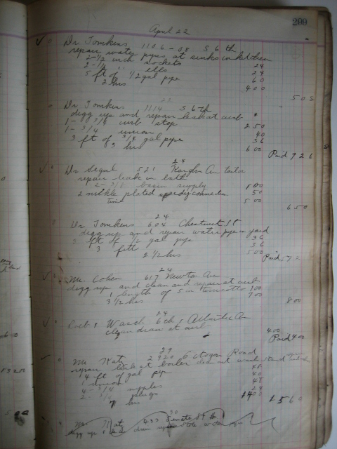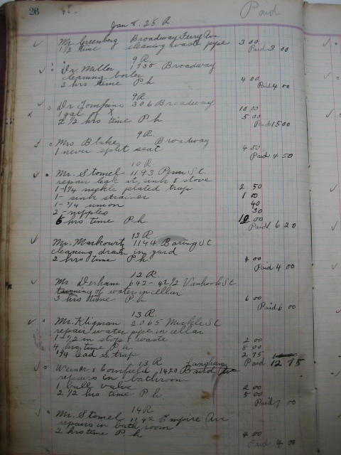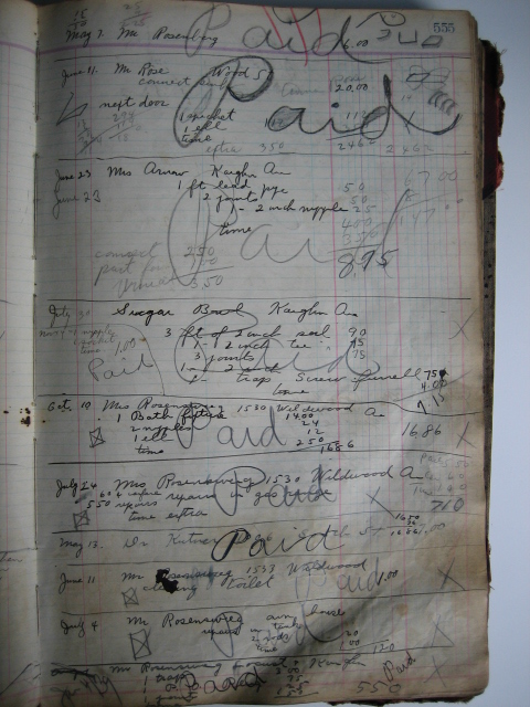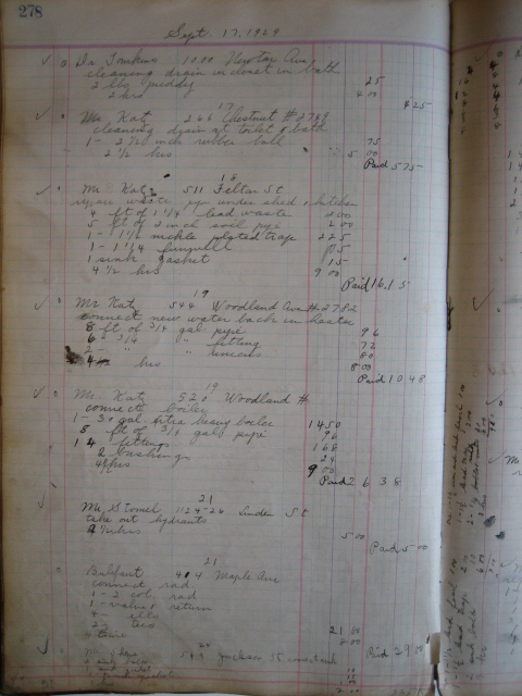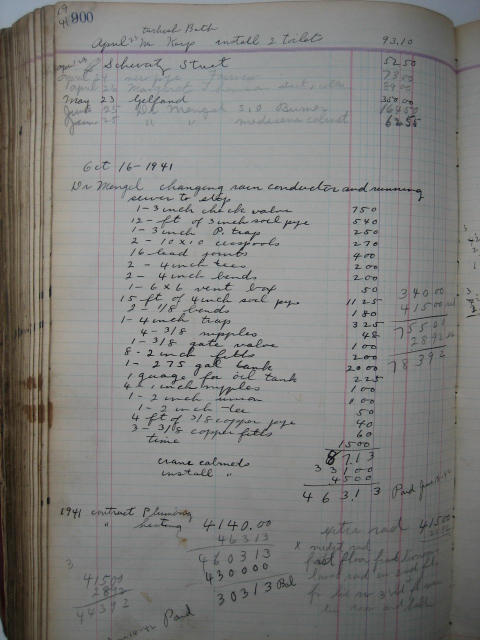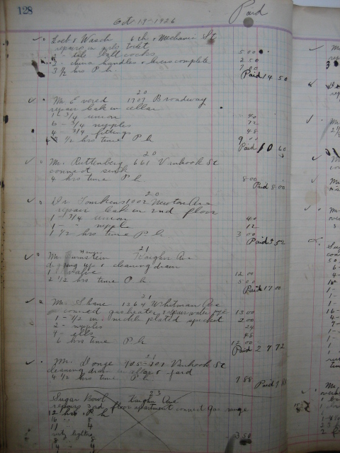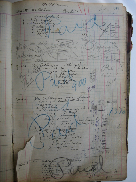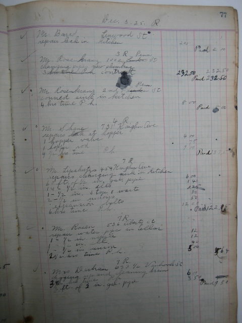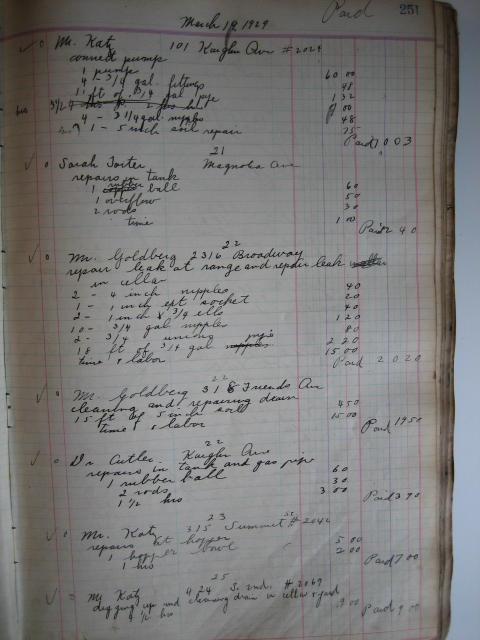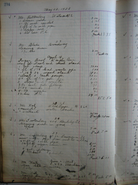 Ross Plumbing was the business of the Ross family, and bore the name of its founder, Isreal Ross, who went into business as a plumbing and heating contractor in 1918. He had previously partnered with Francis Bicker Jr., son of Dr. Francis Bicker, a well known physician in Camden's Eighth Ward. He may still have been in business with Bicker into the 1920s. By January of 1920 Isreal Ross and his wife, the former Annie Silverman, had bought a house at 1145 Baring Street. Annie Silverman was the daughter of Becky Silverman, who owned an operated a clothing business at 299 Kaighn Avenue, the corner of South 3rd Street and Kaighn Avenue. A set of journals that begin in 1924 seem to indicate that the partnership with Francis Bicker Jr. had dissolved, and that Isreal Ross had started his own business. These journals, presented here, show every job that Isreal Ross undertook, indicate that he worked for many people who were or would become well known in Camden. He also had begun doing work for various real estate operators. Sometime after the fall of 1936 Israel Ross acquired the building at 1142 South 6th Street, where the Tarter family had once conducted a bottling business. Isreal Ross lived and operated his business here, the Ross Plumbing & Heating Company, through at least 1947. By that time sons Edward and Leonard had joined the business. Ross Plumbing and Heating did a great portion of its business with Camden real estate operators and landlords. Some of the larger and more notable clients in the 1930s and 1940s included Benjamin Natal, Theodore Tiedeken, Samuel Gelfand, Louis Richelson, Louis Dorflinger, Ellis Goodman, Zellie Ellis, Joseph and William Lipkin, and Alex Malamut. There was also institutional work, for the Talmud Torah building, churches and synagogues, and Belleview Hospital. They also did work for several Camden physicians, including Dr. Ulysses Wiggins, Dr. William Lashman, and Dr. Marcus Wheatland. Commercial accounts included Trilling & Montague, a company involved with many of the bar businesses in Camden, Quality Drugs, and several businesses on Broadway, Kaighn Avenue, and throughout the city. They also worked for several Building and Loan Associations and the Federal Deposit Insurance Corporation's real estate operation. Isreal Ross passed away on April 12, 1962. He was buried the following day at Crescent Burial Park in Pennsauken NJ. He was survived by his wife and sons, who carried the business forward. Anna Silverman Ross passed away in Cherry Hill NJ in 1993. The Ross Plumbing and Heating Company was still operating on South 6th Street as late as the fall of 1977, and owned the property into the late 1990s. For more about the the family and business of Isreal and Anna Ross, please visit the following web-pages on on this site:
