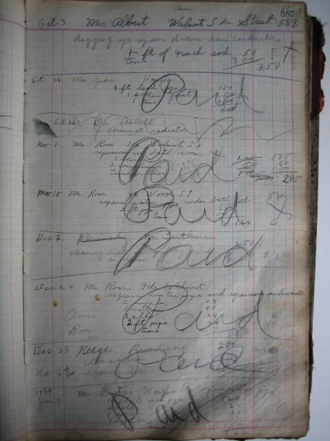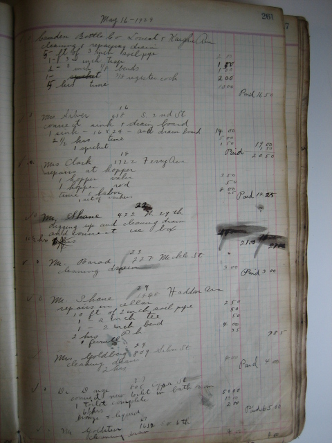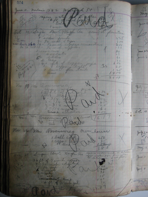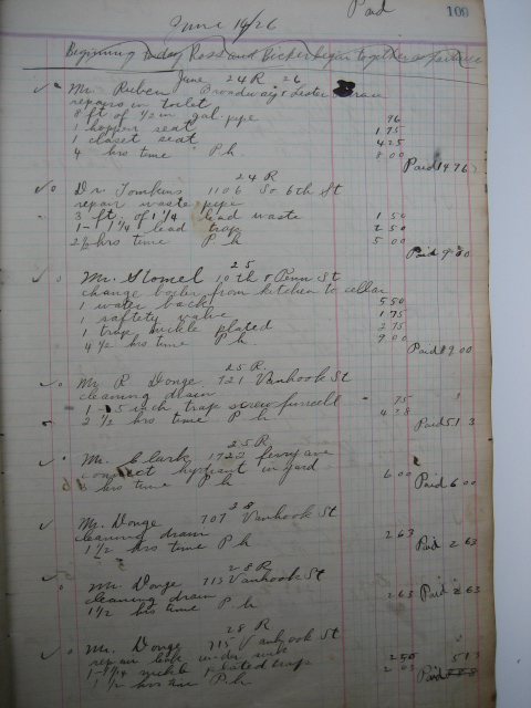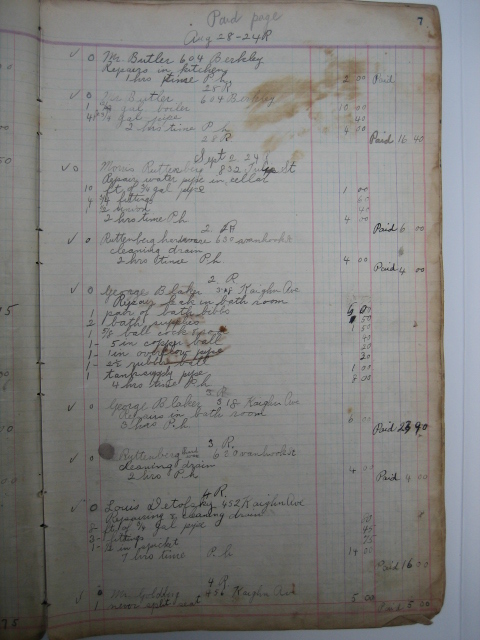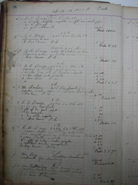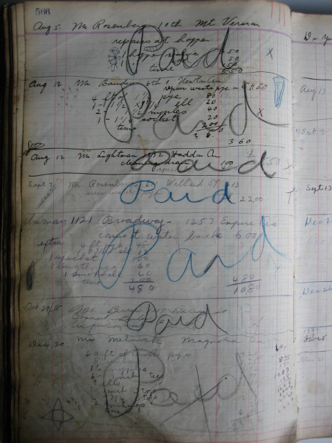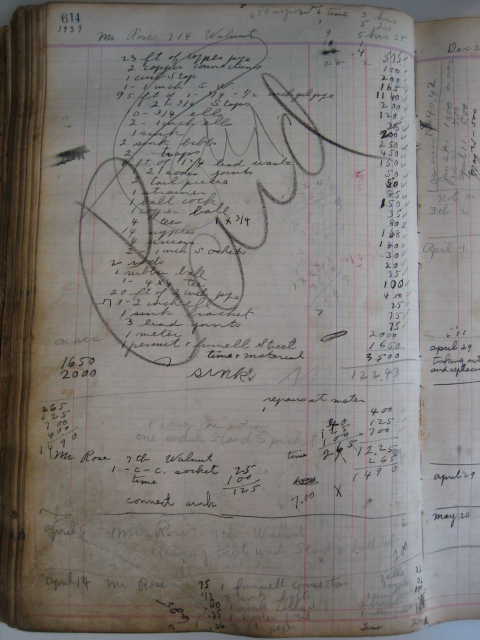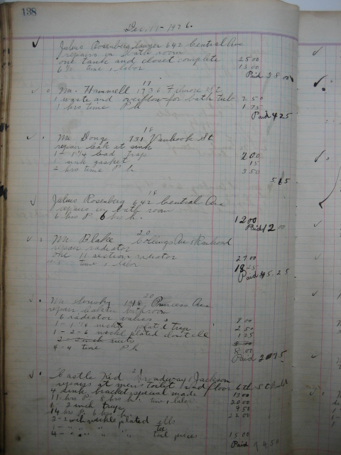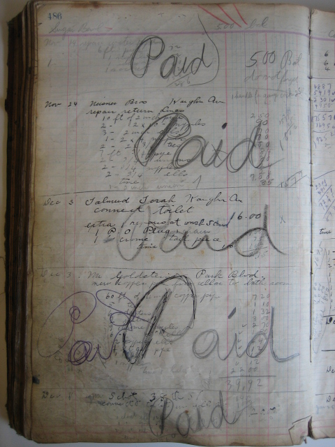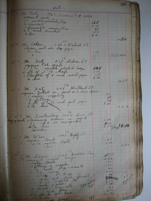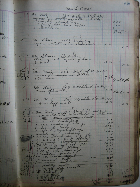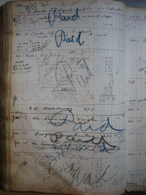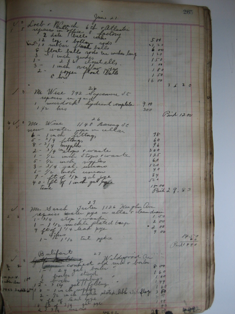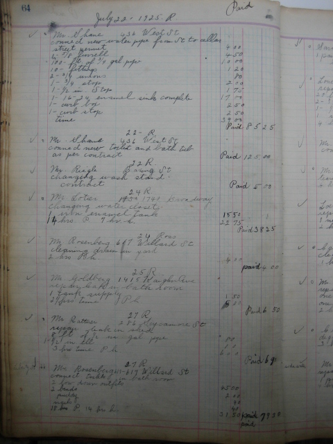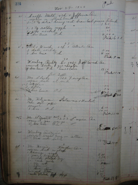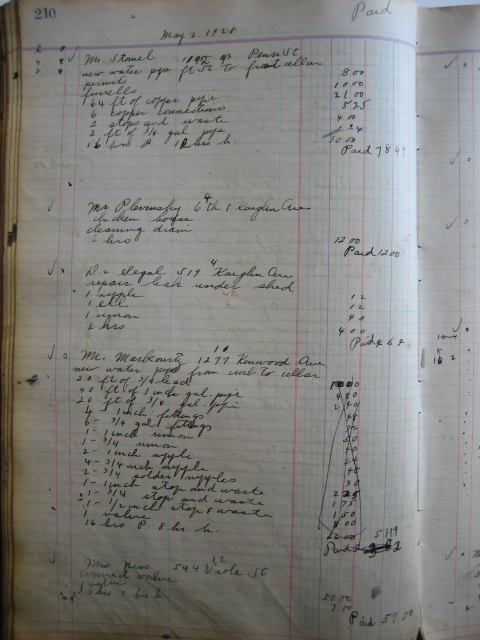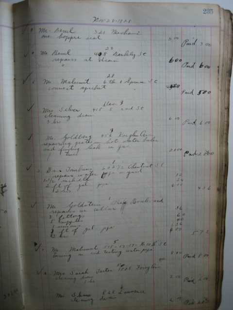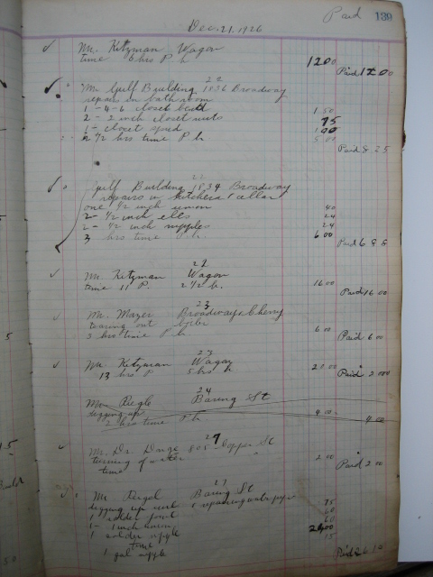 Ross Plumbing was the business of the Ross family, and bore the name of its founder, Isreal Ross, who went into business as a plumbing and heating contractor in 1918. He had previously partnered with Francis Bicker Jr., son of Dr. Francis Bicker, a well known physician in Camden's Eighth Ward. He may still have been in business with Bicker into the 1920s. By January of 1920 Isreal Ross and his wife, the former Annie Silverman, had bought a house at 1145 Baring Street. Annie Silverman was the daughter of Becky Silverman, who owned an operated a clothing business at 299 Kaighn Avenue, the corner of South 3rd Street and Kaighn Avenue. A set of journals that begin in 1924 seem to indicate that the partnership with Francis Bicker Jr. had dissolved, and that Isreal Ross had started his own business. These journals, presented here, show every job that Isreal Ross undertook, indicate that he worked for many people who were or would become well known in Camden. He also had begun doing work for various real estate operators. Sometime after the fall of 1936 Israel Ross acquired the building at 1142 South 6th Street, where the Tarter family had once conducted a bottling business. Isreal Ross lived and operated his business here, the Ross Plumbing & Heating Company, through at least 1947. By that time sons Edward and Leonard had joined the business. Ross Plumbing and Heating did a great portion of its business with Camden real estate operators and landlords. Some of the larger and more notable clients in the 1930s and 1940s included Benjamin Natal, Theodore Tiedeken, Samuel Gelfand, Louis Richelson, Louis Dorflinger, Ellis Goodman, Zellie Ellis, Joseph and William Lipkin, and Alex Malamut. There was also institutional work, for the Talmud Torah building, churches and synagogues, and Belleview Hospital. They also did work for several Camden physicians, including Dr. Ulysses Wiggins, Dr. William Lashman, and Dr. Marcus Wheatland. Commercial accounts included Trilling & Montague, a company involved with many of the bar businesses in Camden, Quality Drugs, and several businesses on Broadway, Kaighn Avenue, and throughout the city. They also worked for several Building and Loan Associations and the Federal Deposit Insurance Corporation's real estate operation. Isreal Ross passed away on April 12, 1962. He was buried the following day at Crescent Burial Park in Pennsauken NJ. He was survived by his wife and sons, who carried the business forward. Anna Silverman Ross passed away in Cherry Hill NJ in 1993. The Ross Plumbing and Heating Company was still operating on South 6th Street as late as the fall of 1977, and owned the property into the late 1990s. For more about the the family and business of Isreal and Anna Ross, please visit the following web-pages on on this site: