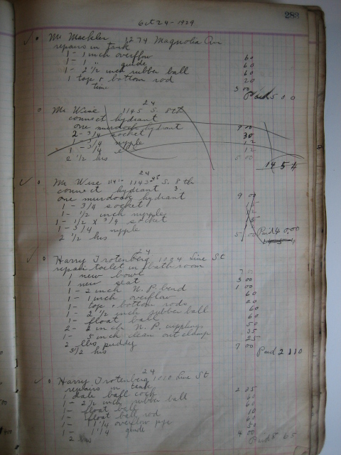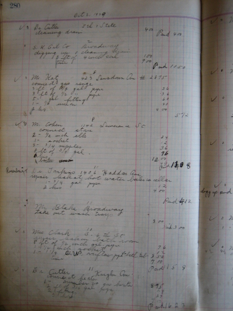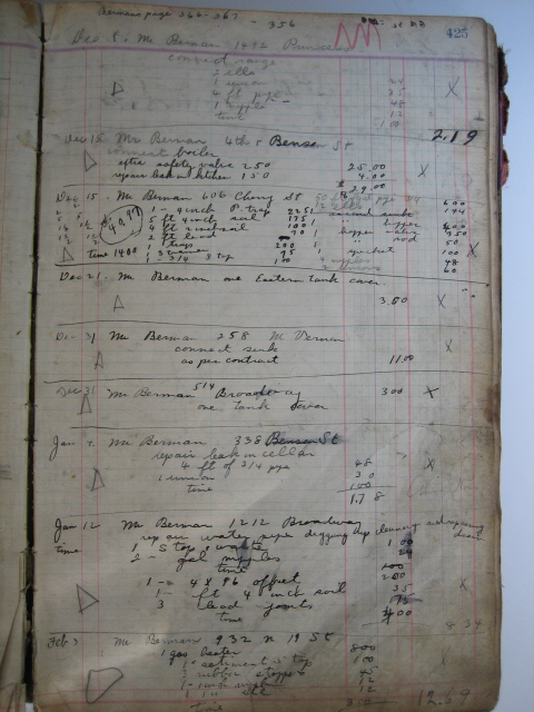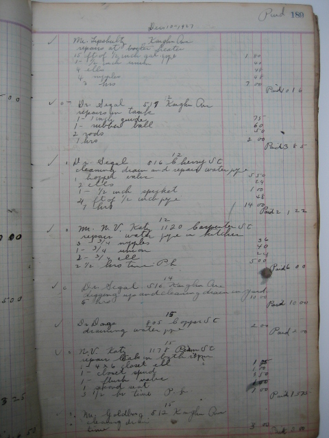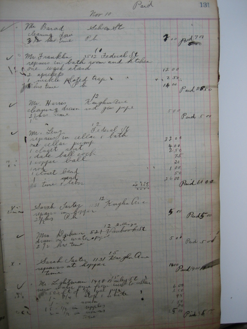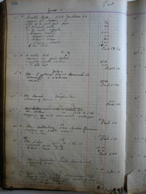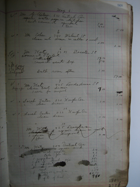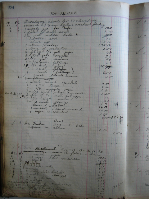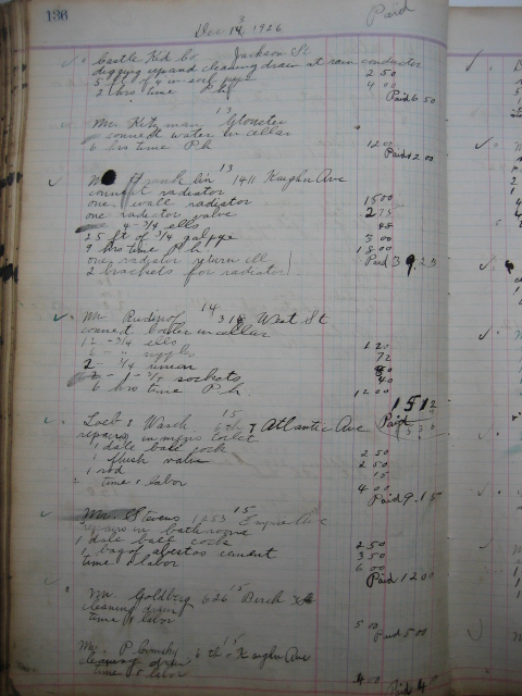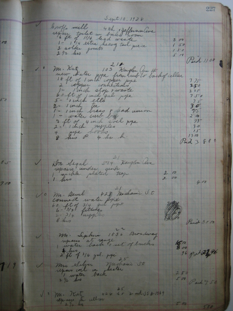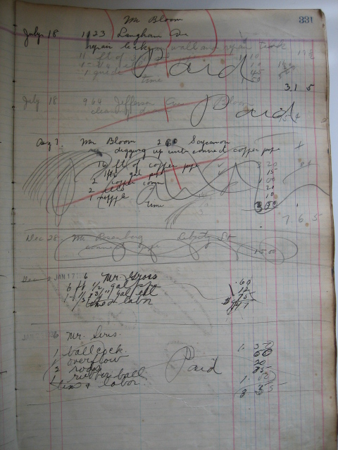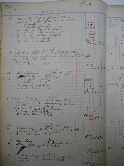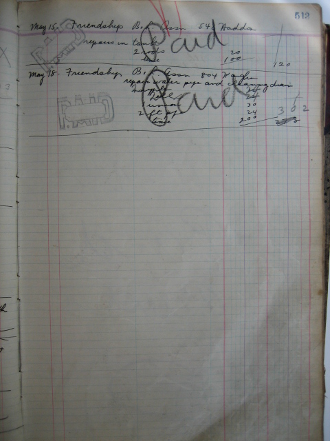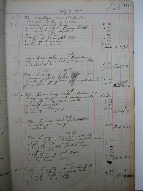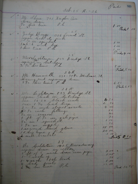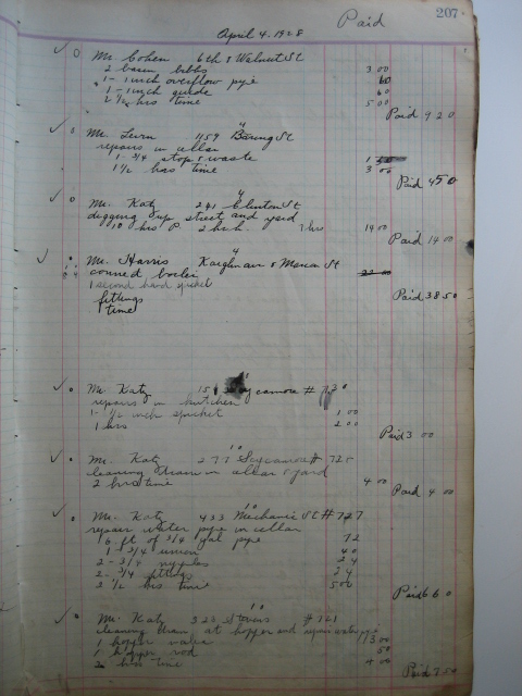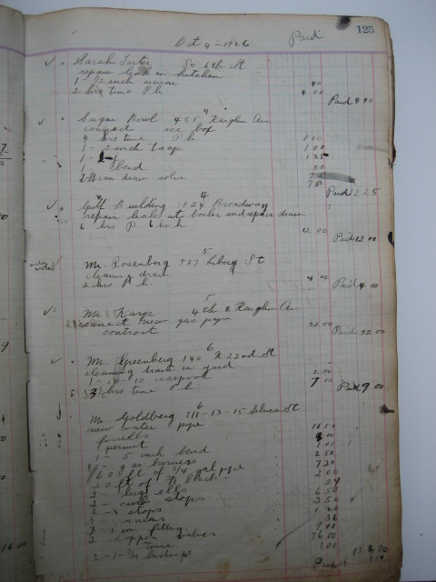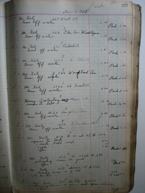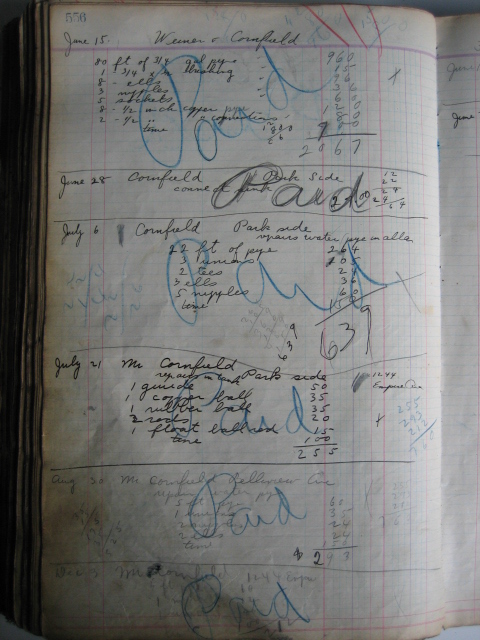Ross Plumbing was the business of the Ross family, and bore the name of its founder, Isreal Ross, who went into business as a plumbing and heating contractor in 1918. He had previously partnered with Francis Bicker Jr., son of Dr. Francis Bicker, a well known physician in Camden's Eighth Ward. He may still have been in business with Bicker into the 1920s. By January of 1920 Isreal Ross and his wife, the former Annie Silverman, had bought a house at 1145 Baring Street. Annie Silverman was the daughter of Becky Silverman, who owned an operated a clothing business at 299 Kaighn Avenue, the corner of South 3rd Street and Kaighn Avenue. A set of journals that begin in 1924 seem to indicate that the partnership with Francis Bicker Jr. had dissolved, and that Isreal Ross had started his own business. These journals, presented here, show every job that Isreal Ross undertook, indicate that he worked for many people who were or would become well known in Camden. He also had begun doing work for various real estate operators. Sometime after the fall of 1936 Israel Ross acquired the building at 1142 South 6th Street, where the Tarter family had once conducted a bottling business. Isreal Ross lived and operated his business here, the Ross Plumbing & Heating Company, through at least 1947. By that time sons Edward and Leonard had joined the business. Ross Plumbing and Heating did a great portion of its business with Camden real estate operators and landlords. Some of the larger and more notable clients in the 1930s and 1940s included Benjamin Natal, Theodore Tiedeken, Samuel Gelfand, Louis Richelson, Louis Dorflinger, Ellis Goodman, Zellie Ellis, Joseph and William Lipkin, and Alex Malamut. There was also institutional work, for the Talmud Torah building, churches and synagogues, and Belleview Hospital. They also did work for several Camden physicians, including Dr. Ulysses Wiggins, Dr. William Lashman, and Dr. Marcus Wheatland. Commercial accounts included Trilling & Montague, a company involved with many of the bar businesses in Camden, Quality Drugs, and several businesses on Broadway, Kaighn Avenue, and throughout the city. They also worked for several Building and Loan Associations and the Federal Deposit Insurance Corporation's real estate operation. Isreal Ross passed away on April 12, 1962. He was buried the following day at Crescent Burial Park in Pennsauken NJ. He was survived by his wife and sons, who carried the business forward. Anna Silverman Ross passed away in Cherry Hill NJ in 1993. The Ross Plumbing and Heating Company was still operating on South 6th Street as late as the fall of 1977, and owned the property into the late 1990s. For more about the the family and business of Isreal and Anna Ross, please visit the following web-pages on on this site: