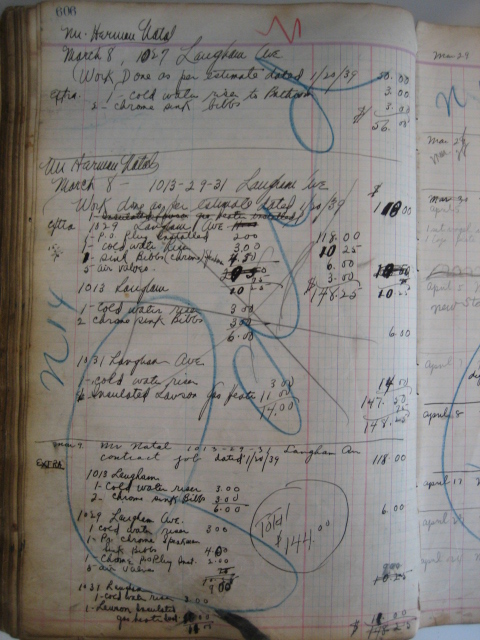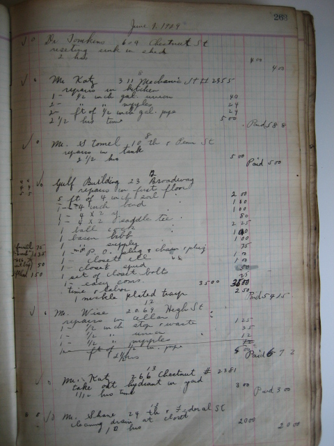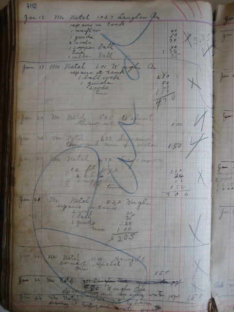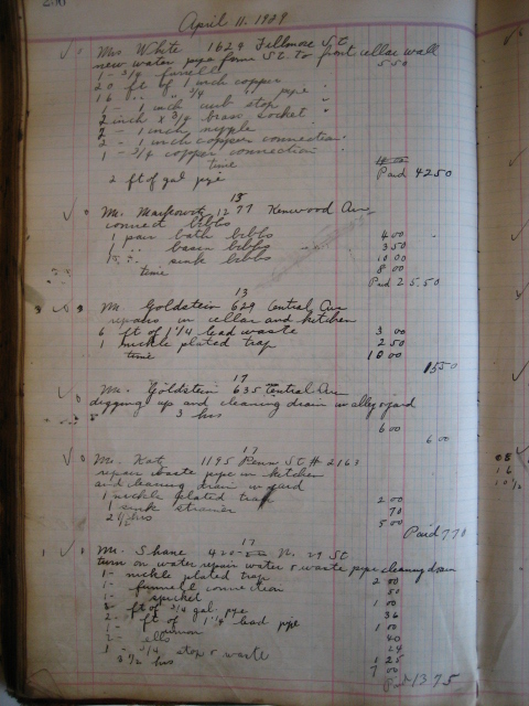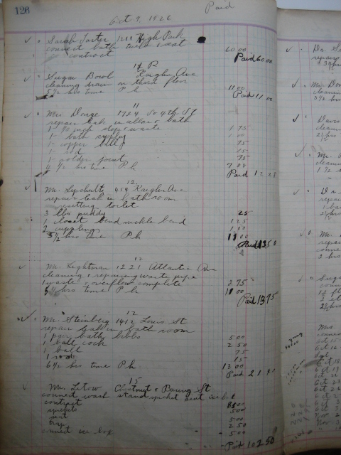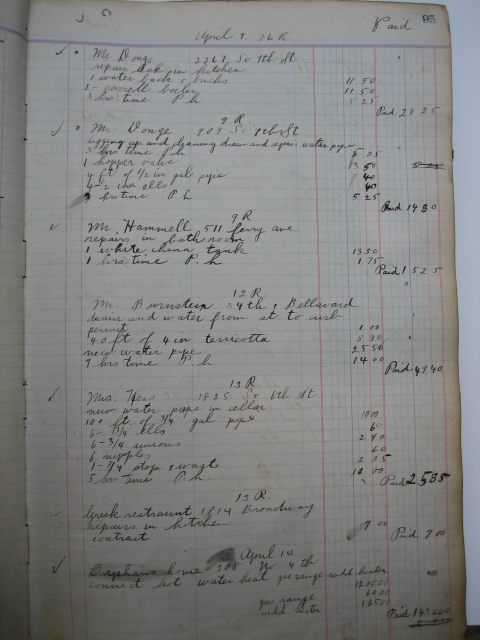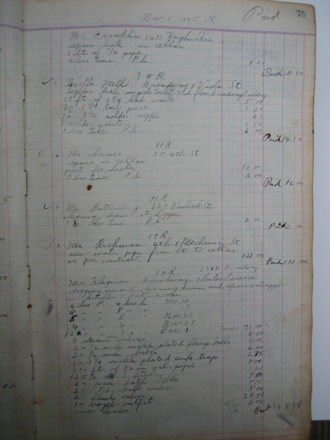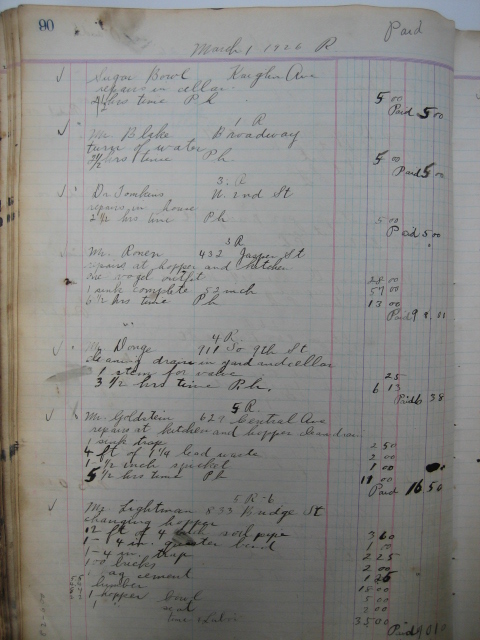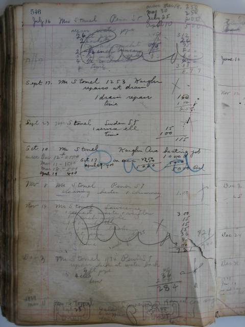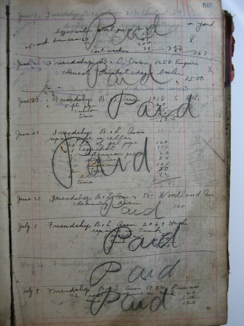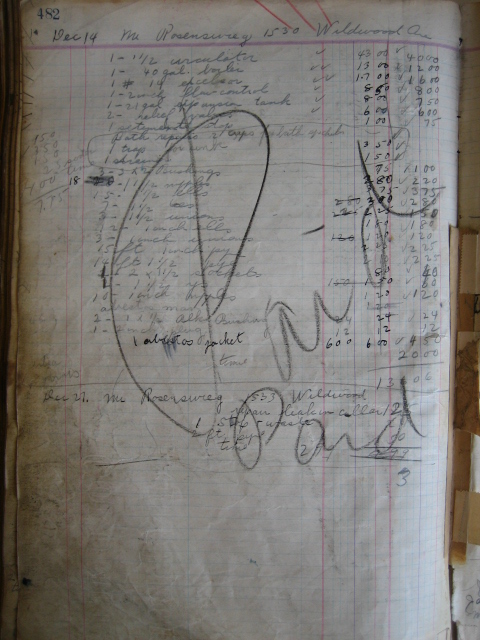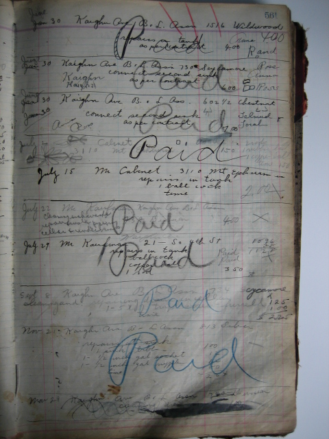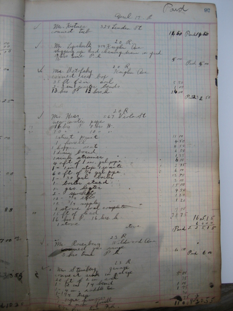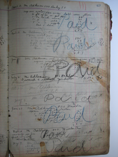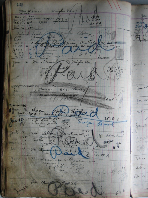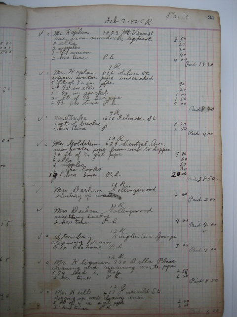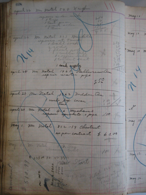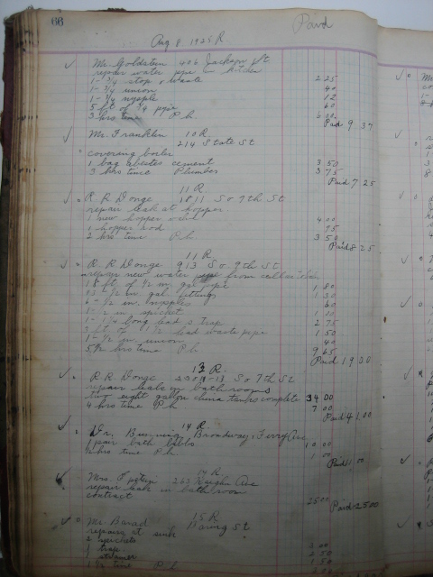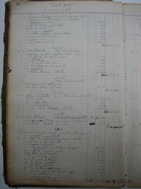 Ross Plumbing was the business of the Ross family, and bore the name of its founder, Isreal Ross, who went into business as a plumbing and heating contractor in 1918. He had previously partnered with Francis Bicker Jr., son of Dr. Francis Bicker, a well known physician in Camden's Eighth Ward. He may still have been in business with Bicker into the 1920s. By January of 1920 Isreal Ross and his wife, the former Annie Silverman, had bought a house at 1145 Baring Street. Annie Silverman was the daughter of Becky Silverman, who owned an operated a clothing business at 299 Kaighn Avenue, the corner of South 3rd Street and Kaighn Avenue. A set of journals that begin in 1924 seem to indicate that the partnership with Francis Bicker Jr. had dissolved, and that Isreal Ross had started his own business. These journals, presented here, show every job that Isreal Ross undertook, indicate that he worked for many people who were or would become well known in Camden. He also had begun doing work for various real estate operators. Sometime after the fall of 1936 Israel Ross acquired the building at 1142 South 6th Street, where the Tarter family had once conducted a bottling business. Isreal Ross lived and operated his business here, the Ross Plumbing & Heating Company, through at least 1947. By that time sons Edward and Leonard had joined the business. Ross Plumbing and Heating did a great portion of its business with Camden real estate operators and landlords. Some of the larger and more notable clients in the 1930s and 1940s included Benjamin Natal, Theodore Tiedeken, Samuel Gelfand, Louis Richelson, Louis Dorflinger, Ellis Goodman, Zellie Ellis, Joseph and William Lipkin, and Alex Malamut. There was also institutional work, for the Talmud Torah building, churches and synagogues, and Belleview Hospital. They also did work for several Camden physicians, including Dr. Ulysses Wiggins, Dr. William Lashman, and Dr. Marcus Wheatland. Commercial accounts included Trilling & Montague, a company involved with many of the bar businesses in Camden, Quality Drugs, and several businesses on Broadway, Kaighn Avenue, and throughout the city. They also worked for several Building and Loan Associations and the Federal Deposit Insurance Corporation's real estate operation. Isreal Ross passed away on April 12, 1962. He was buried the following day at Crescent Burial Park in Pennsauken NJ. He was survived by his wife and sons, who carried the business forward. Anna Silverman Ross passed away in Cherry Hill NJ in 1993. The Ross Plumbing and Heating Company was still operating on South 6th Street as late as the fall of 1977, and owned the property into the late 1990s. For more about the the family and business of Isreal and Anna Ross, please visit the following web-pages on on this site: