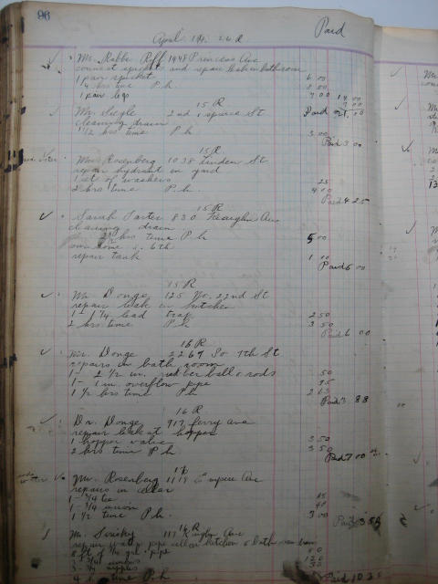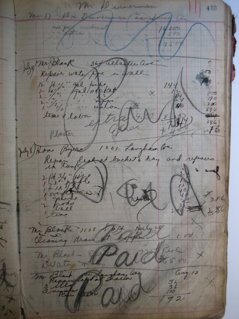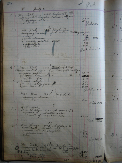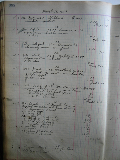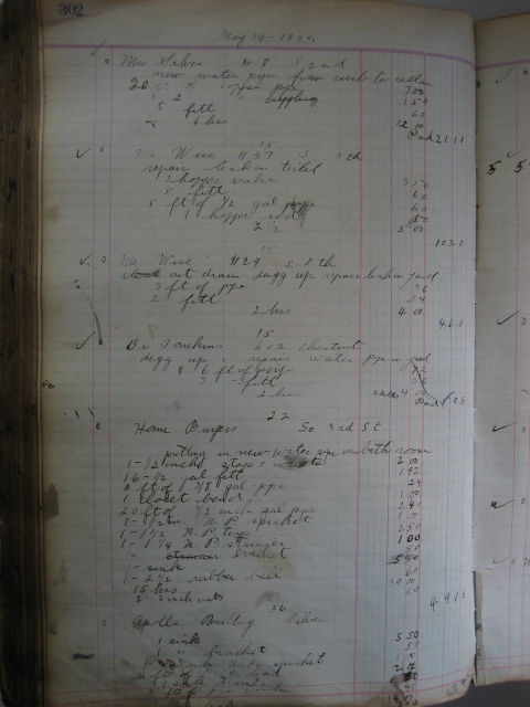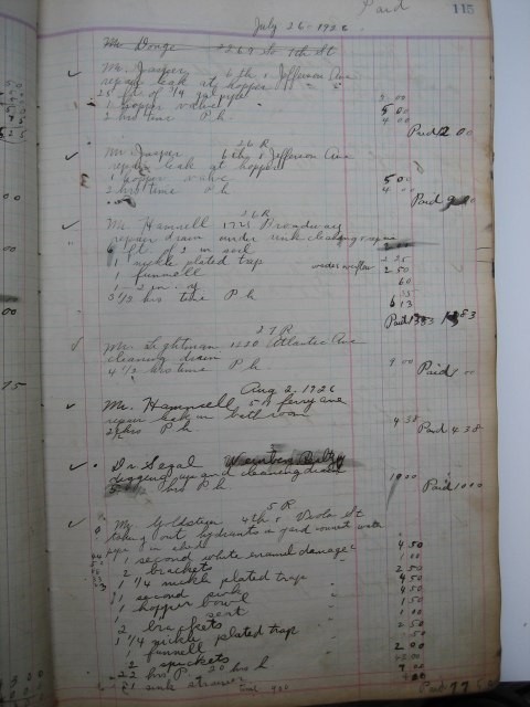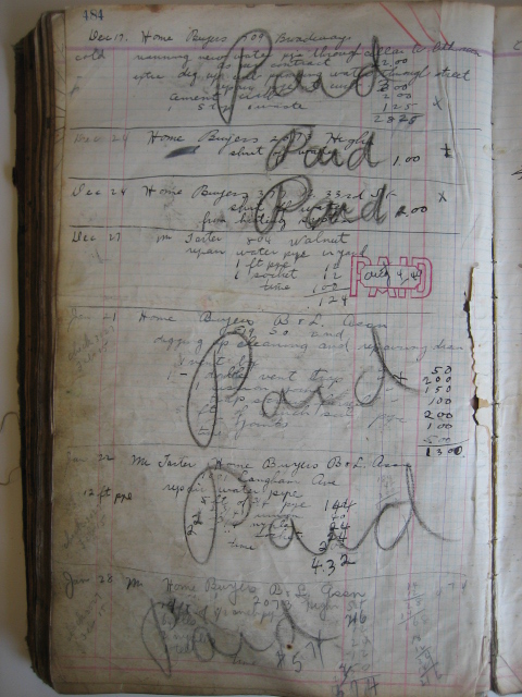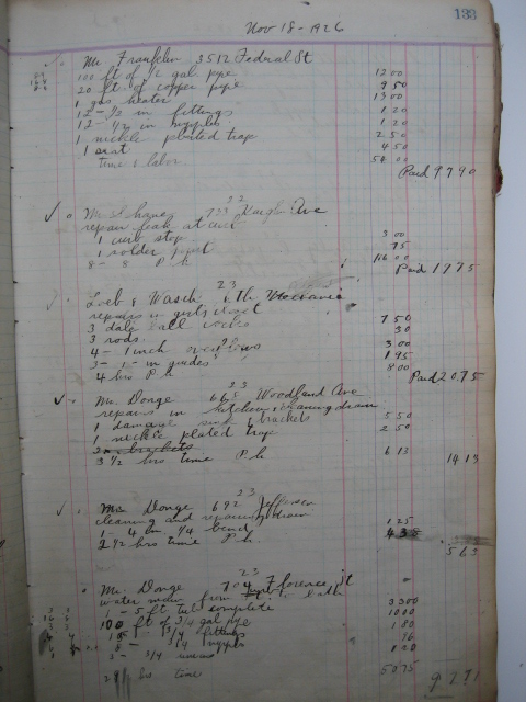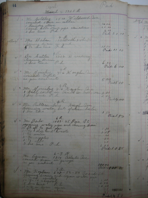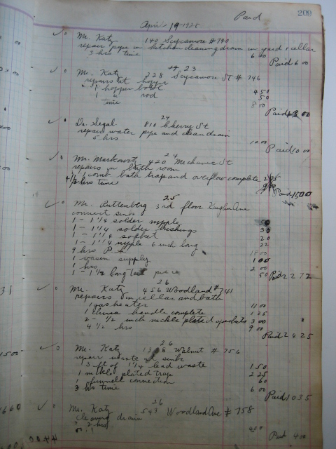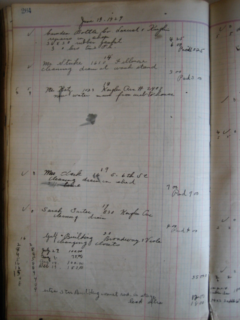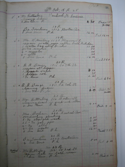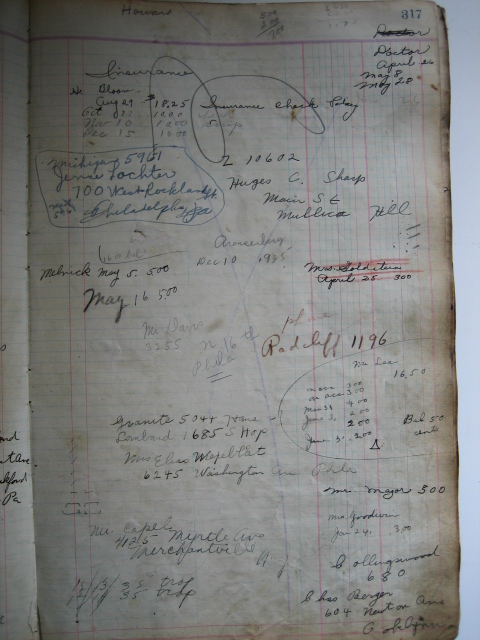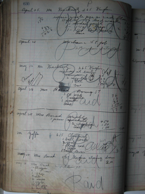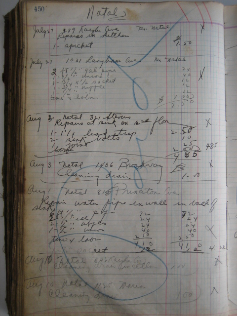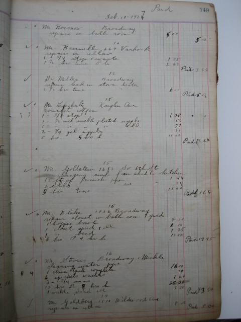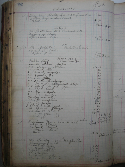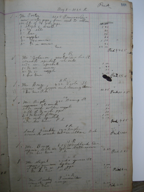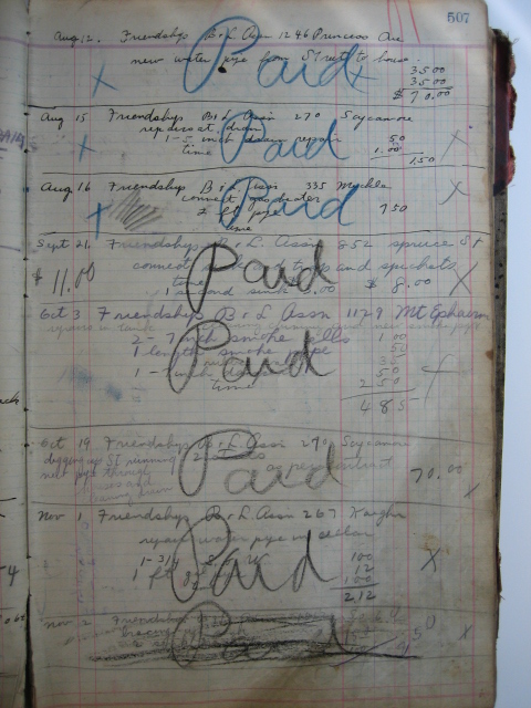 Ross Plumbing was the business of the Ross family, and bore the name of its founder, Isreal Ross, who went into business as a plumbing and heating contractor in 1918. He had previously partnered with Francis Bicker Jr., son of Dr. Francis Bicker, a well known physician in Camden's Eighth Ward. He may still have been in business with Bicker into the 1920s. By January of 1920 Isreal Ross and his wife, the former Annie Silverman, had bought a house at 1145 Baring Street. Annie Silverman was the daughter of Becky Silverman, who owned an operated a clothing business at 299 Kaighn Avenue, the corner of South 3rd Street and Kaighn Avenue. A set of journals that begin in 1924 seem to indicate that the partnership with Francis Bicker Jr. had dissolved, and that Isreal Ross had started his own business. These journals, presented here, show every job that Isreal Ross undertook, indicate that he worked for many people who were or would become well known in Camden. He also had begun doing work for various real estate operators. Sometime after the fall of 1936 Israel Ross acquired the building at 1142 South 6th Street, where the Tarter family had once conducted a bottling business. Isreal Ross lived and operated his business here, the Ross Plumbing & Heating Company, through at least 1947. By that time sons Edward and Leonard had joined the business. Ross Plumbing and Heating did a great portion of its business with Camden real estate operators and landlords. Some of the larger and more notable clients in the 1930s and 1940s included Benjamin Natal, Theodore Tiedeken, Samuel Gelfand, Louis Richelson, Louis Dorflinger, Ellis Goodman, Zellie Ellis, Joseph and William Lipkin, and Alex Malamut. There was also institutional work, for the Talmud Torah building, churches and synagogues, and Belleview Hospital. They also did work for several Camden physicians, including Dr. Ulysses Wiggins, Dr. William Lashman, and Dr. Marcus Wheatland. Commercial accounts included Trilling & Montague, a company involved with many of the bar businesses in Camden, Quality Drugs, and several businesses on Broadway, Kaighn Avenue, and throughout the city. They also worked for several Building and Loan Associations and the Federal Deposit Insurance Corporation's real estate operation. Isreal Ross passed away on April 12, 1962. He was buried the following day at Crescent Burial Park in Pennsauken NJ. He was survived by his wife and sons, who carried the business forward. Anna Silverman Ross passed away in Cherry Hill NJ in 1993. The Ross Plumbing and Heating Company was still operating on South 6th Street as late as the fall of 1977, and owned the property into the late 1990s. For more about the the family and business of Isreal and Anna Ross, please visit the following web-pages on on this site: