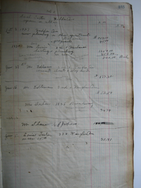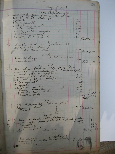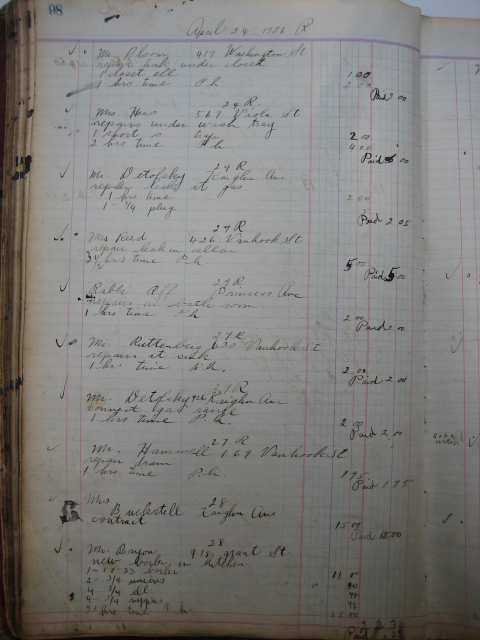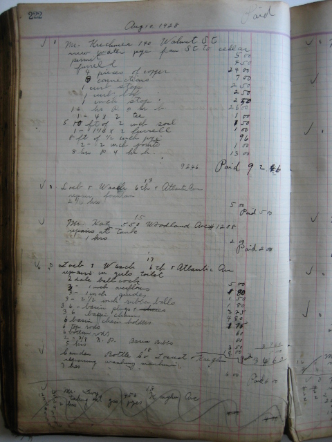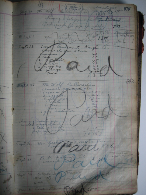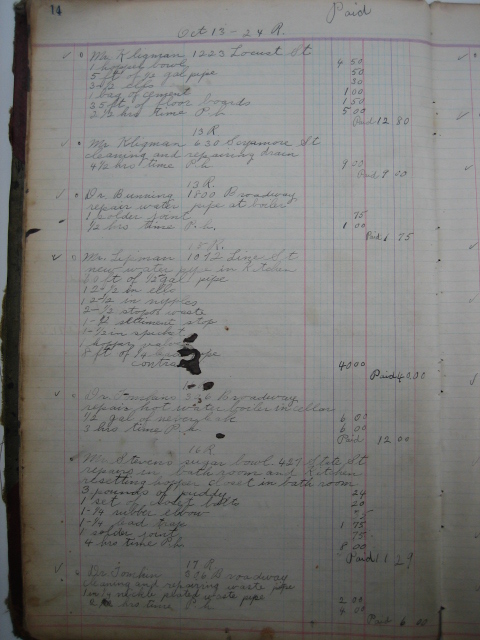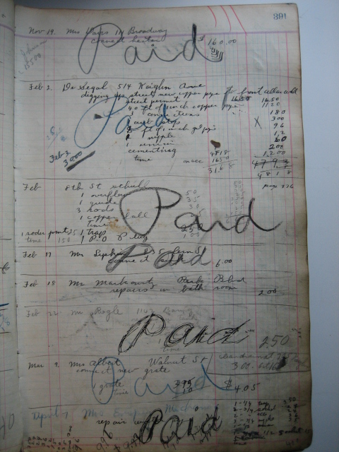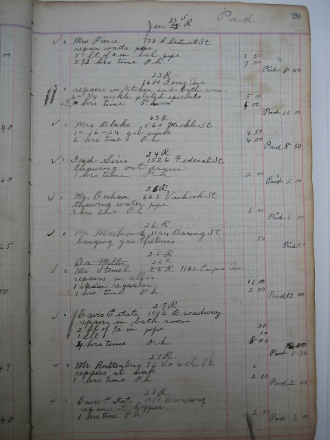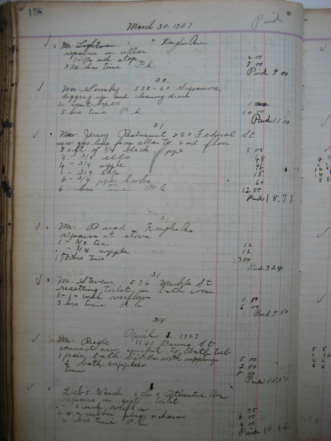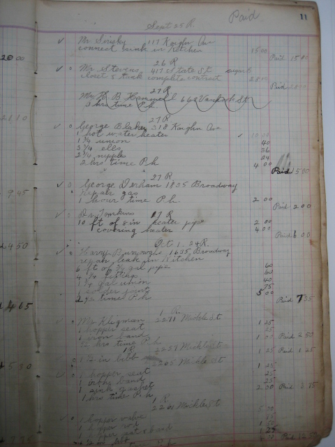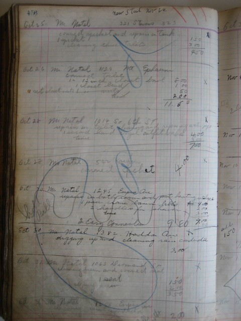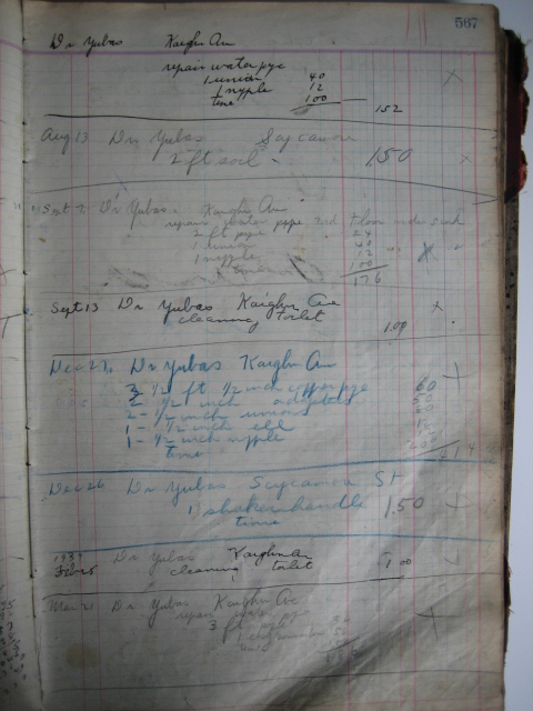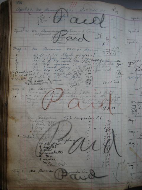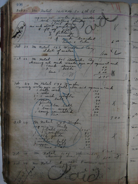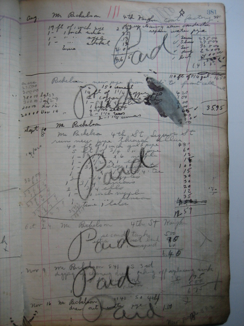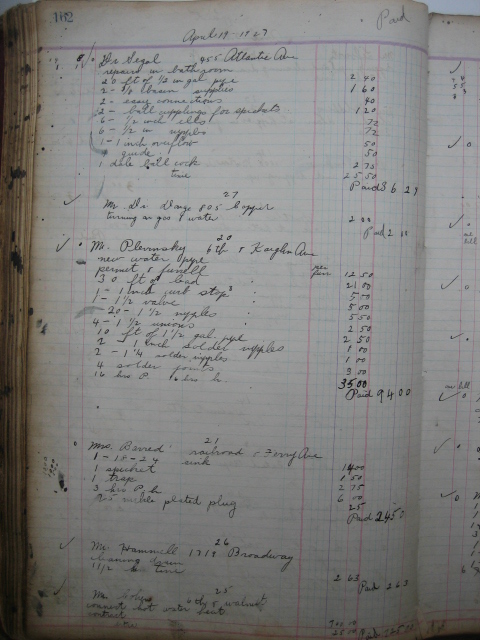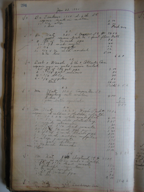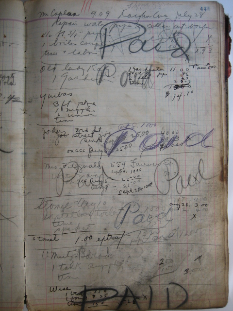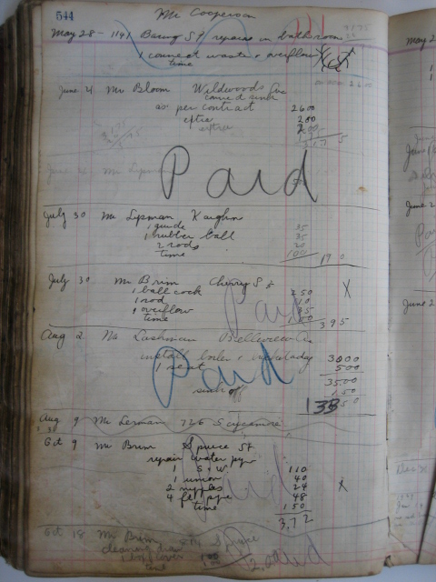 Ross Plumbing was the business of the Ross family, and bore the name of its founder, Isreal Ross, who went into business as a plumbing and heating contractor in 1918. He had previously partnered with Francis Bicker Jr., son of Dr. Francis Bicker, a well known physician in Camden's Eighth Ward. He may still have been in business with Bicker into the 1920s. By January of 1920 Isreal Ross and his wife, the former Annie Silverman, had bought a house at 1145 Baring Street. Annie Silverman was the daughter of Becky Silverman, who owned an operated a clothing business at 299 Kaighn Avenue, the corner of South 3rd Street and Kaighn Avenue. A set of journals that begin in 1924 seem to indicate that the partnership with Francis Bicker Jr. had dissolved, and that Isreal Ross had started his own business. These journals, presented here, show every job that Isreal Ross undertook, indicate that he worked for many people who were or would become well known in Camden. He also had begun doing work for various real estate operators. Sometime after the fall of 1936 Israel Ross acquired the building at 1142 South 6th Street, where the Tarter family had once conducted a bottling business. Isreal Ross lived and operated his business here, the Ross Plumbing & Heating Company, through at least 1947. By that time sons Edward and Leonard had joined the business. Ross Plumbing and Heating did a great portion of its business with Camden real estate operators and landlords. Some of the larger and more notable clients in the 1930s and 1940s included Benjamin Natal, Theodore Tiedeken, Samuel Gelfand, Louis Richelson, Louis Dorflinger, Ellis Goodman, Zellie Ellis, Joseph and William Lipkin, and Alex Malamut. There was also institutional work, for the Talmud Torah building, churches and synagogues, and Belleview Hospital. They also did work for several Camden physicians, including Dr. Ulysses Wiggins, Dr. William Lashman, and Dr. Marcus Wheatland. Commercial accounts included Trilling & Montague, a company involved with many of the bar businesses in Camden, Quality Drugs, and several businesses on Broadway, Kaighn Avenue, and throughout the city. They also worked for several Building and Loan Associations and the Federal Deposit Insurance Corporation's real estate operation. Isreal Ross passed away on April 12, 1962. He was buried the following day at Crescent Burial Park in Pennsauken NJ. He was survived by his wife and sons, who carried the business forward. Anna Silverman Ross passed away in Cherry Hill NJ in 1993. The Ross Plumbing and Heating Company was still operating on South 6th Street as late as the fall of 1977, and owned the property into the late 1990s. For more about the the family and business of Isreal and Anna Ross, please visit the following web-pages on on this site: